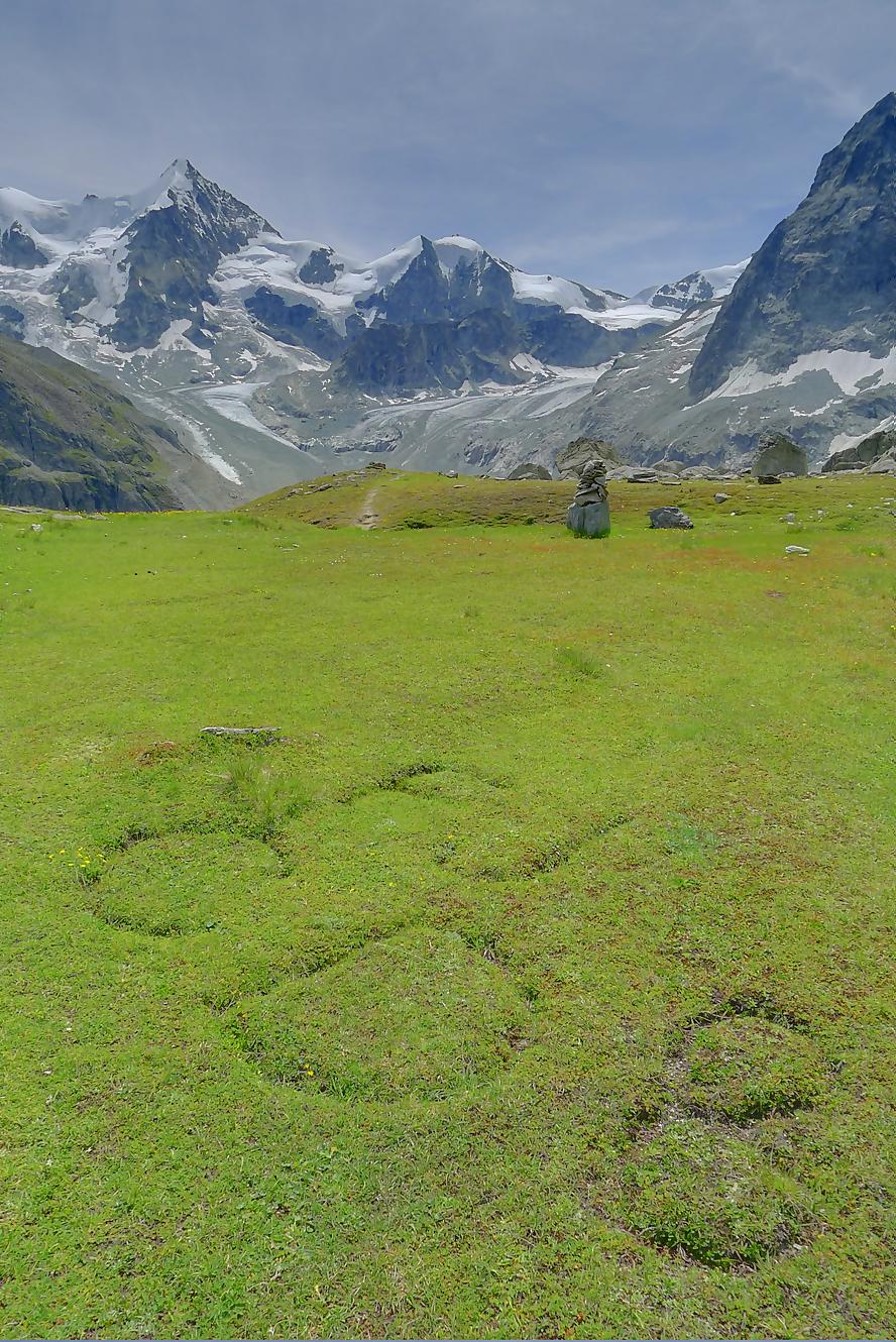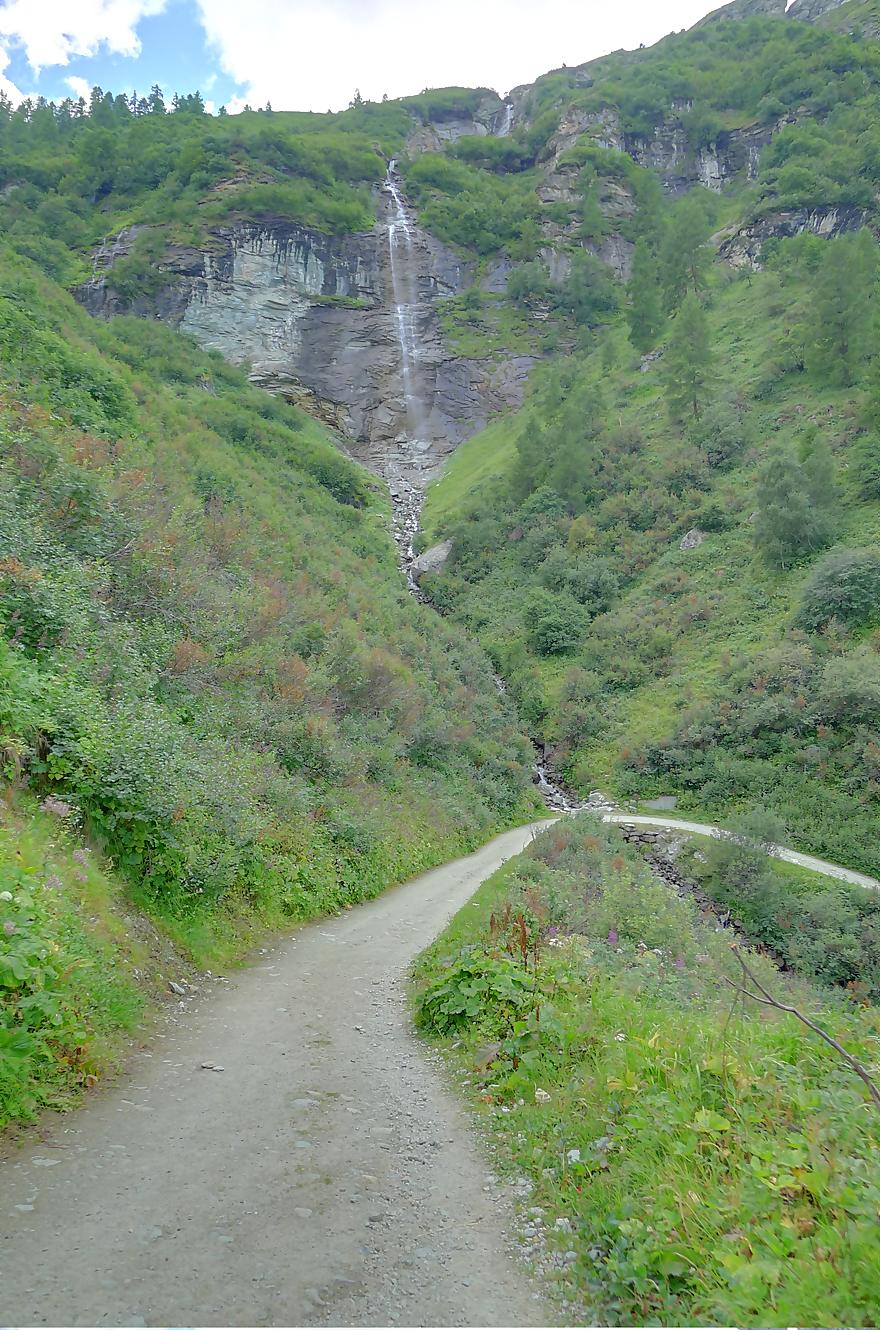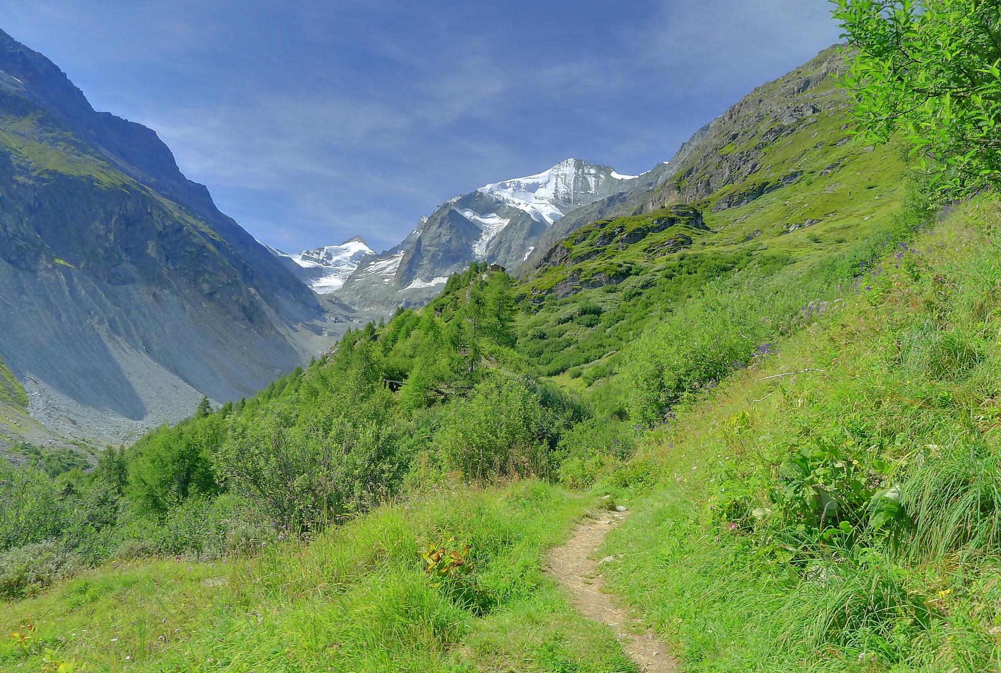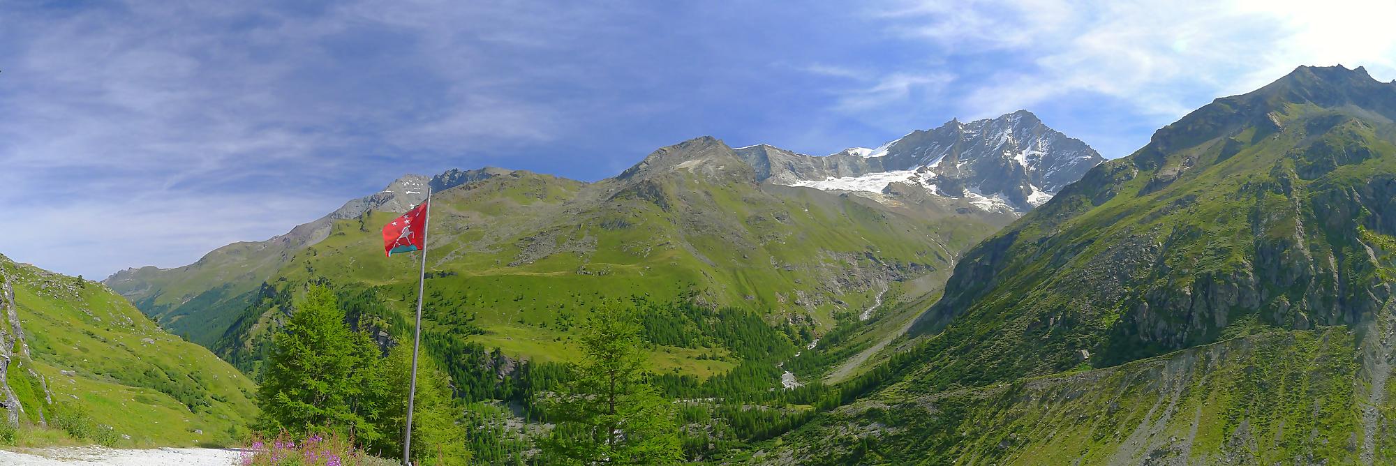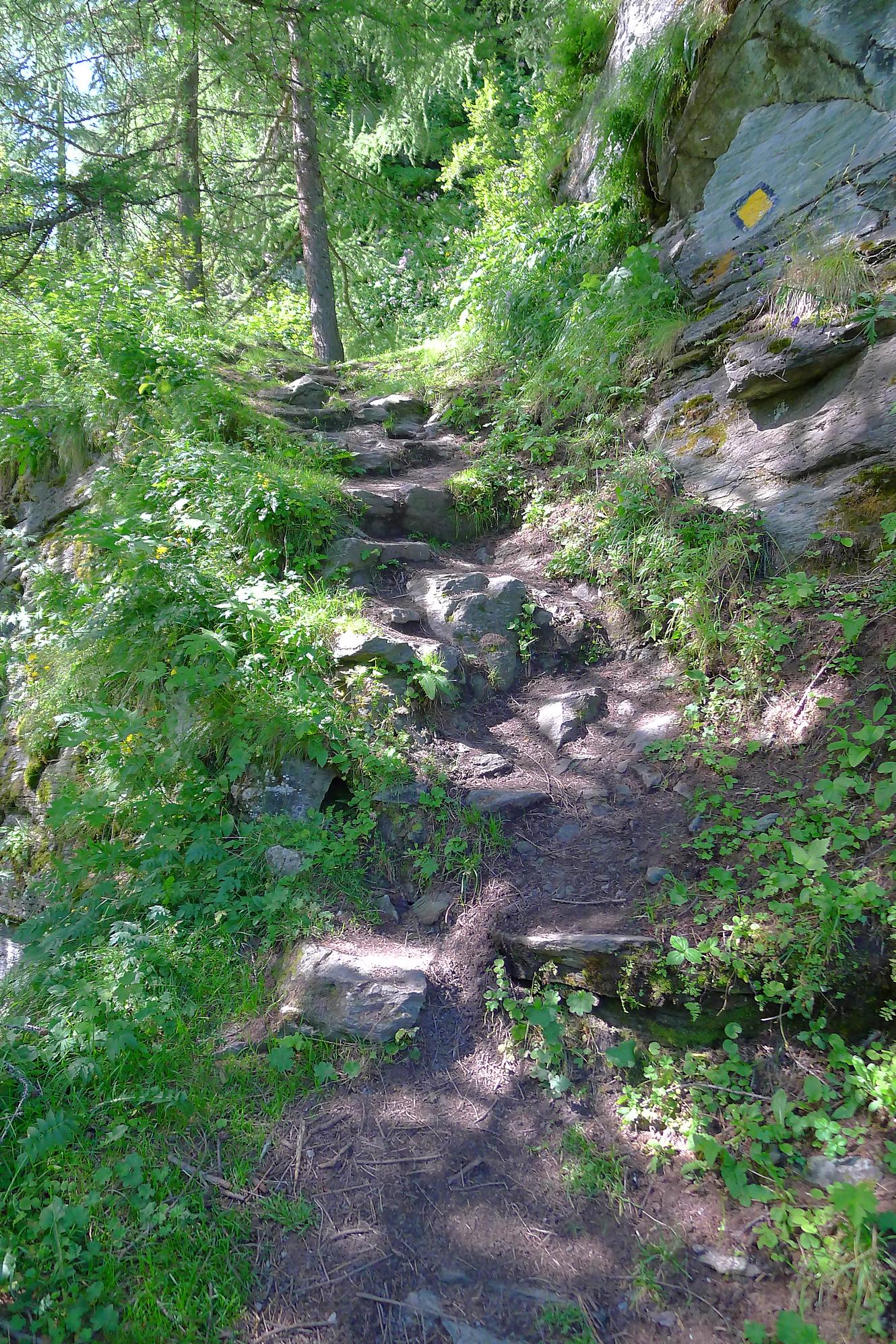 Peu après sur la droite, un panneau indique la direction des Anciennes Mines de Cuivres de La Lé, 15 min. J’avais vu l’indication sur la carte, mais elle n’est pas au programme du jour. Pour une visite, il faut s’inscrire à l’office du tourisme de Zinal. Un dépliant est disponible à la cabane du Petit Mountet. Après le lieu dit Le Vichiesso, une bifurcation propose deux chemins pour la cabane du Petit Mountet, 40 min pour la version courte en forêt, 1h pour une version dans les hauteurs, mais qui fait monter pour redescendre. Sachant que la journée sera longue je prends l’option 40 min.