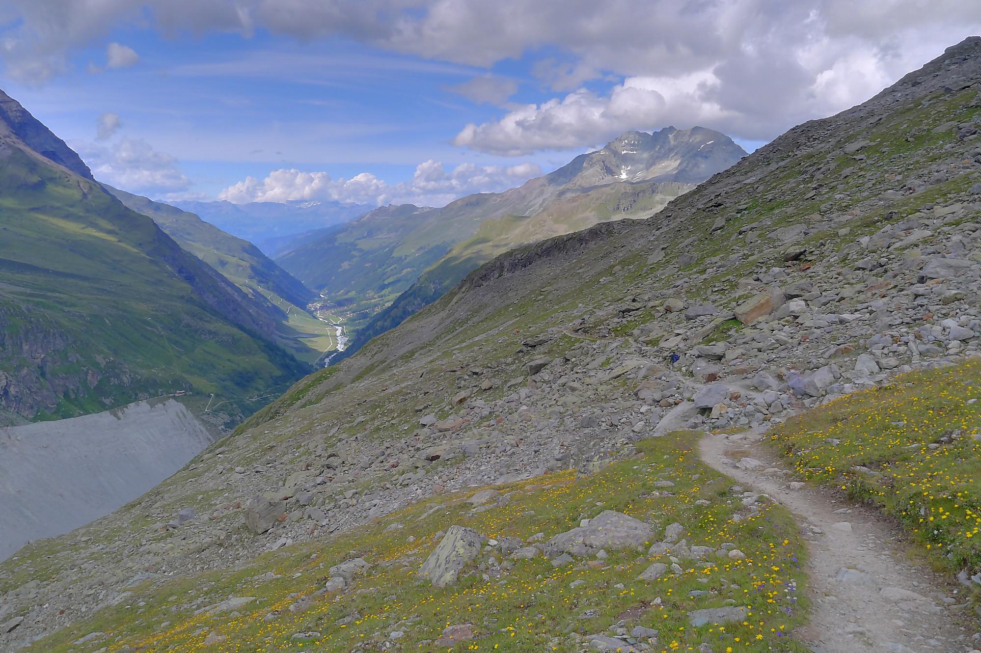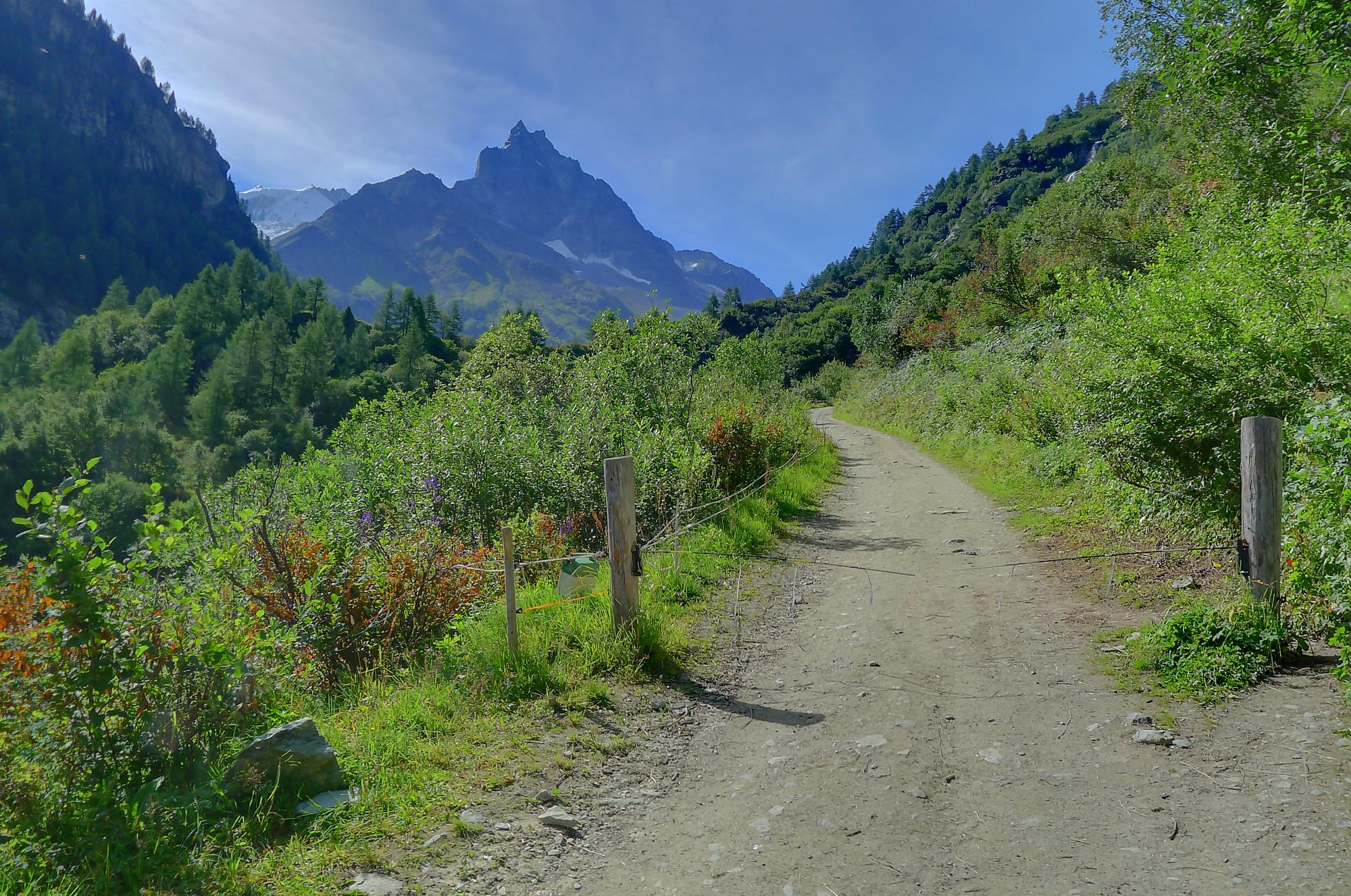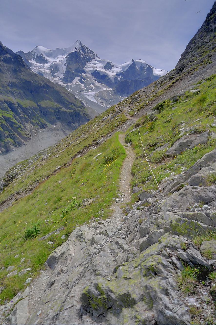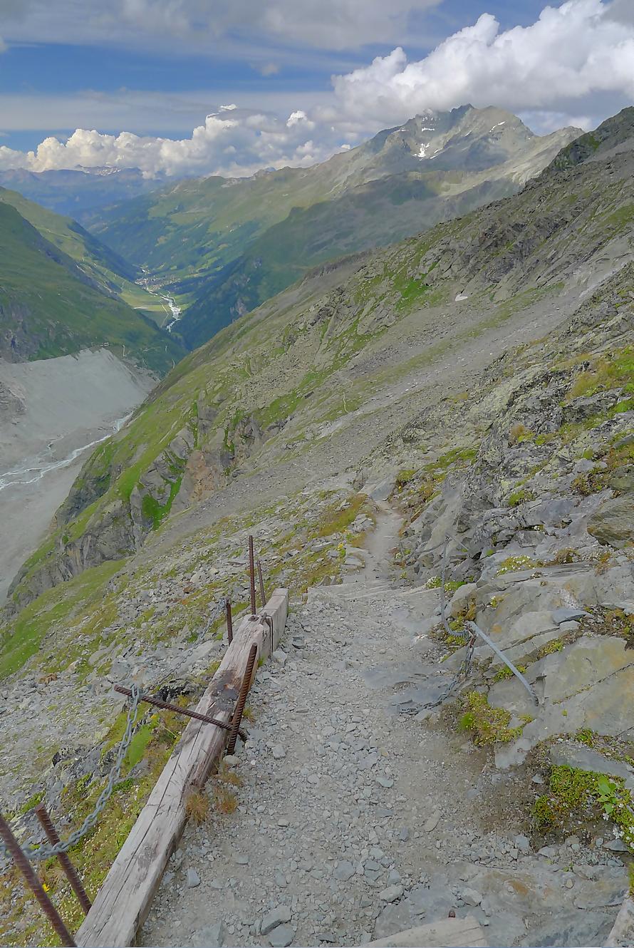 A 15h45, départ pour suivre le chemin normal, il faut environ 3h pour rejoindre Zinal. J’ai trouvé ce chemin (rive droite du Glacier de Zinal) plus agréable. Il y a des sections pentues, avec des câbles utiles aux touristes hollandais ou en cas de pluie, des bonnes séries de zigzag, mais il n’y a pas de section raides. Par contre que c’est long et interminable ! J’ai adopté un rythme plus tranquille, pensant à mes genoux avant qu’ils ne me rappellent à l’ordre.
