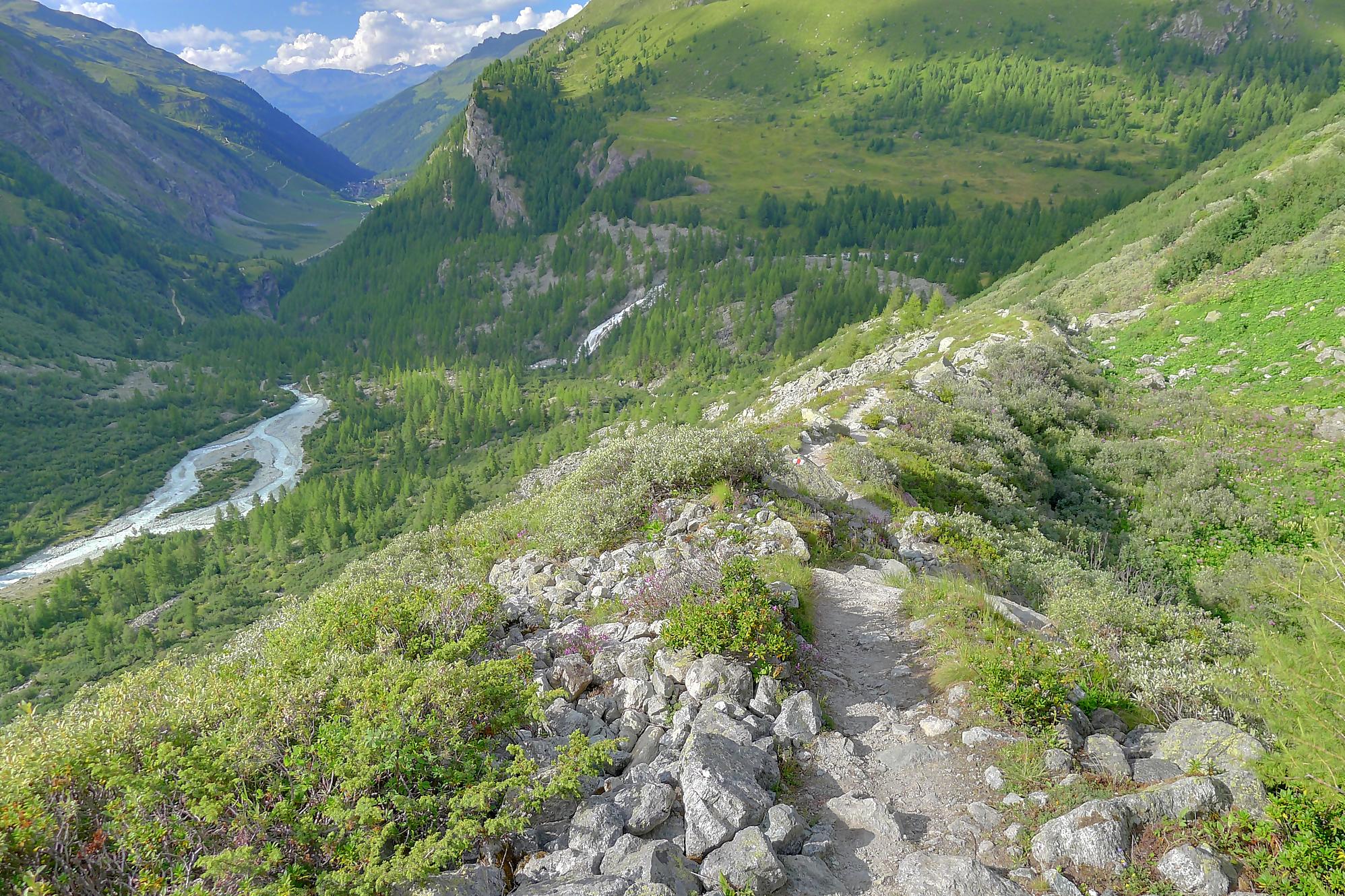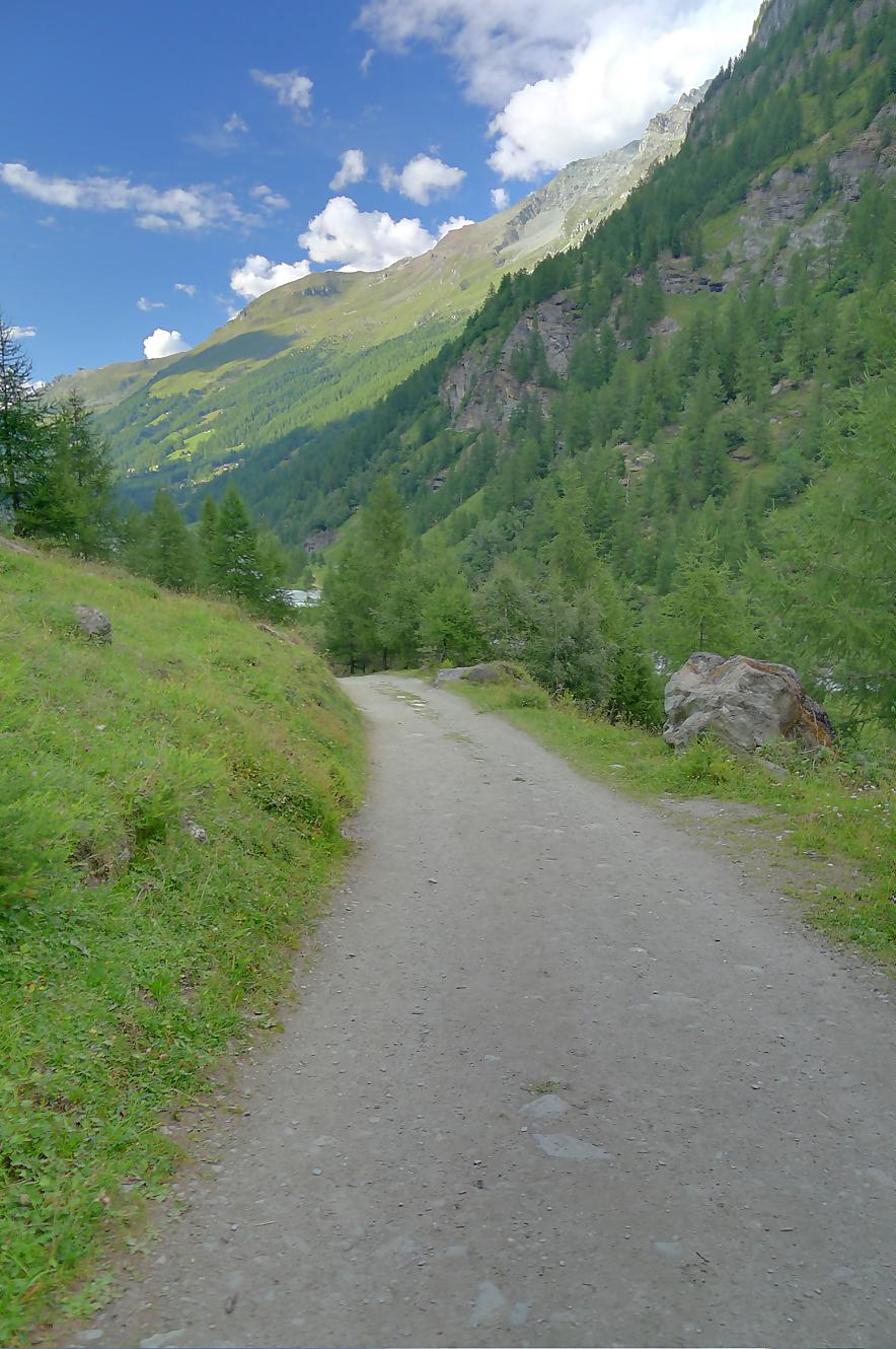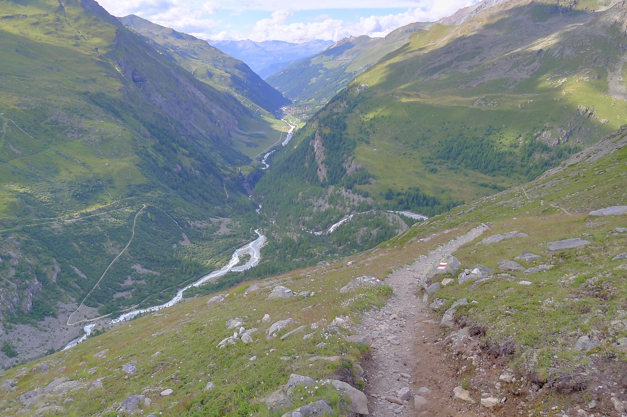 A 15h45, départ pour suivre le chemin normal, il faut environ 3h pour rejoindre Zinal. J’ai trouvé ce chemin (rive droite du Glacier de Zinal) plus agréable. Il y a des sections pentues, avec des câbles utiles aux touristes hollandais ou en cas de pluie, des bonnes séries de zigzag, mais il n’y a pas de section raides. Par contre que c’est long et interminable ! J’ai adopté un rythme plus tranquille, pensant à mes genoux avant qu’ils ne me rappellent à l’ordre.
