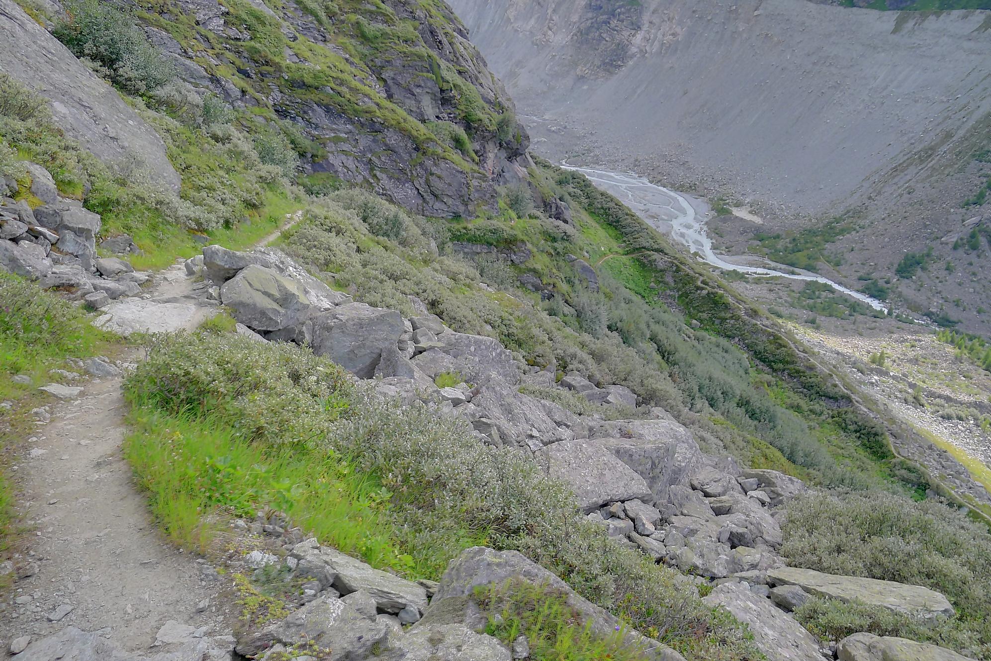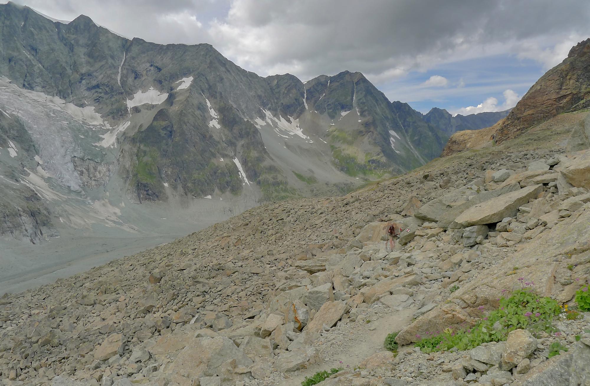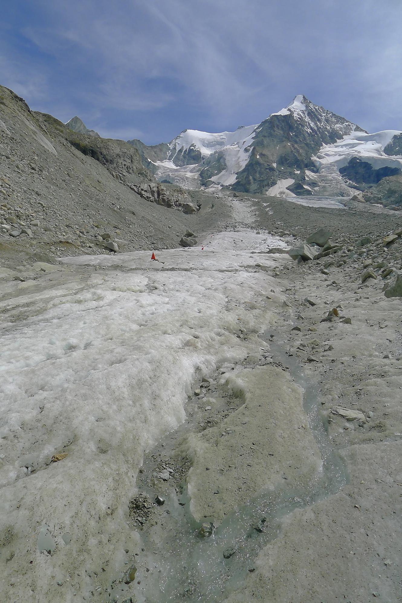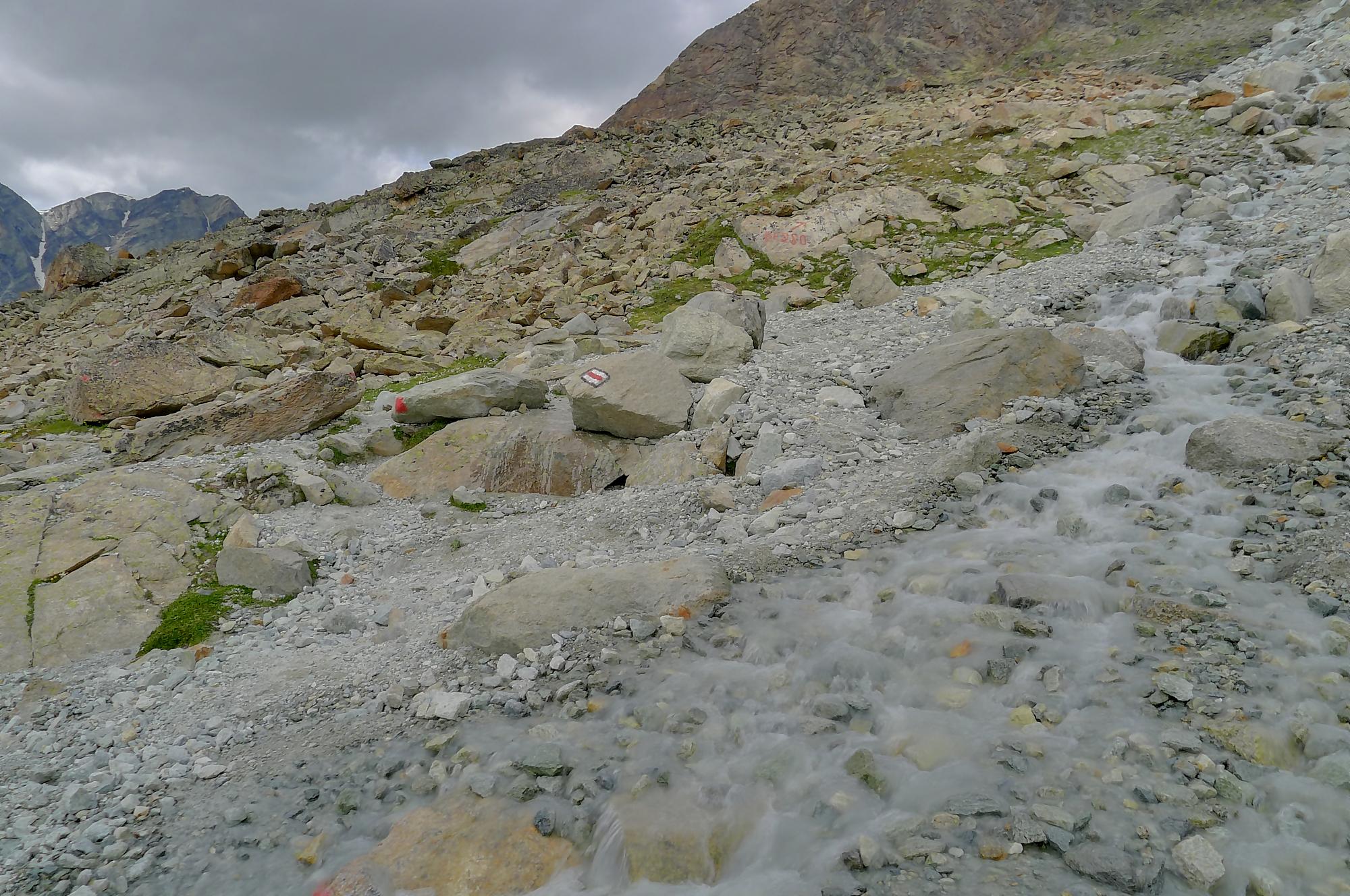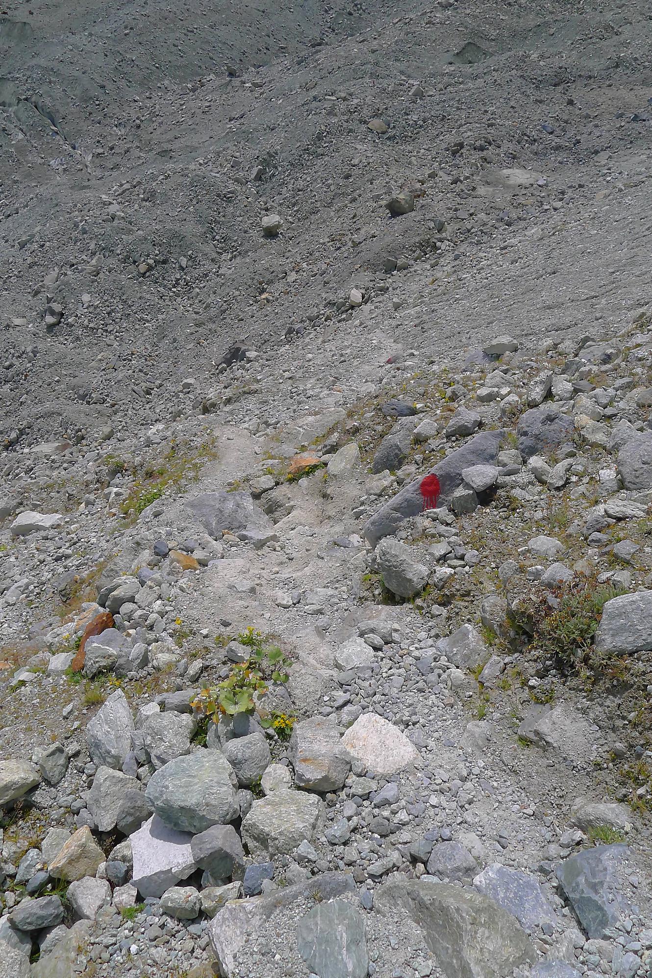 Le sentier reprend son tracé à flanc, puis sur une ancienne moraine. Là, le nouveau tracé fait descendre droit dans la pente de la moraine. Cette section n’est pas terrible, c’est pentu et gravilloneux. Les derniers mètres sont mêmes raides et offrant peu d’appuis, les bâtons furent donc appréciés. On arrive ainsi sur le glacier qu’on ne voit pas car complètement recouvert de pierres et roches. Il suffit de suivre les plots et marques rouges, il n’y a pas besoin de matériel spécifique. On progresse en sautant souvent de rochers en rochers. Je croise une famille dont le grand-père me dit qu’il a parcouru (forcément il y a longtemps) cette section tout en glace et c’était plus facile. On progresse brièvement sur la glace, facilement car des gravillons permettent une belle accroche.