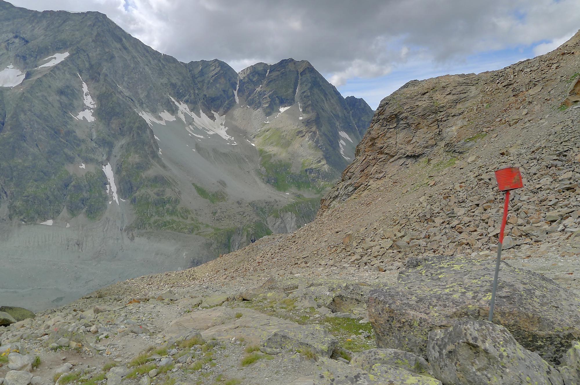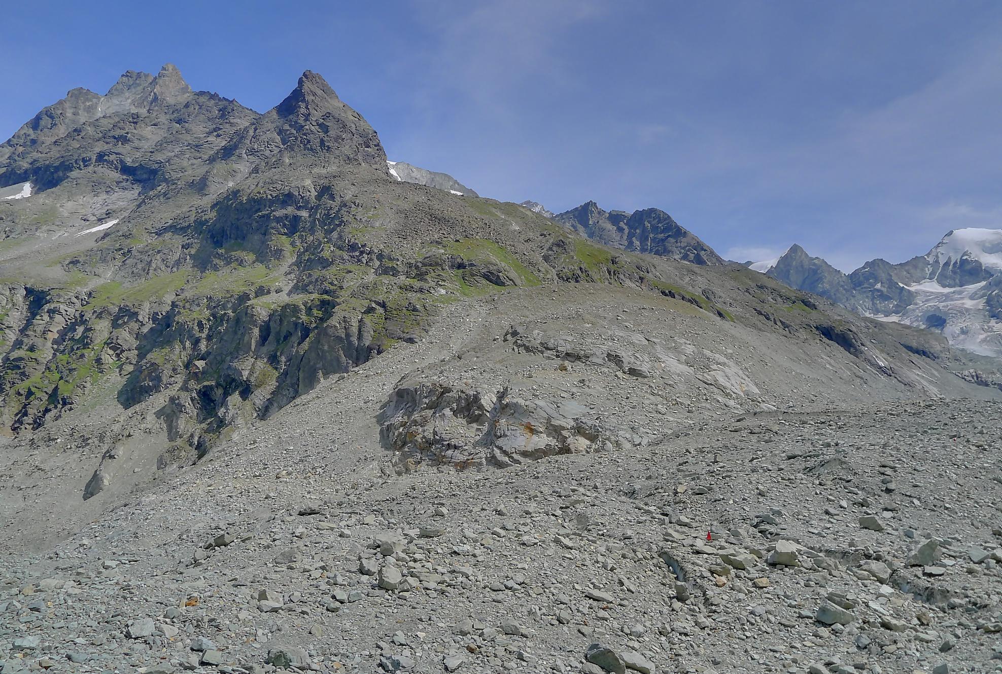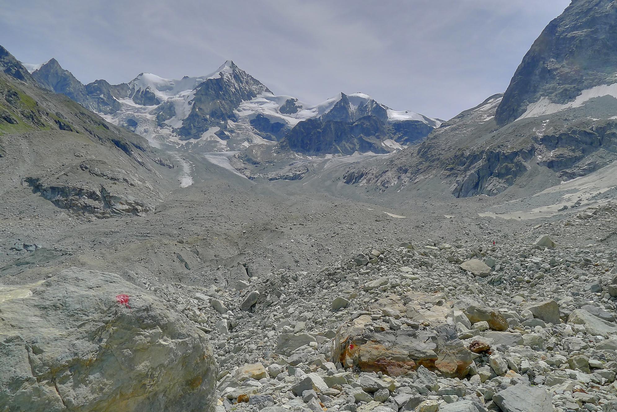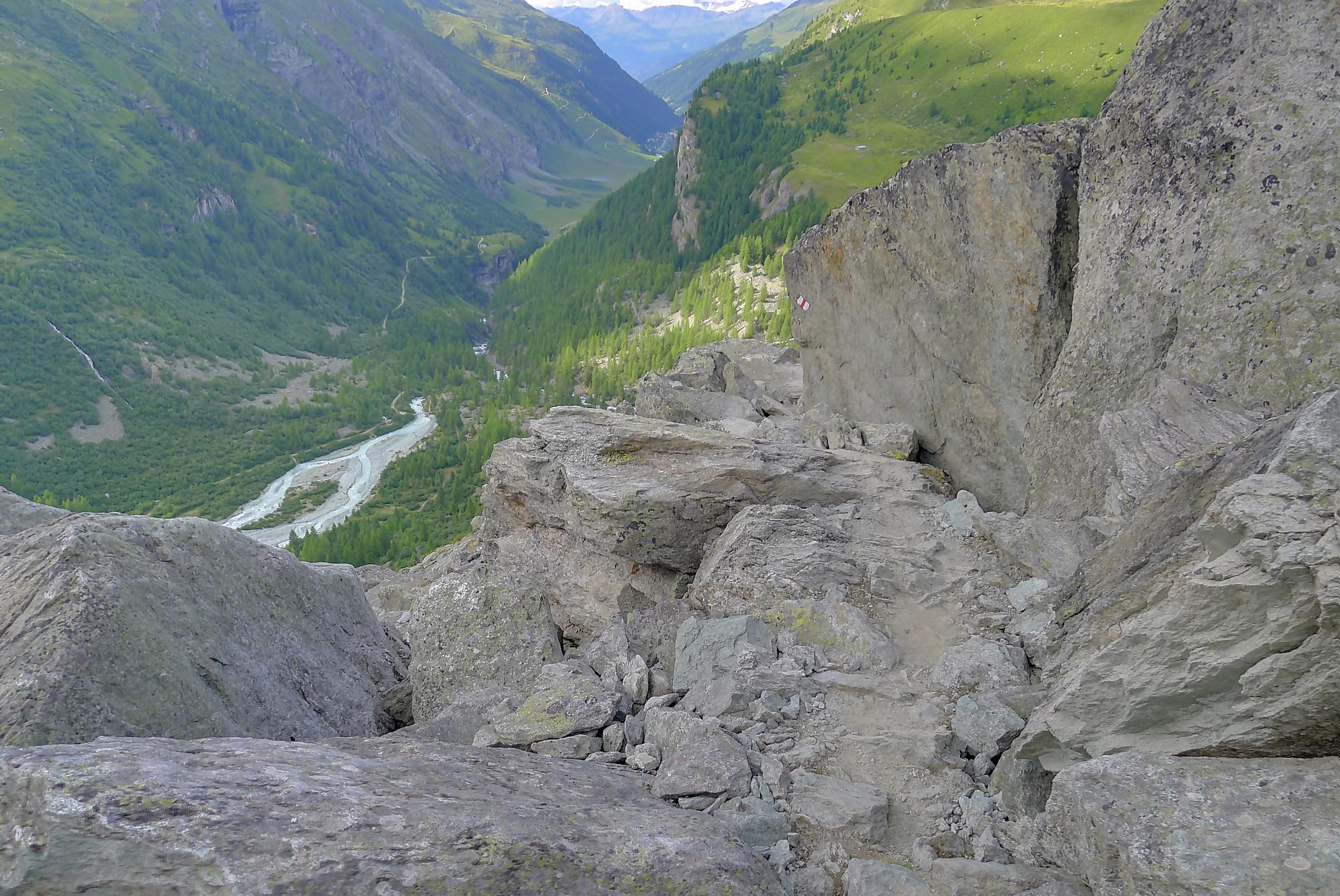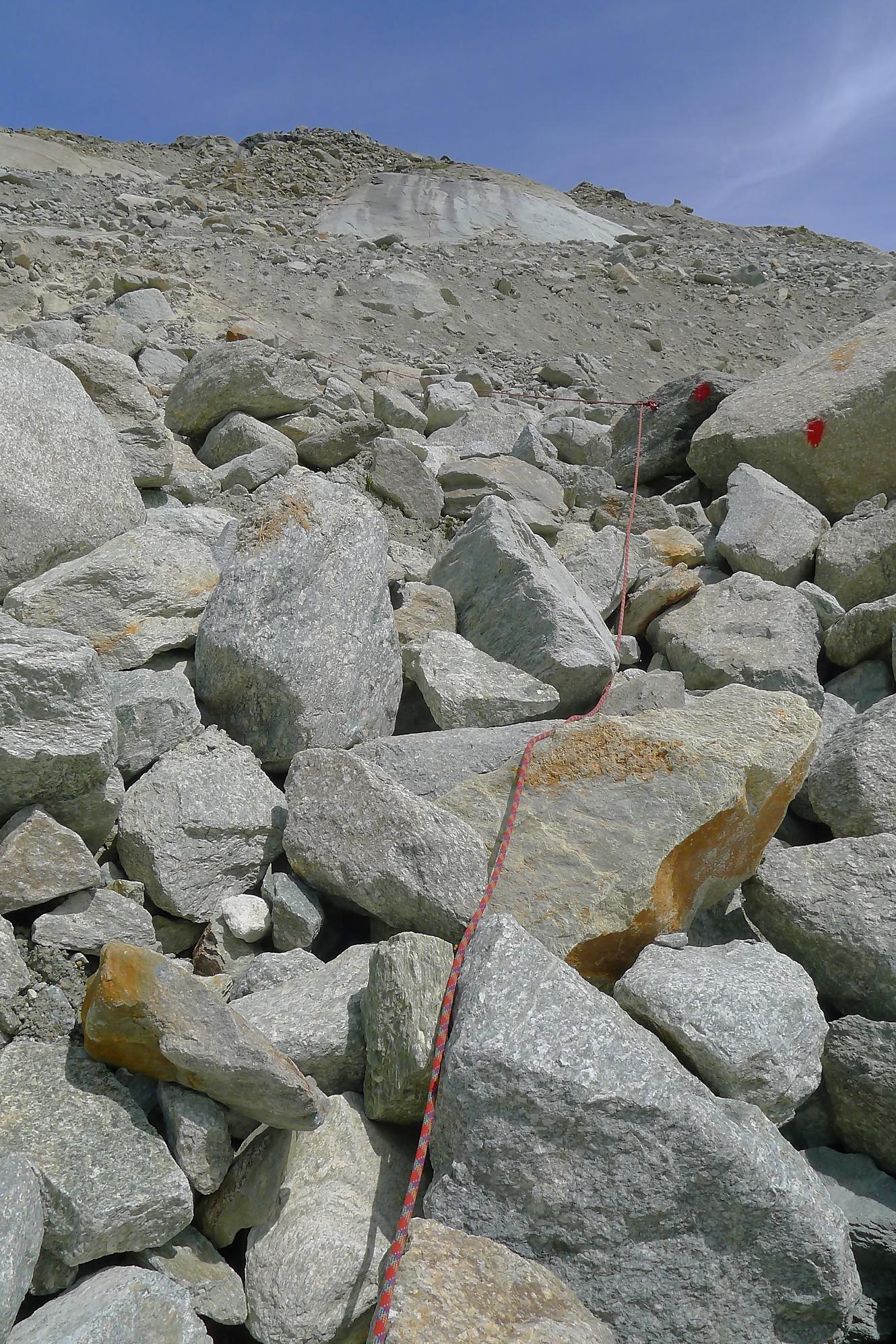 Le sentier reprend son tracé à flanc, puis sur une ancienne moraine. Là, le nouveau tracé fait descendre droit dans la pente de la moraine. Cette section n’est pas terrible, c’est pentu et gravilloneux. Les derniers mètres sont mêmes raides et offrant peu d’appuis, les bâtons furent donc appréciés. On arrive ainsi sur le glacier qu’on ne voit pas car complètement recouvert de pierres et roches. Il suffit de suivre les plots et marques rouges, il n’y a pas besoin de matériel spécifique. On progresse en sautant souvent de rochers en rochers. Je croise une famille dont le grand-père me dit qu’il a parcouru (forcément il y a longtemps) cette section tout en glace et c’était plus facile. On progresse brièvement sur la glace, facilement car des gravillons permettent une belle accroche.