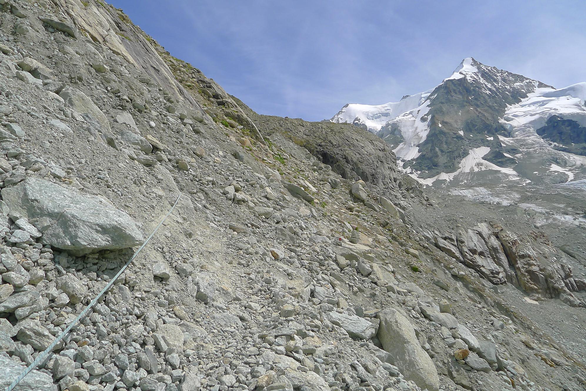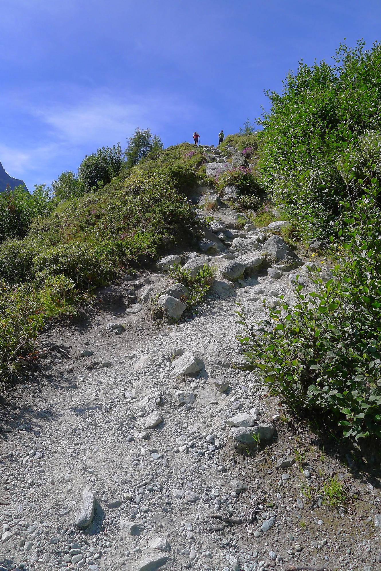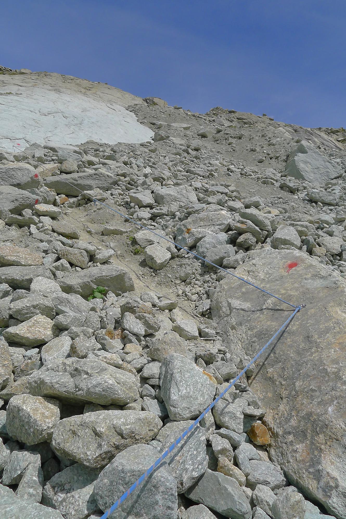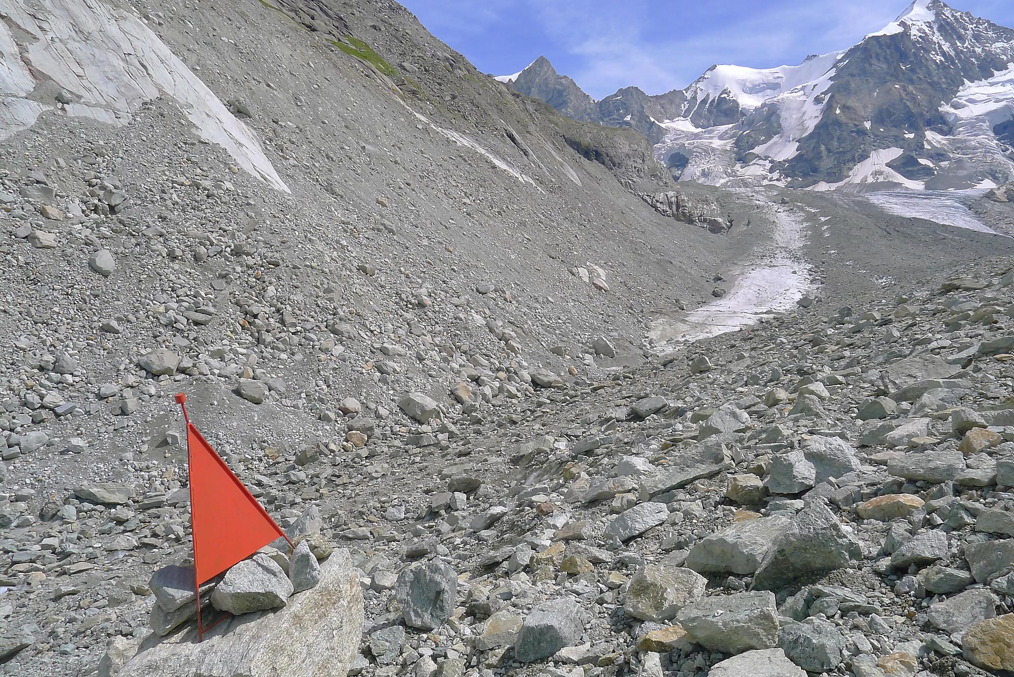 Le sentier reprend son tracé à flanc, puis sur une ancienne moraine. Là, le nouveau tracé fait descendre droit dans la pente de la moraine. Cette section n’est pas terrible, c’est pentu et gravilloneux. Les derniers mètres sont mêmes raides et offrant peu d’appuis, les bâtons furent donc appréciés. On arrive ainsi sur le glacier qu’on ne voit pas car complètement recouvert de pierres et roches. Il suffit de suivre les plots et marques rouges, il n’y a pas besoin de matériel spécifique. On progresse en sautant souvent de rochers en rochers. Je croise une famille dont le grand-père me dit qu’il a parcouru (forcément il y a longtemps) cette section tout en glace et c’était plus facile. On progresse brièvement sur la glace, facilement car des gravillons permettent une belle accroche.