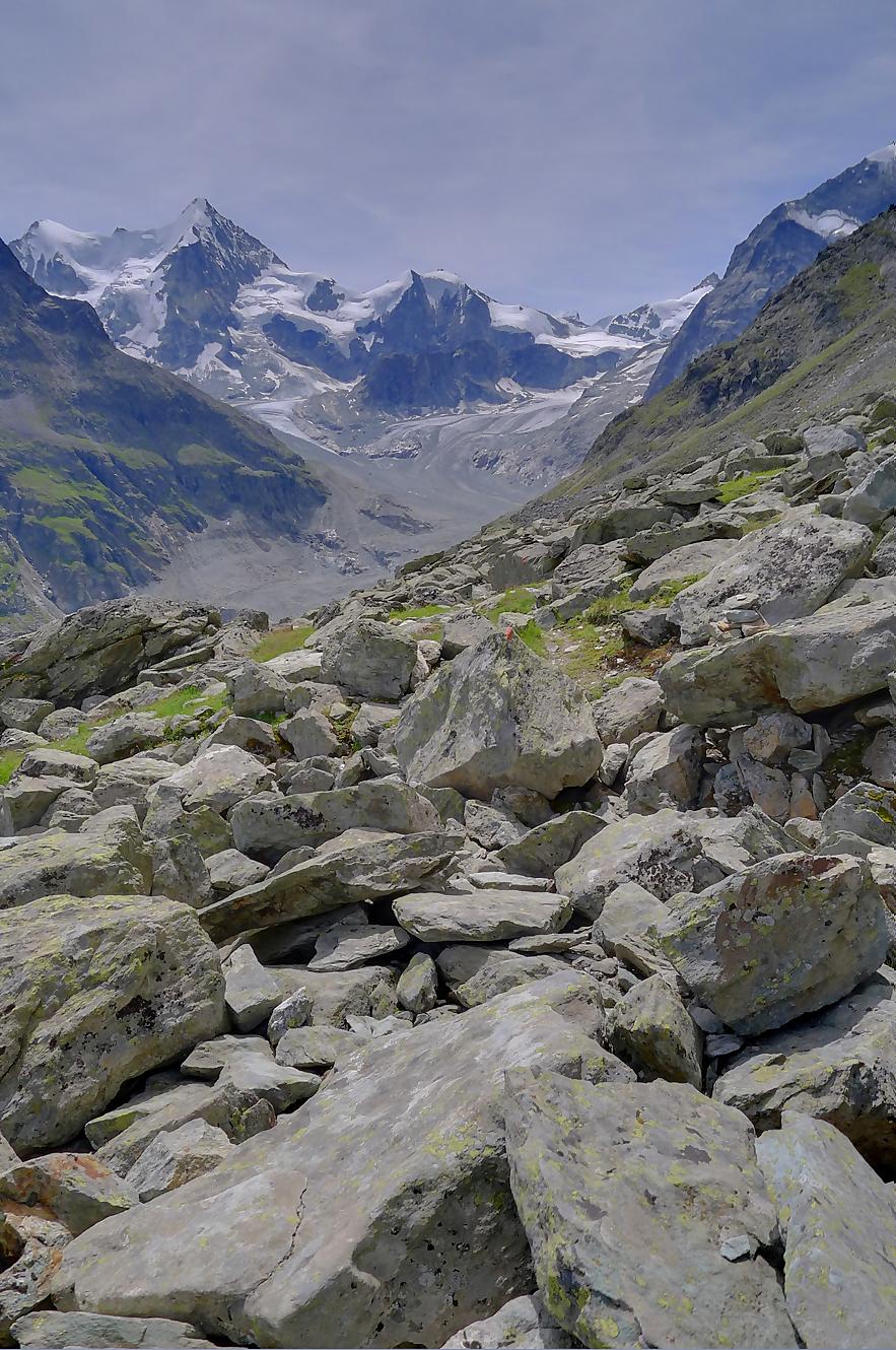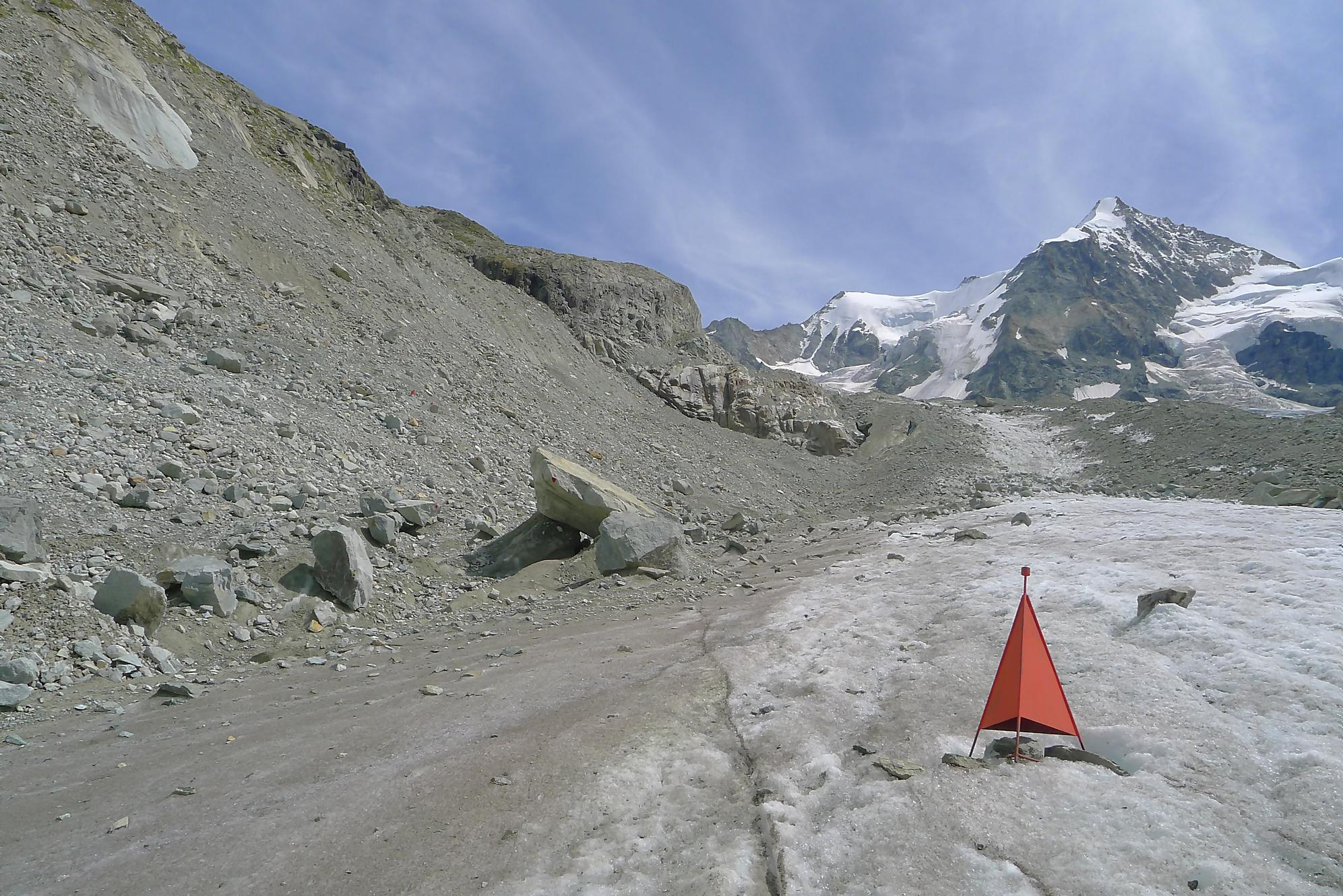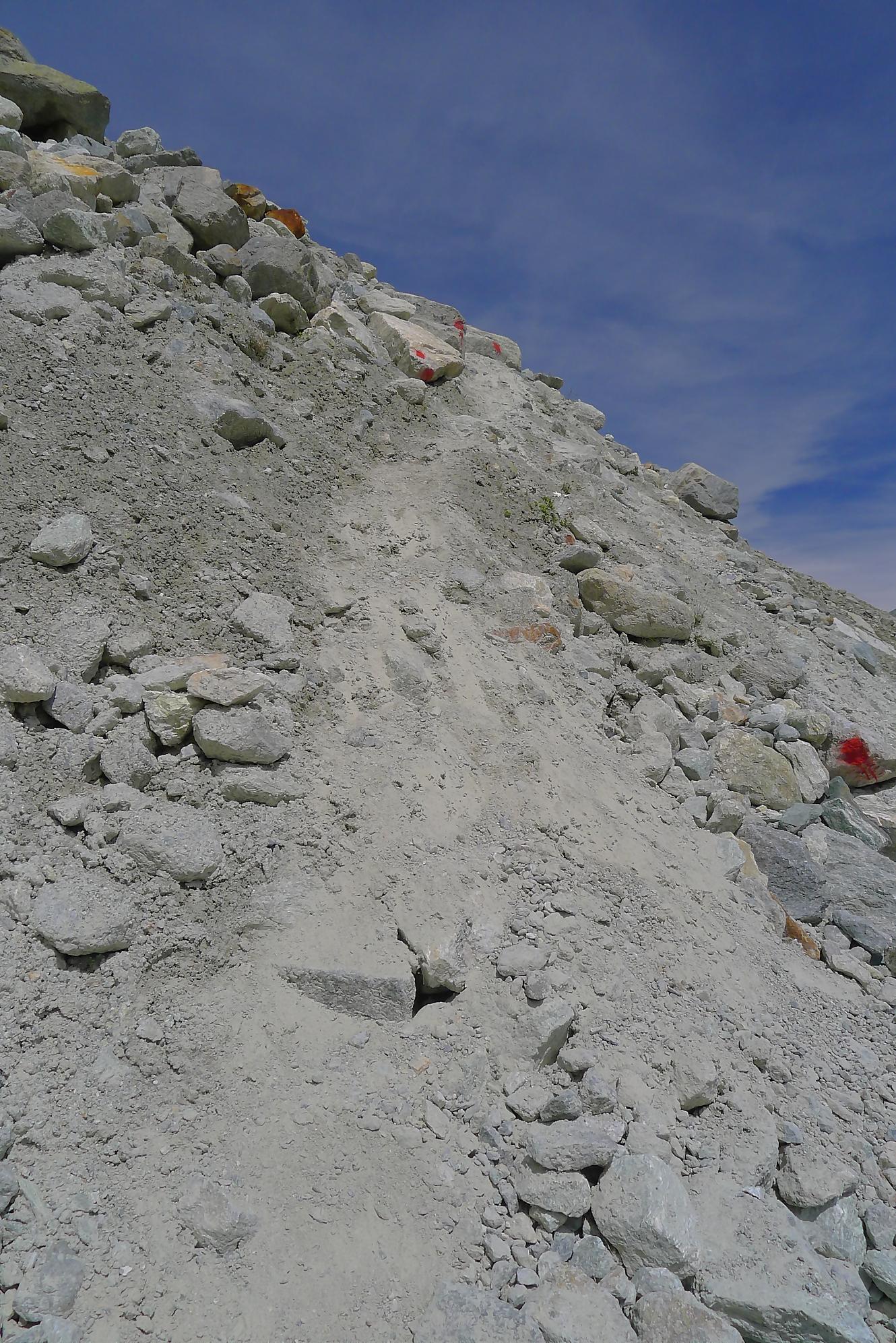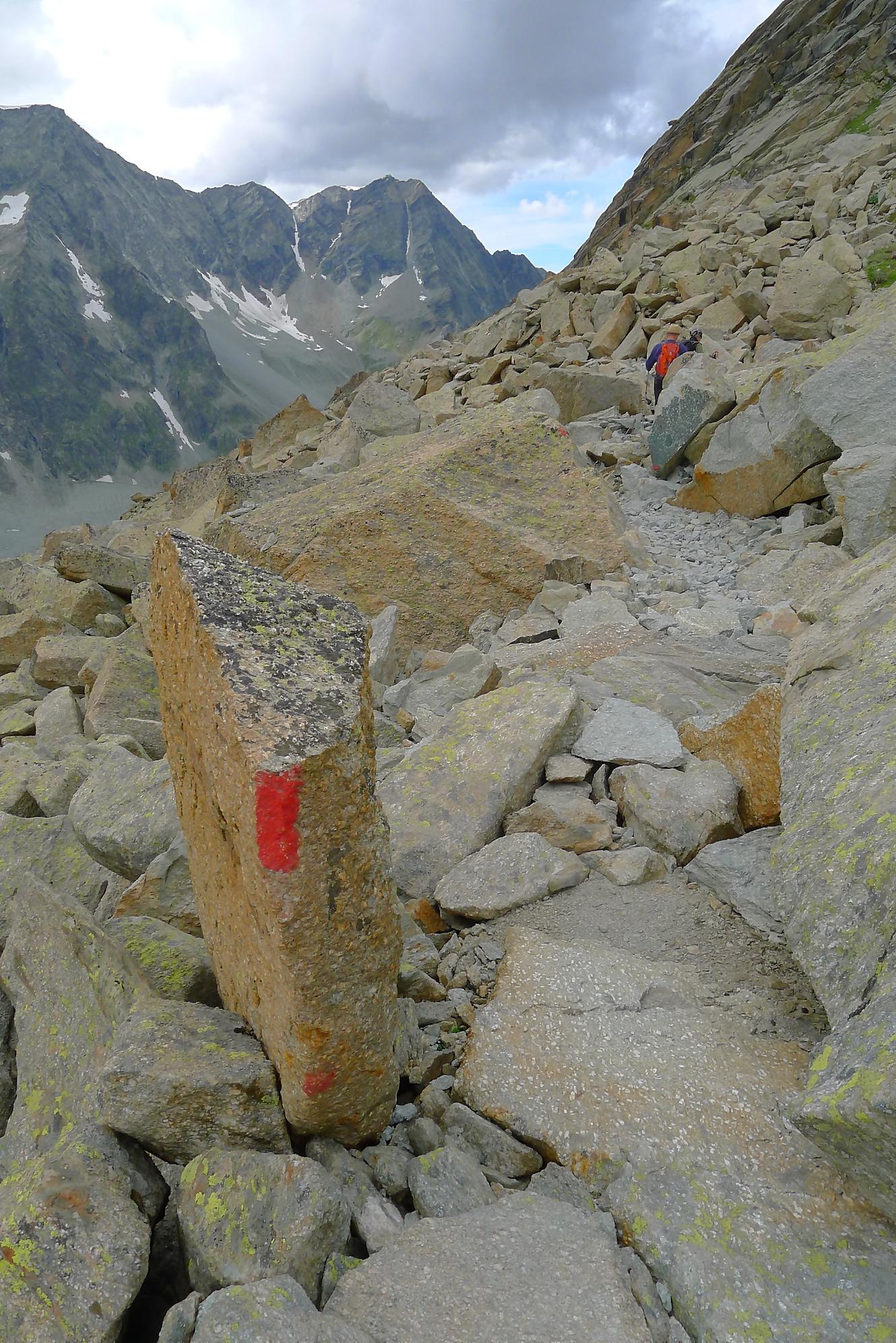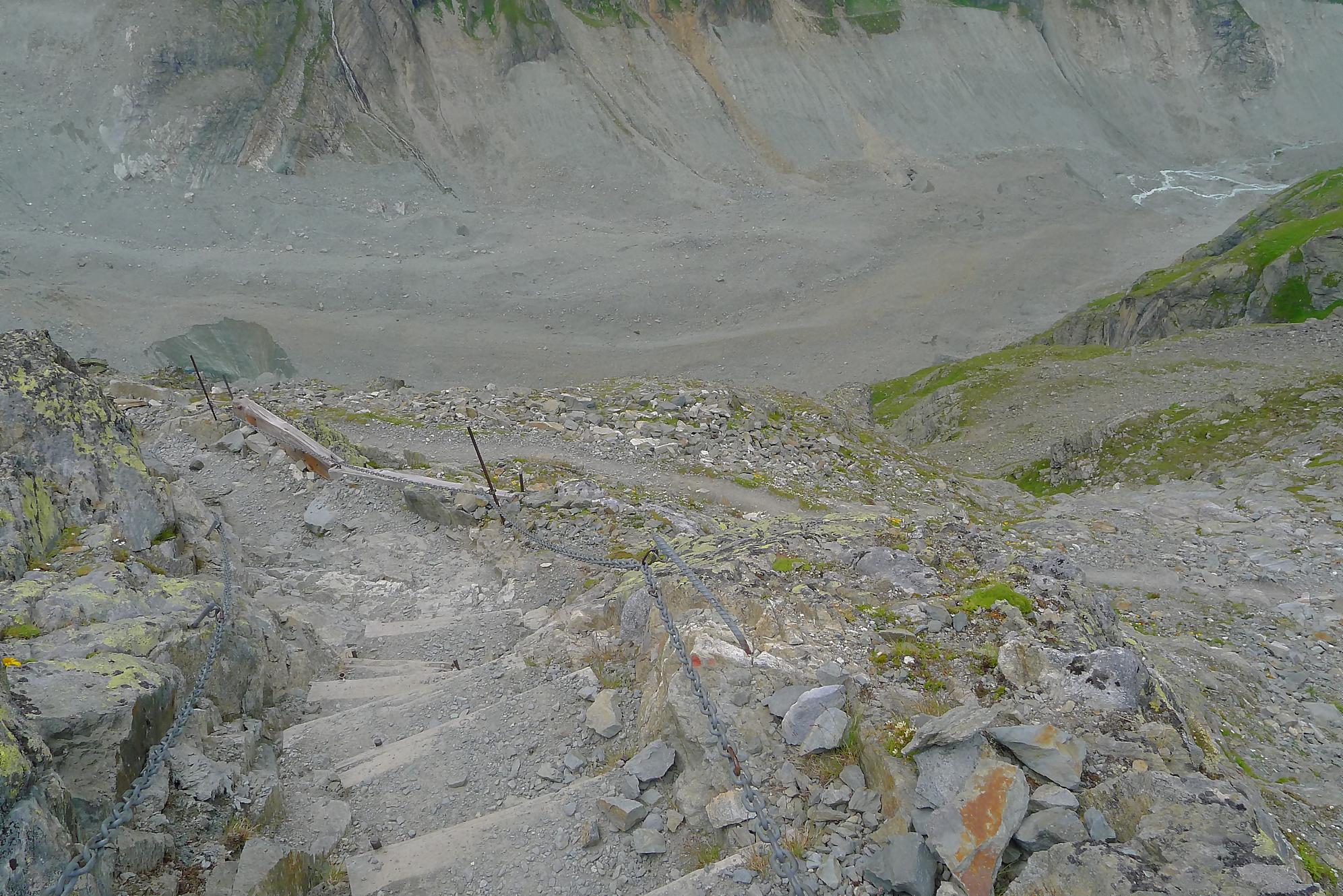 Le sentier reprend son tracé à flanc, puis sur une ancienne moraine. Là, le nouveau tracé fait descendre droit dans la pente de la moraine. Cette section n’est pas terrible, c’est pentu et gravilloneux. Les derniers mètres sont mêmes raides et offrant peu d’appuis, les bâtons furent donc appréciés. On arrive ainsi sur le glacier qu’on ne voit pas car complètement recouvert de pierres et roches. Il suffit de suivre les plots et marques rouges, il n’y a pas besoin de matériel spécifique. On progresse en sautant souvent de rochers en rochers. Je croise une famille dont le grand-père me dit qu’il a parcouru (forcément il y a longtemps) cette section tout en glace et c’était plus facile. On progresse brièvement sur la glace, facilement car des gravillons permettent une belle accroche.