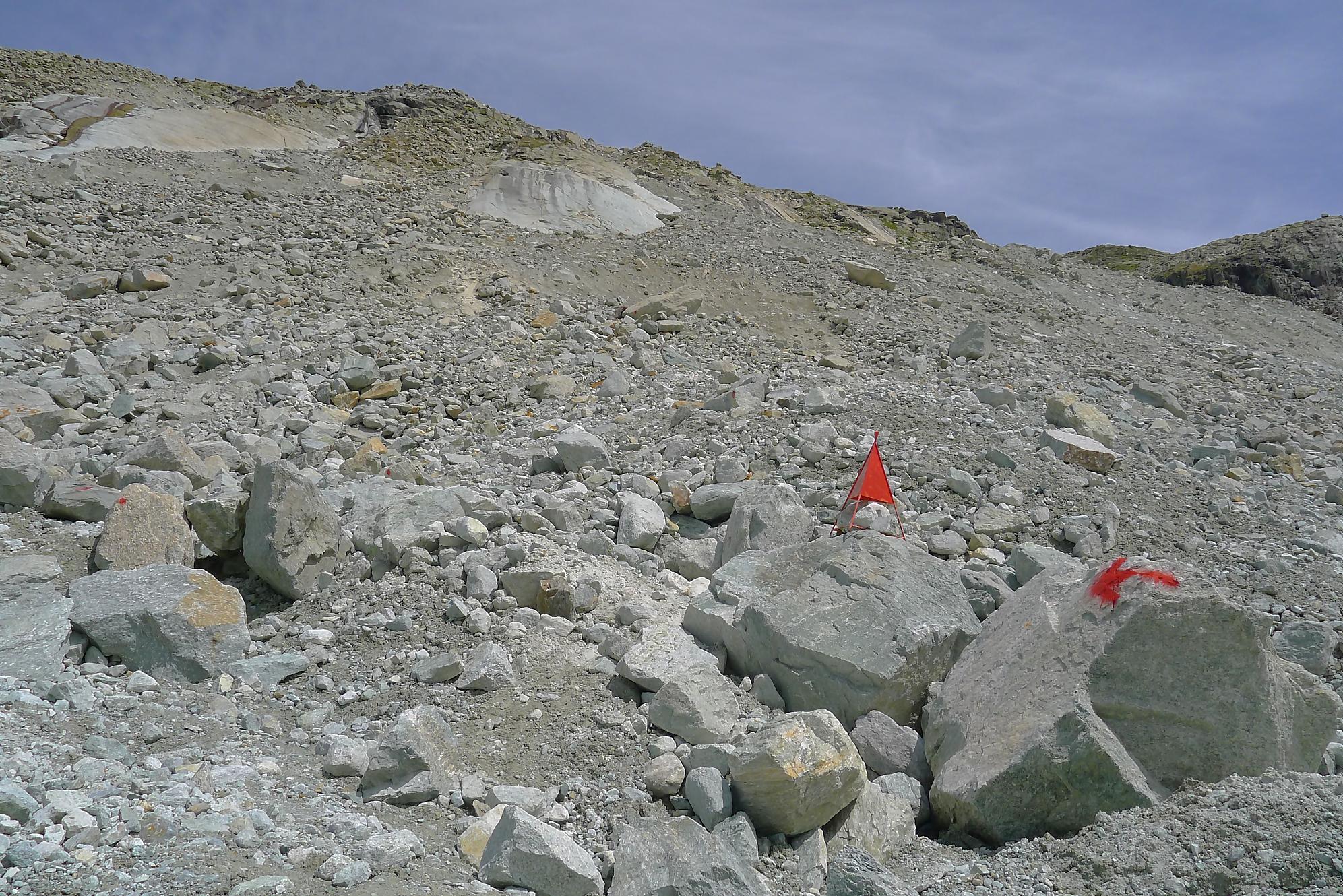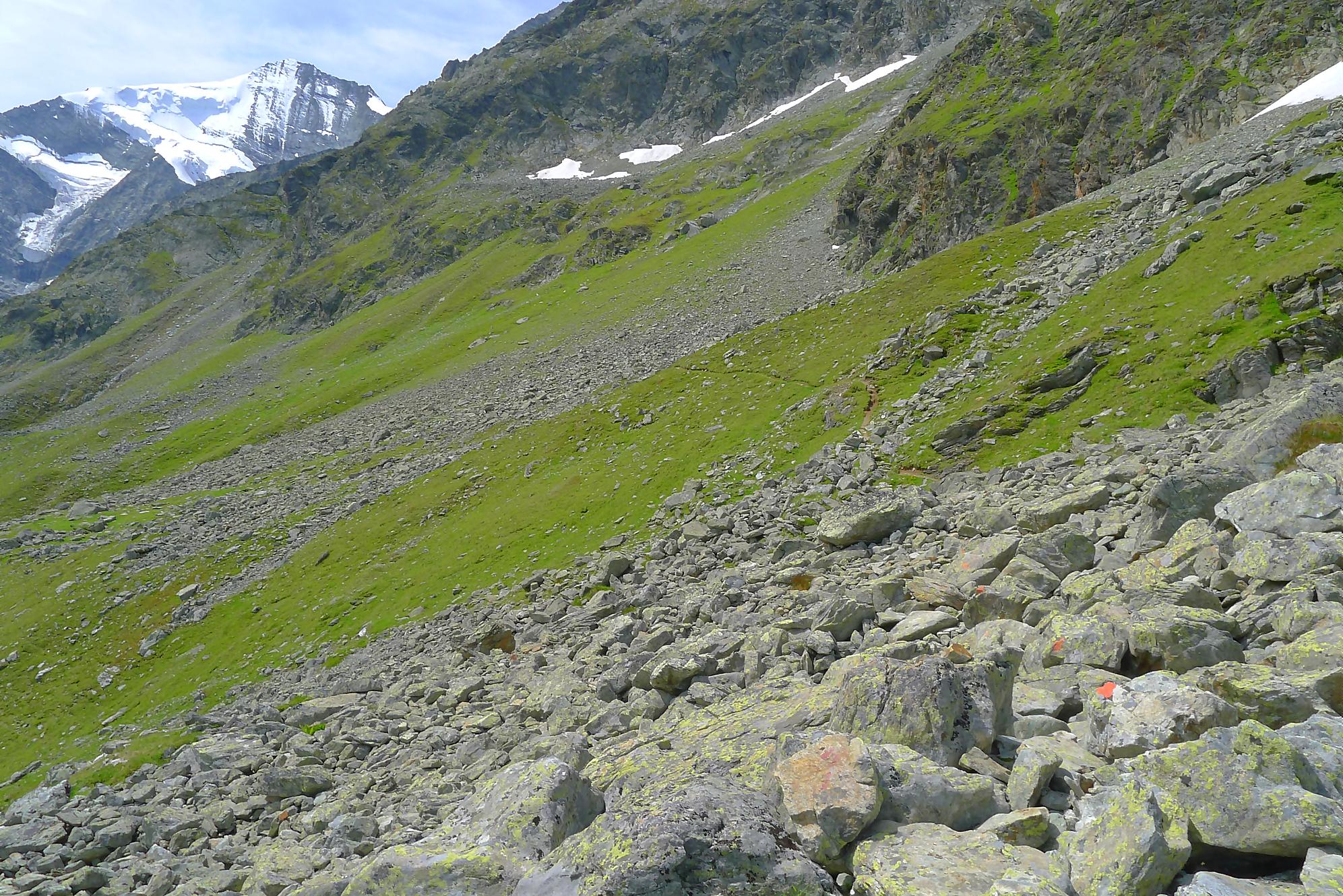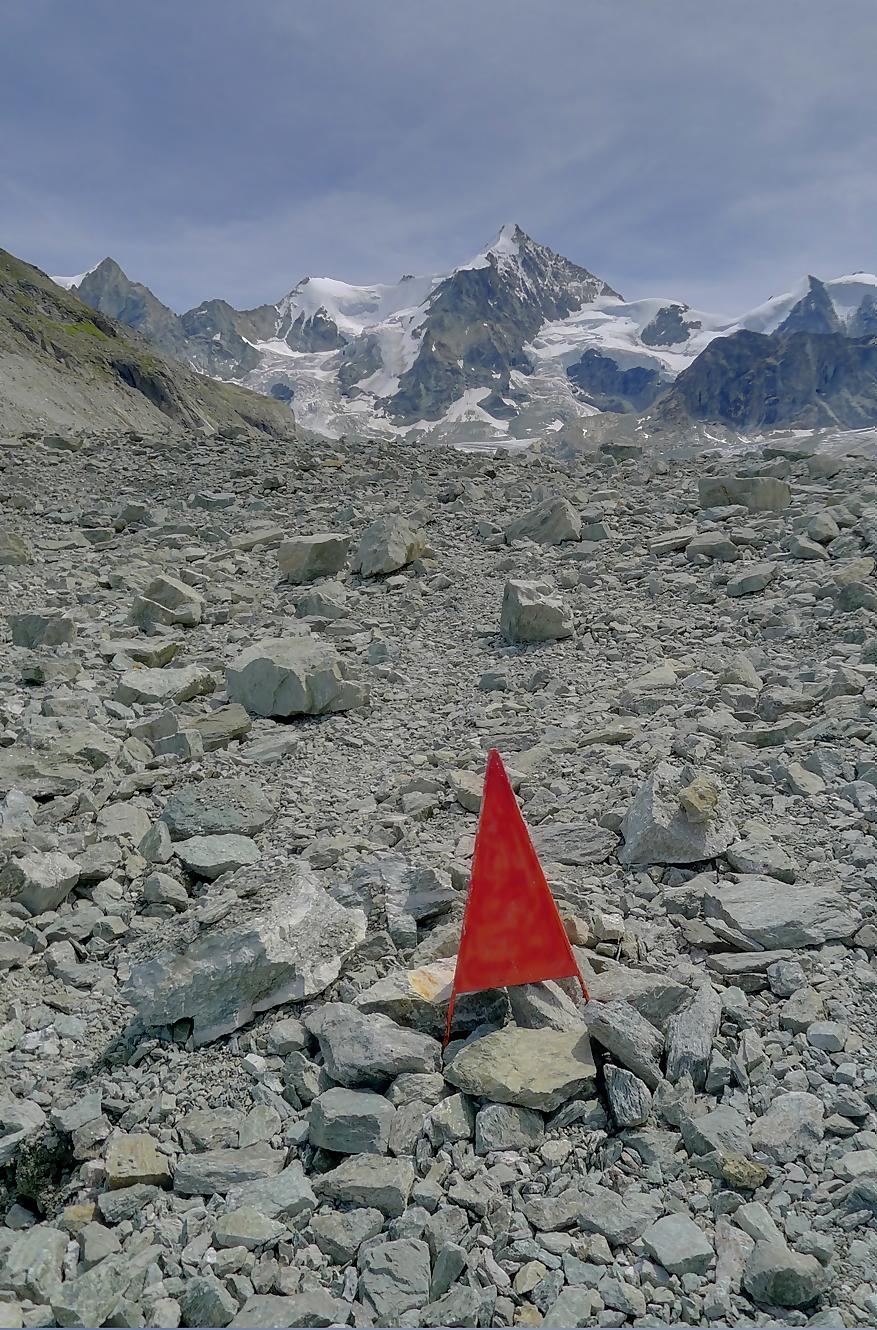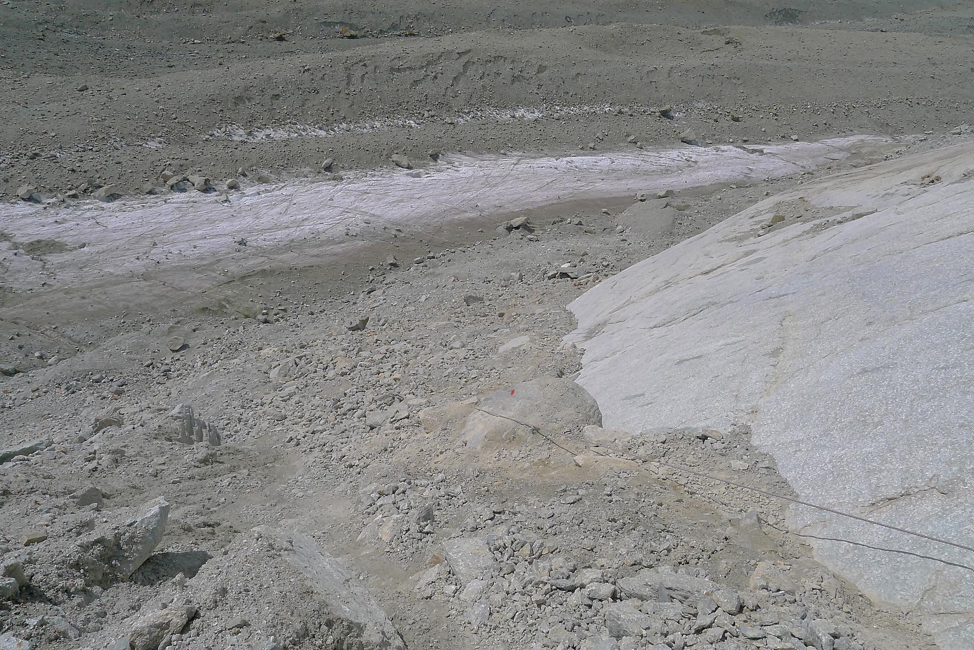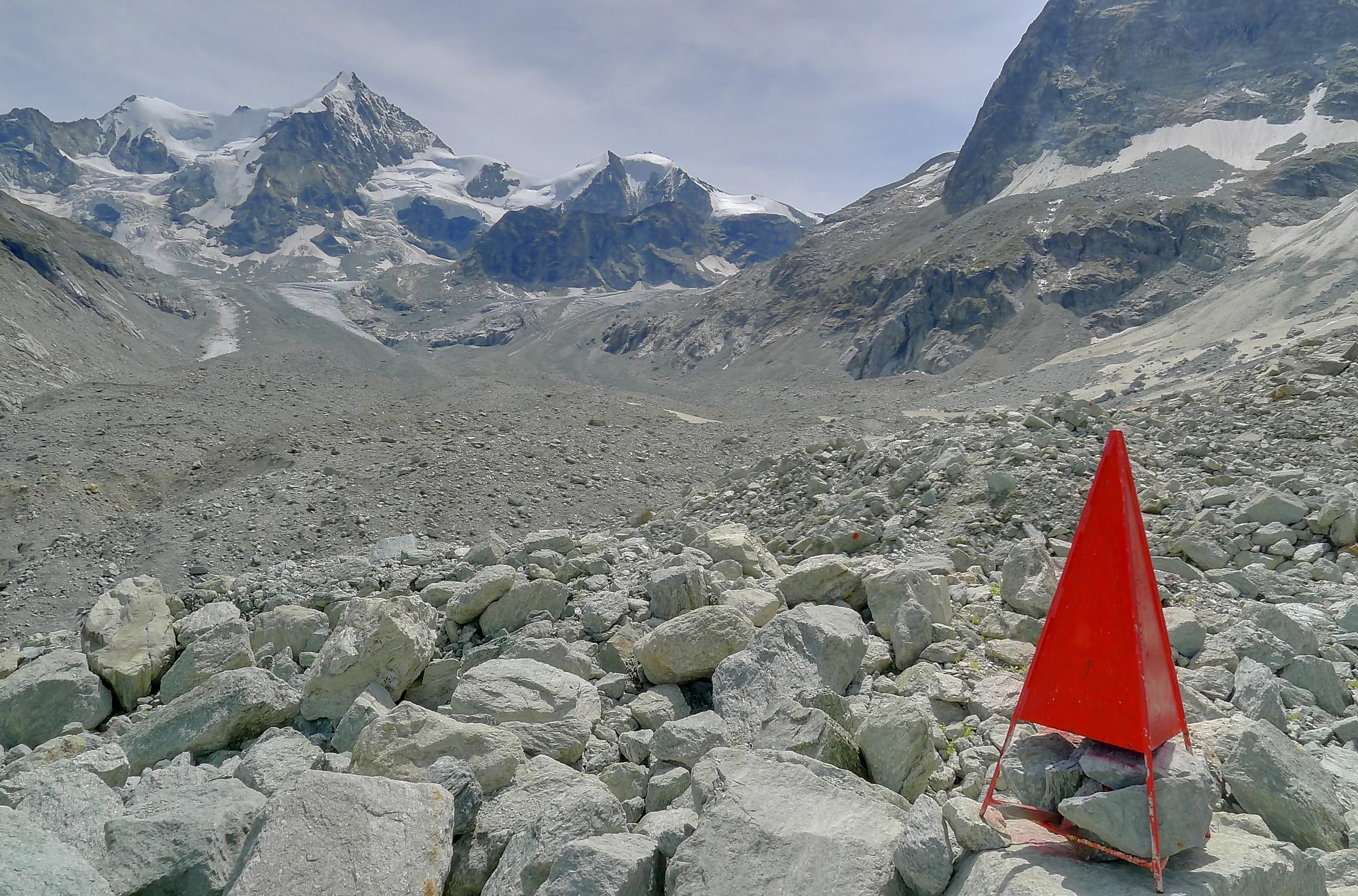 Le sentier reprend son tracé à flanc, puis sur une ancienne moraine. Là, le nouveau tracé fait descendre droit dans la pente de la moraine. Cette section n’est pas terrible, c’est pentu et gravilloneux. Les derniers mètres sont mêmes raides et offrant peu d’appuis, les bâtons furent donc appréciés. On arrive ainsi sur le glacier qu’on ne voit pas car complètement recouvert de pierres et roches. Il suffit de suivre les plots et marques rouges, il n’y a pas besoin de matériel spécifique. On progresse en sautant souvent de rochers en rochers. Je croise une famille dont le grand-père me dit qu’il a parcouru (forcément il y a longtemps) cette section tout en glace et c’était plus facile. On progresse brièvement sur la glace, facilement car des gravillons permettent une belle accroche.