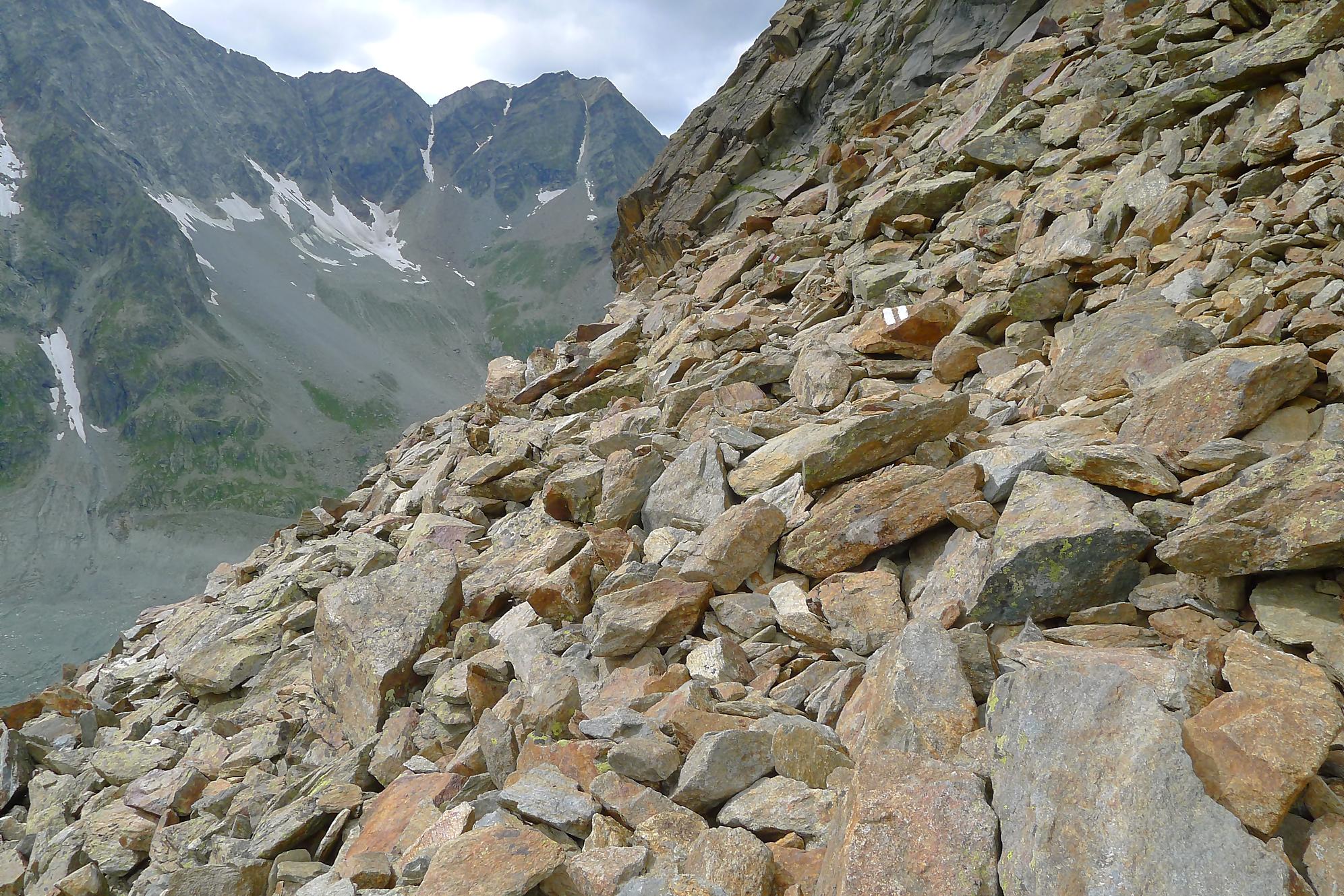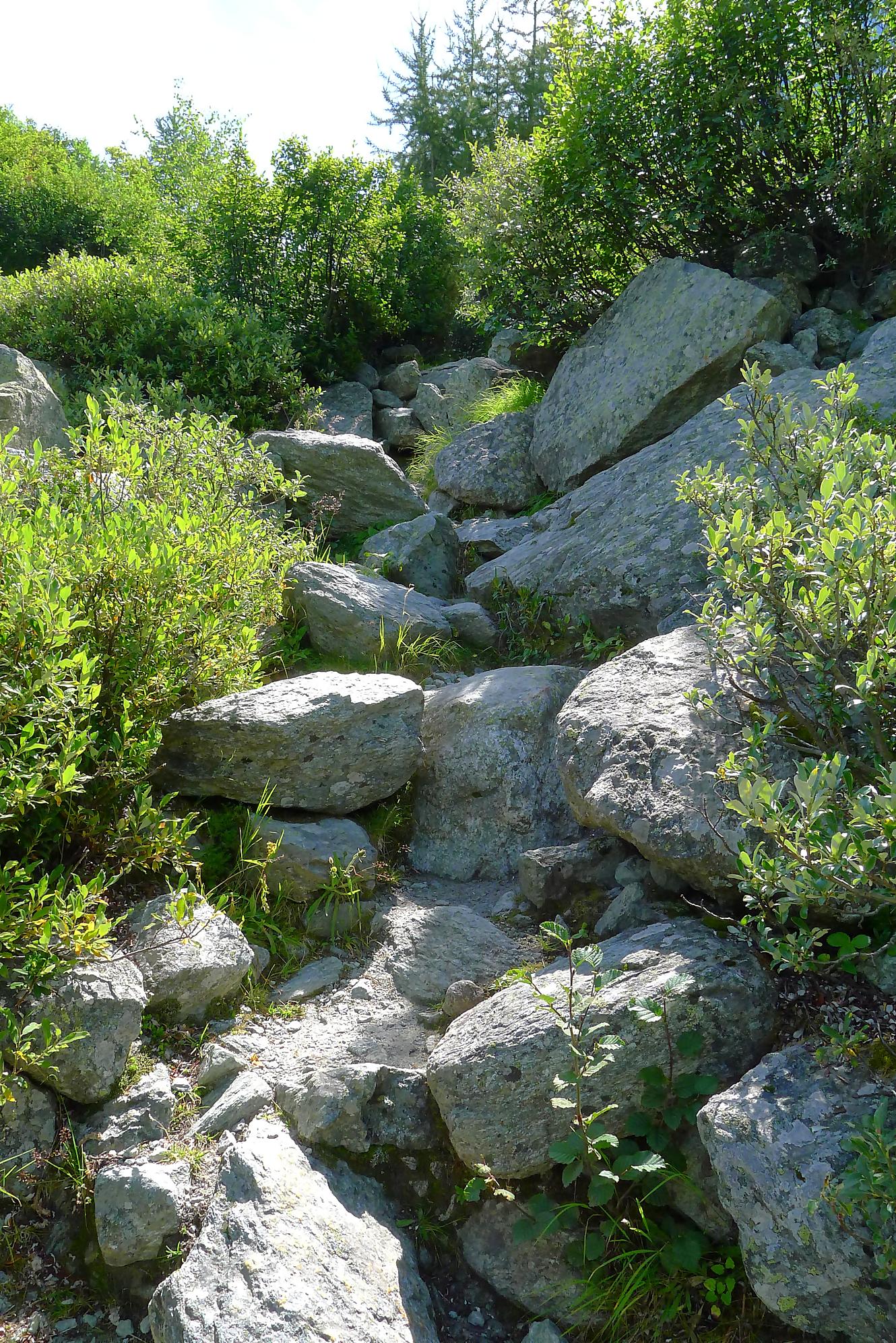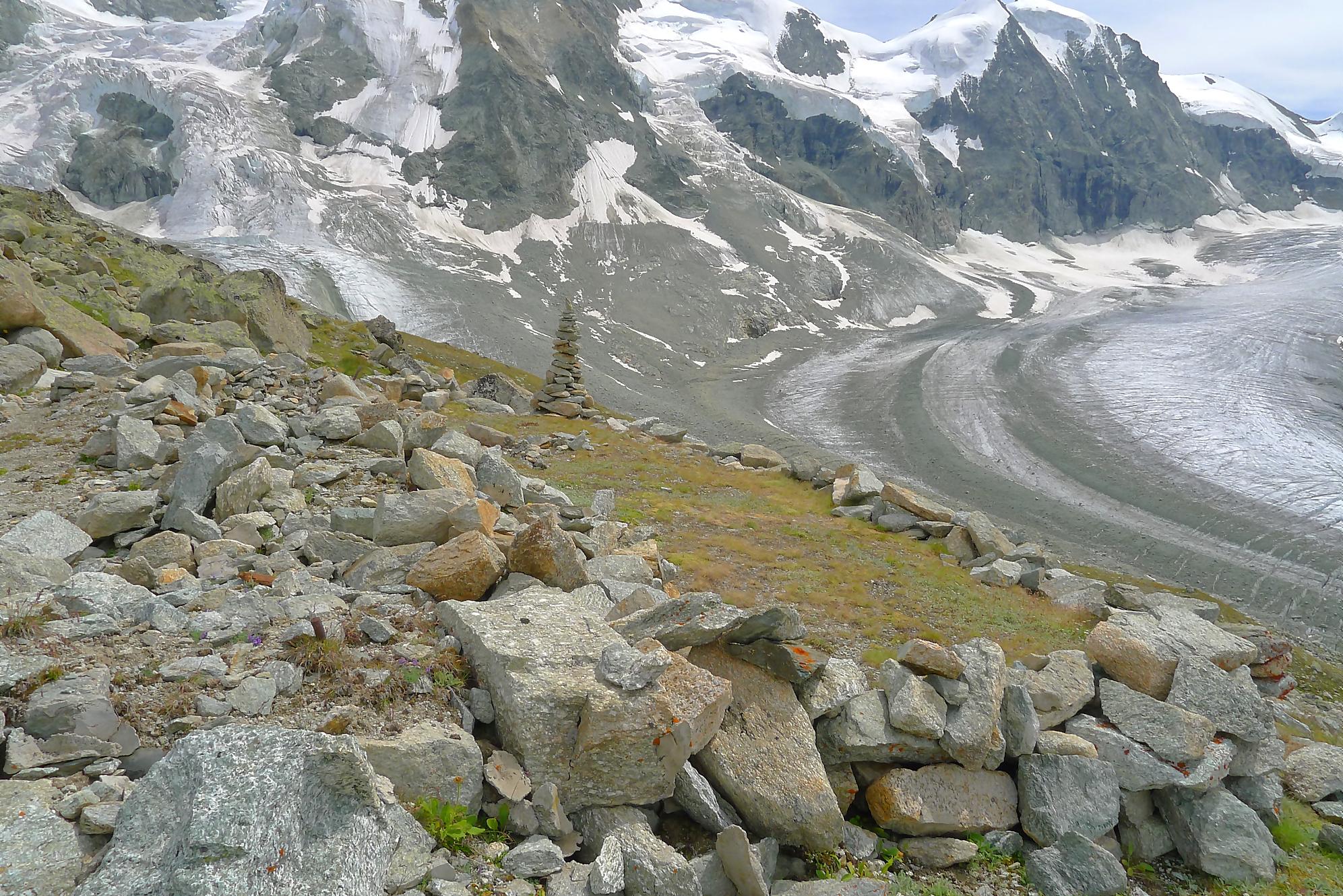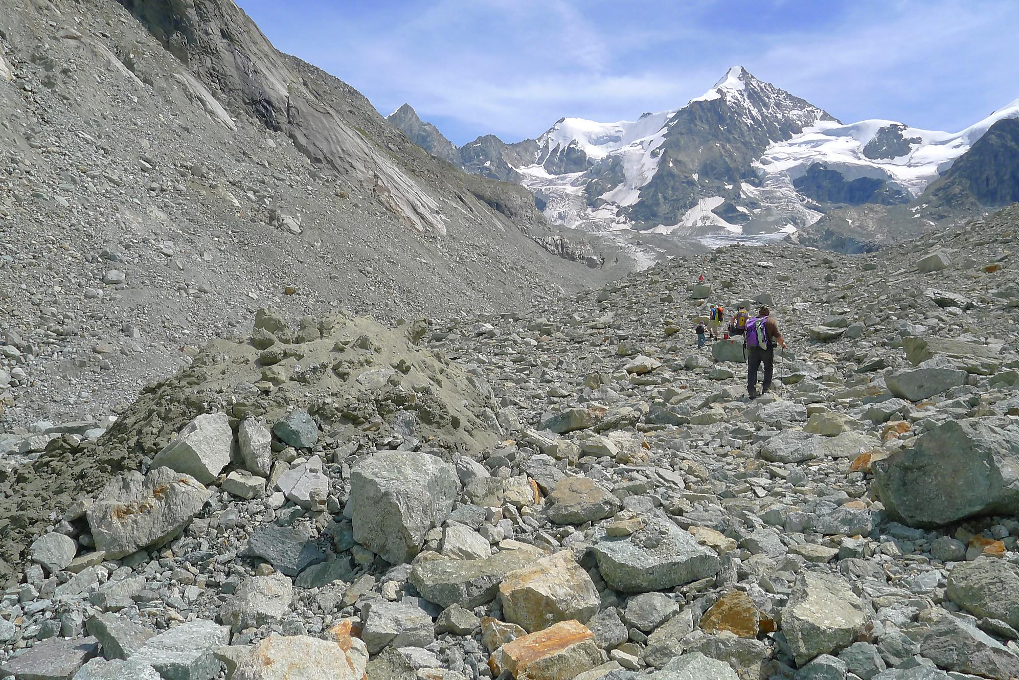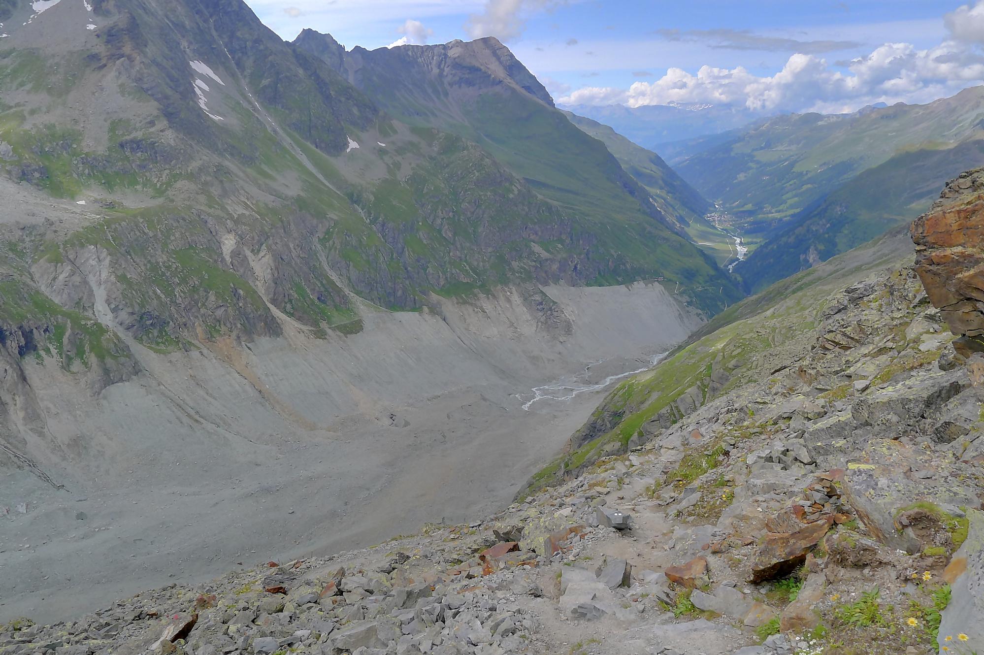 Le sentier reprend son tracé à flanc, puis sur une ancienne moraine. Là, le nouveau tracé fait descendre droit dans la pente de la moraine. Cette section n’est pas terrible, c’est pentu et gravilloneux. Les derniers mètres sont mêmes raides et offrant peu d’appuis, les bâtons furent donc appréciés. On arrive ainsi sur le glacier qu’on ne voit pas car complètement recouvert de pierres et roches. Il suffit de suivre les plots et marques rouges, il n’y a pas besoin de matériel spécifique. On progresse en sautant souvent de rochers en rochers. Je croise une famille dont le grand-père me dit qu’il a parcouru (forcément il y a longtemps) cette section tout en glace et c’était plus facile. On progresse brièvement sur la glace, facilement car des gravillons permettent une belle accroche.