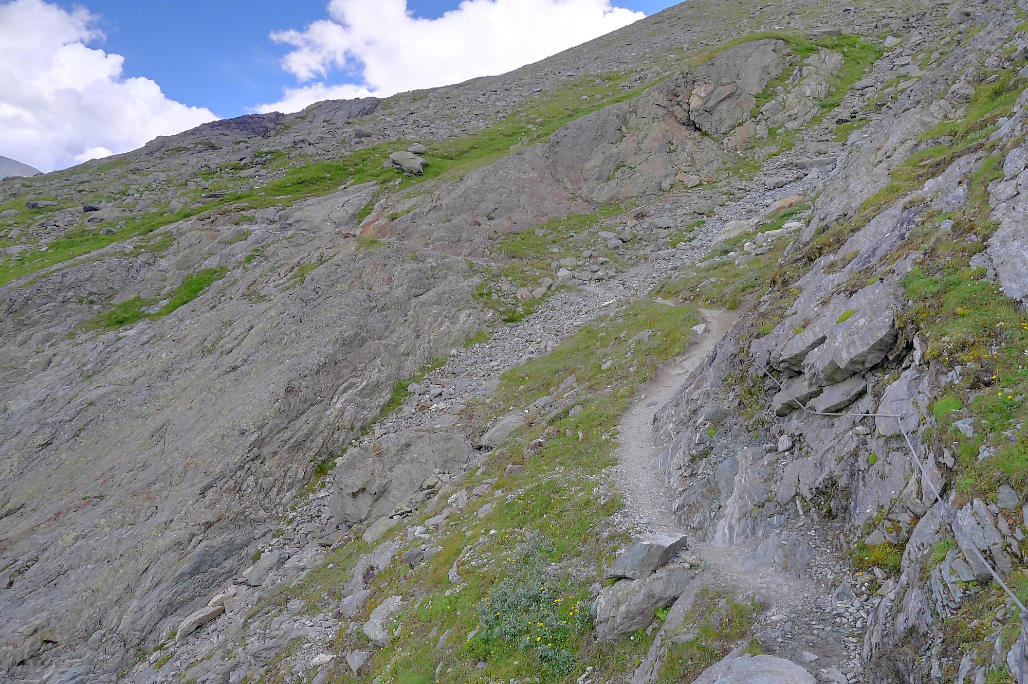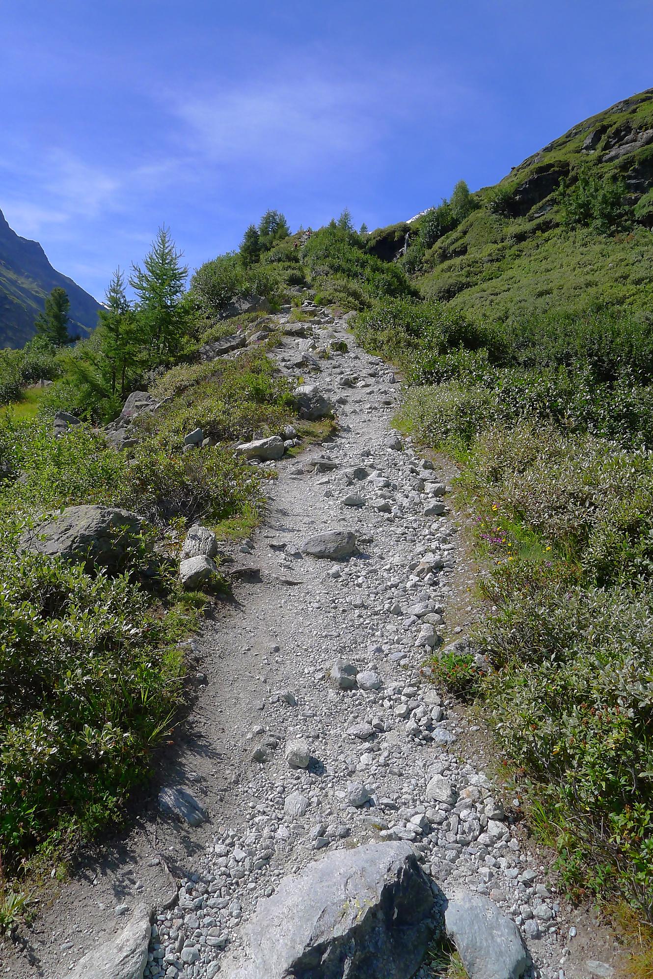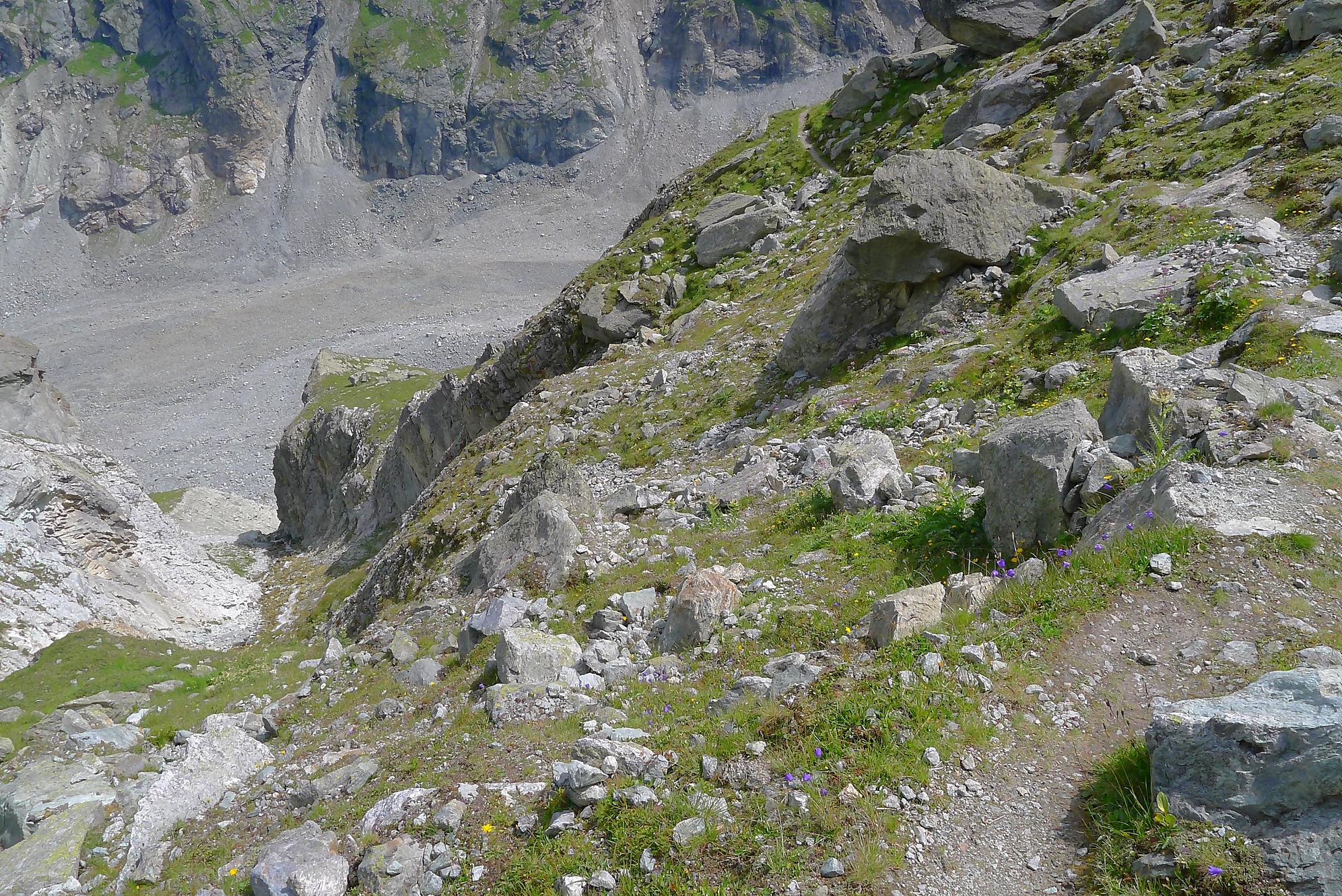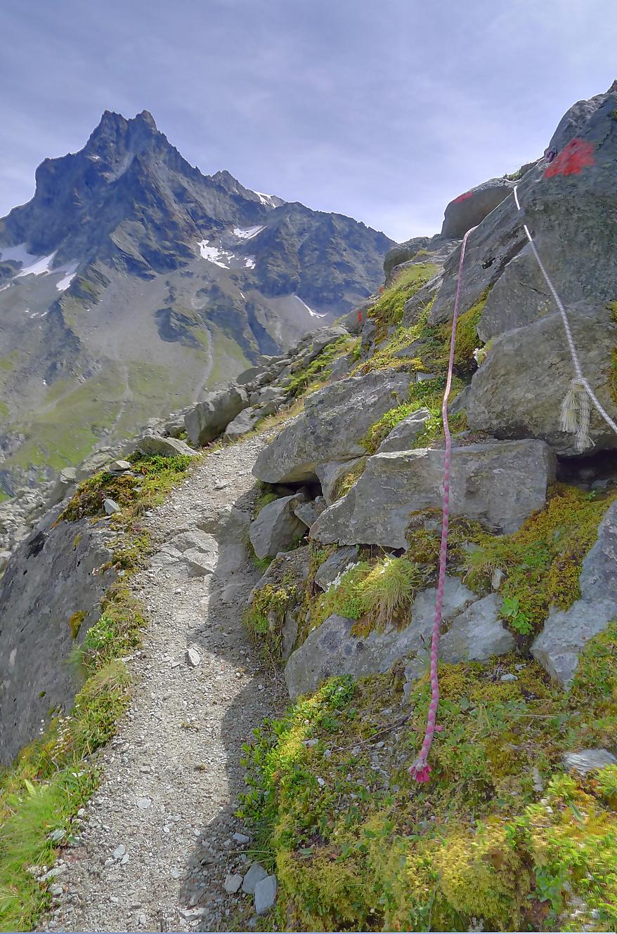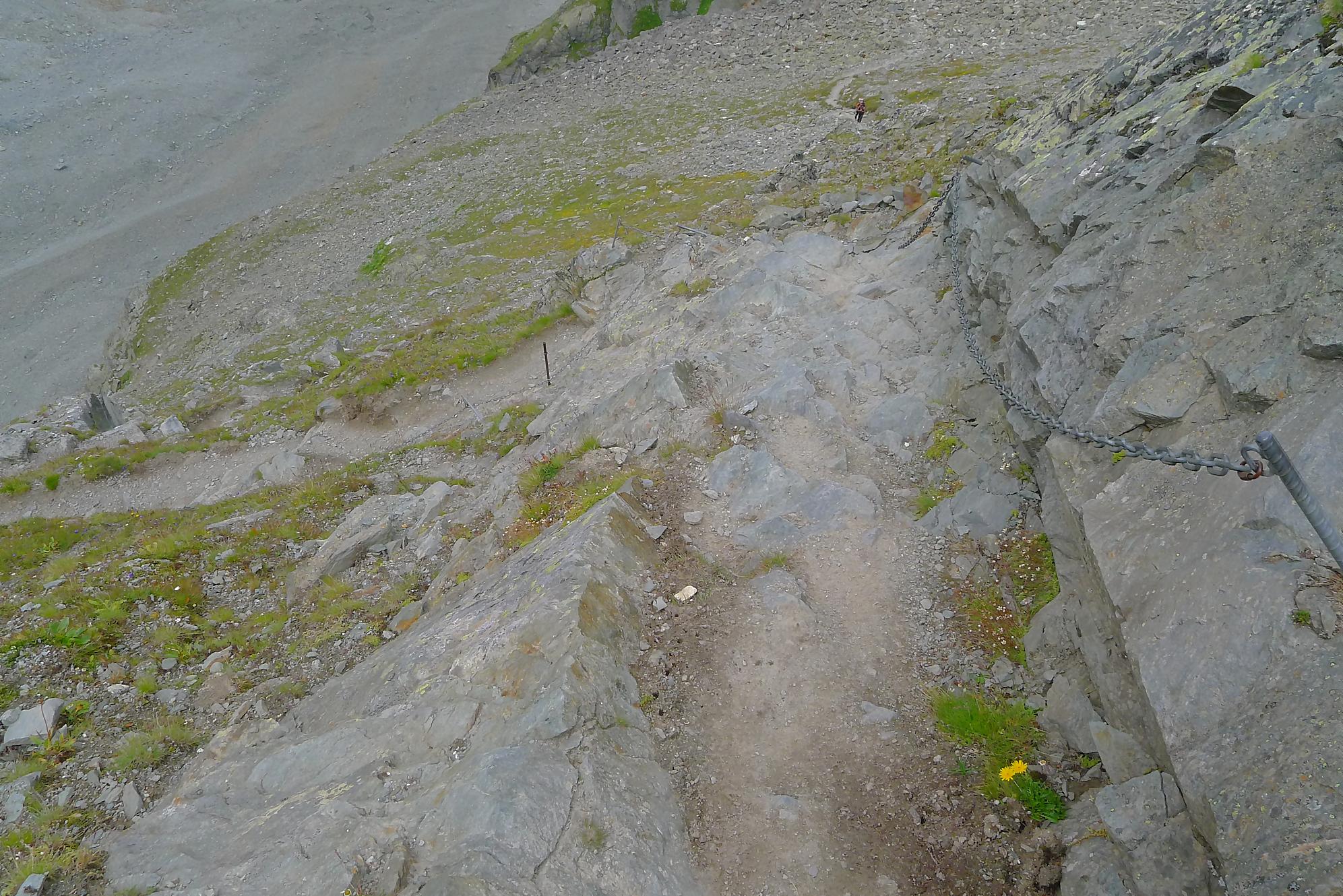 Je reprends ma route et à partir d’ici cela va faire mal aux mollets non affutés. Un panneau décourage les touristes. Ce chemin est assez récent, car au retour, en face, on voit des restes de l’ancien sentier (non praticable) juste au-dessus de la moraine. Donc le chemin monte fort, tout en zigzags et pentu. Fort bien fleuri et des myrtilles au début. Vers 2400m, le sentier se décide enfin à partir à flanc de montagne. Sur ce long tronçon, il y a aura bien des chaines, plus en soutien psychologique. Je n’en ai pas utilisé une seule, mais à chacun sa sensibilité aux pentes un peu vertigineuses.