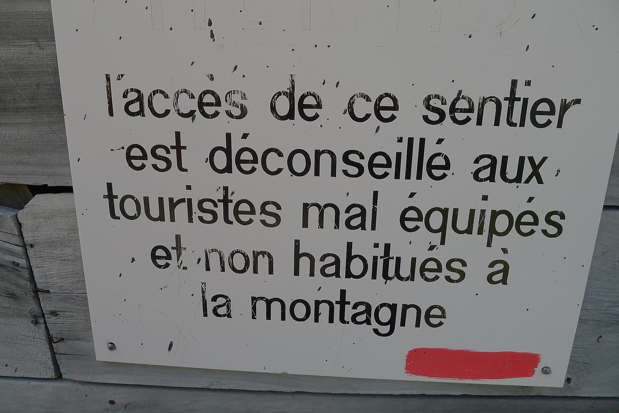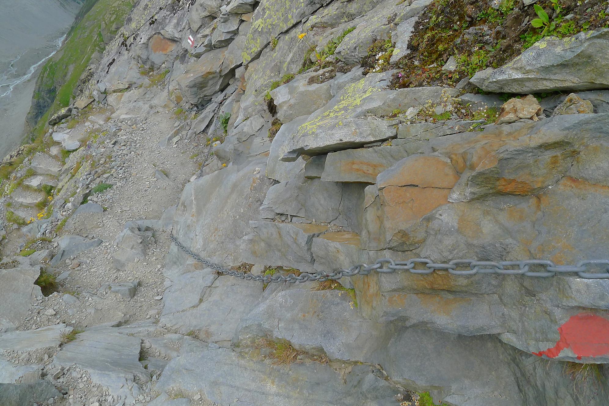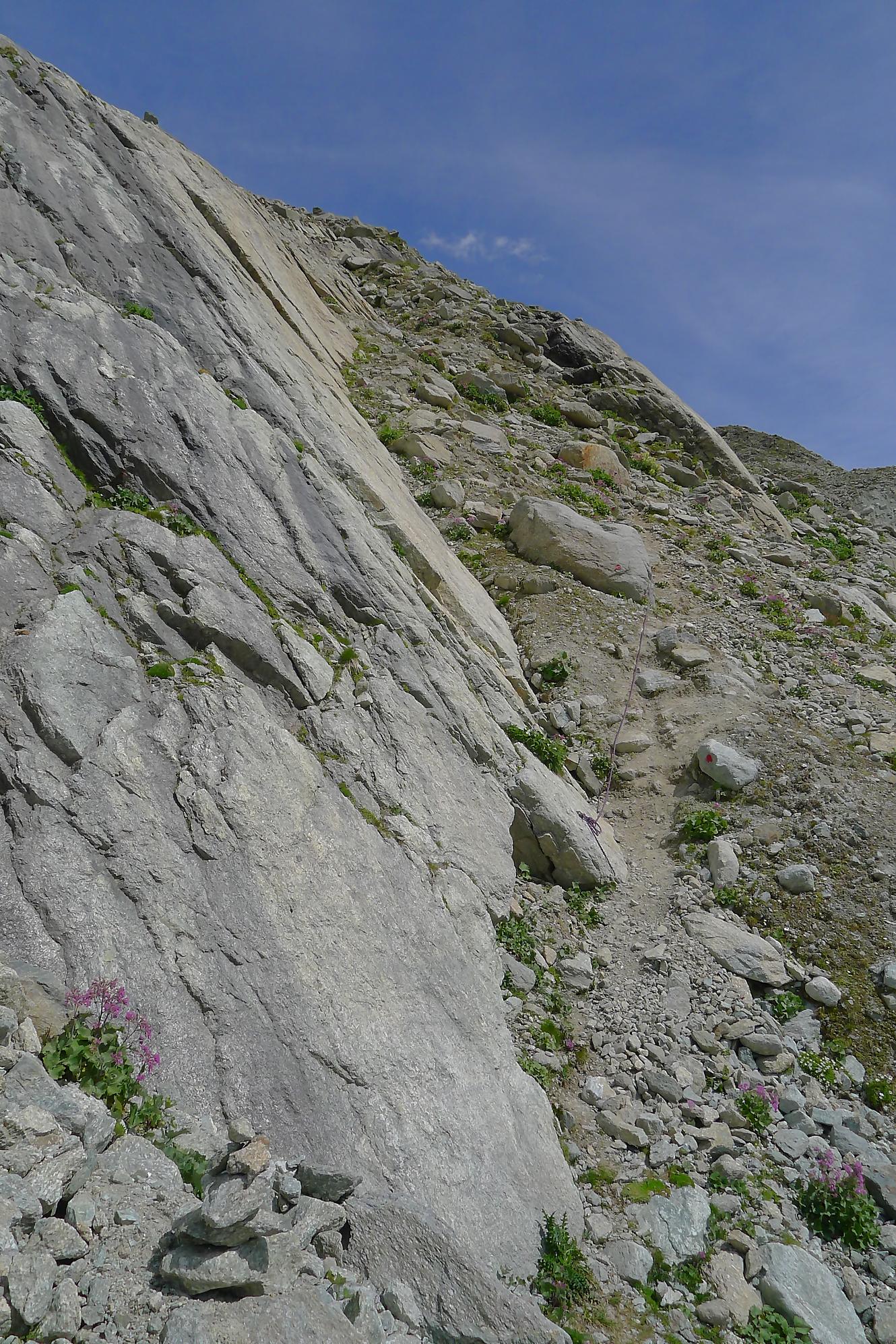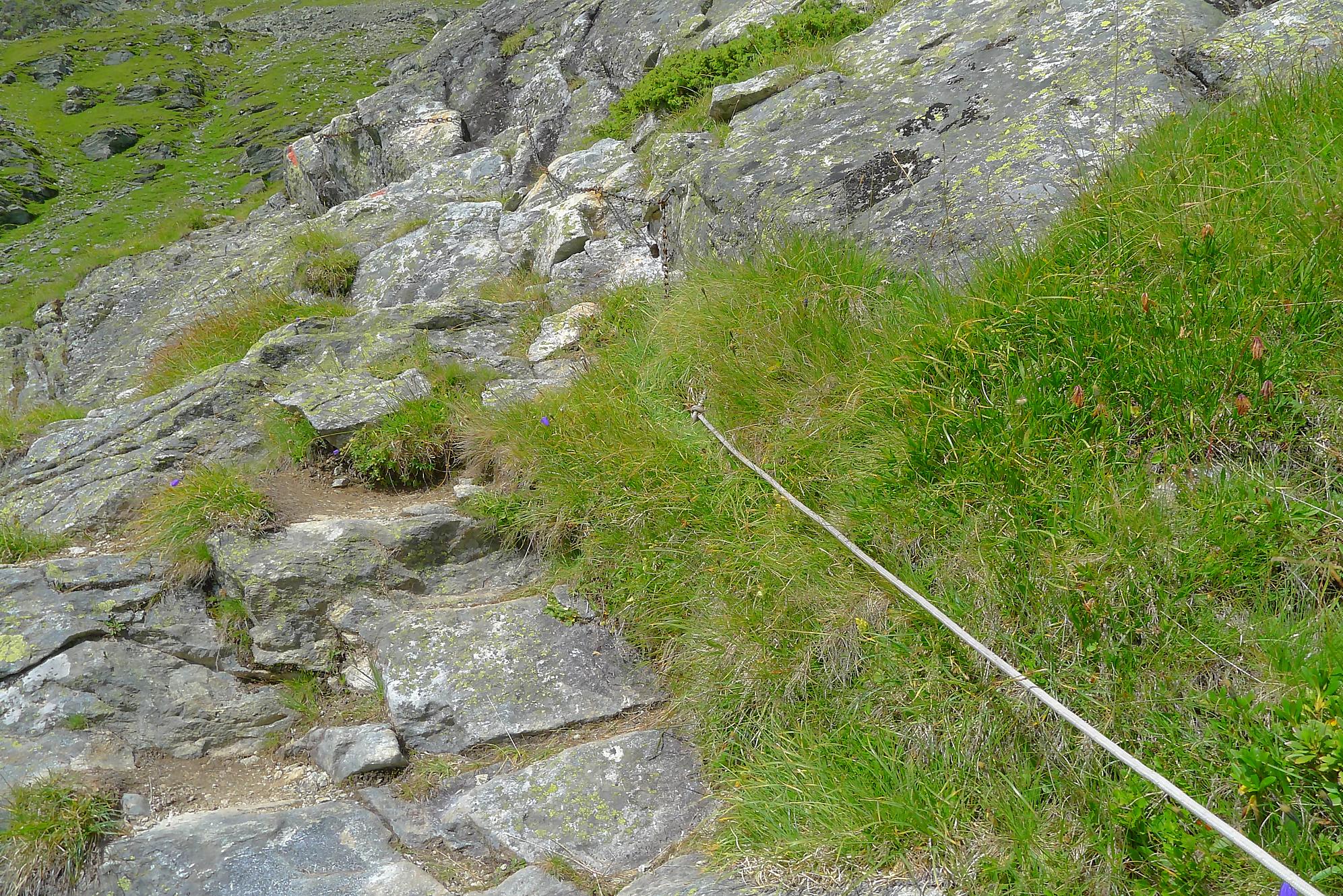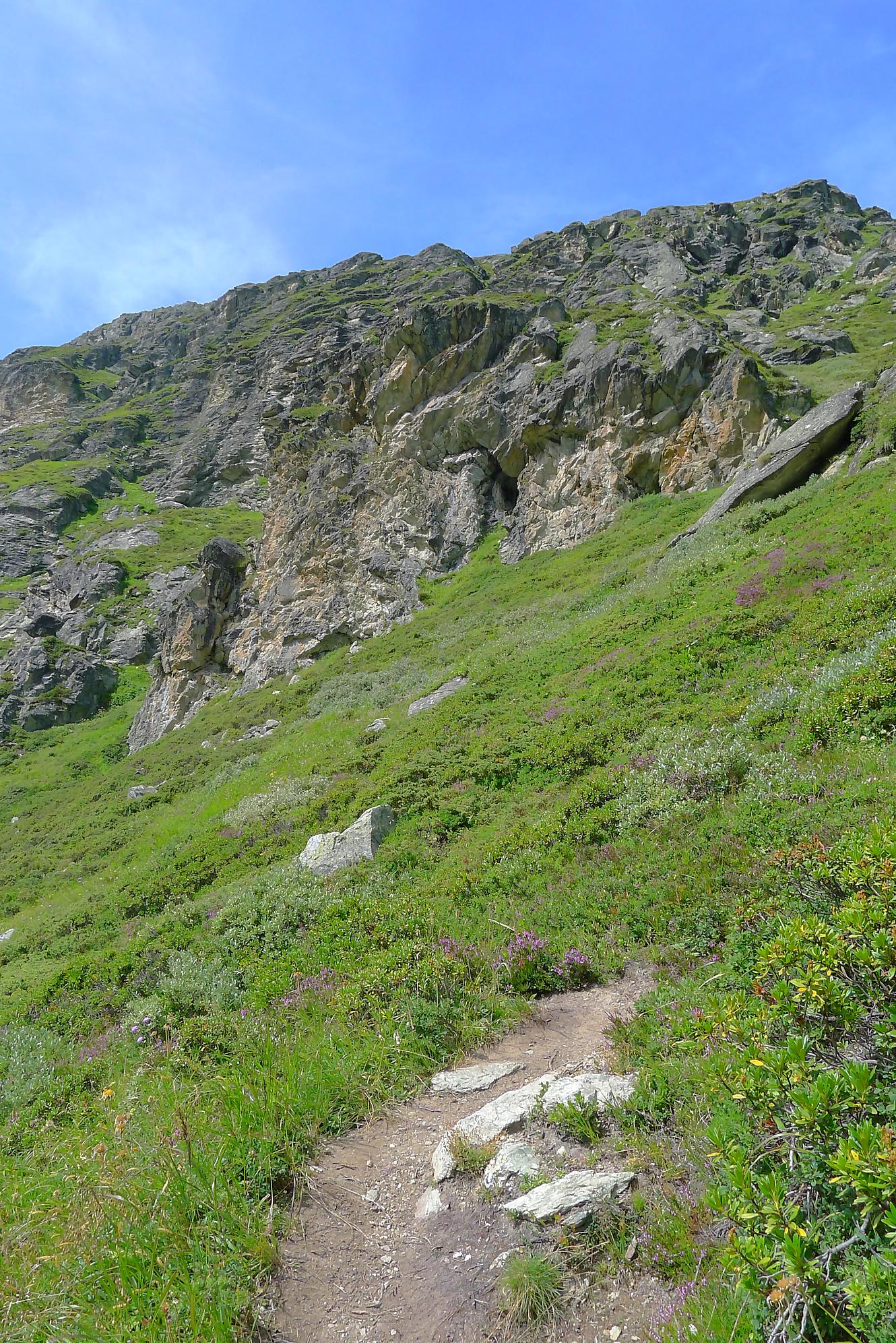 Je reprends ma route et à partir d’ici cela va faire mal aux mollets non affutés. Un panneau décourage les touristes. Ce chemin est assez récent, car au retour, en face, on voit des restes de l’ancien sentier (non praticable) juste au-dessus de la moraine. Donc le chemin monte fort, tout en zigzags et pentu. Fort bien fleuri et des myrtilles au début. Vers 2400m, le sentier se décide enfin à partir à flanc de montagne. Sur ce long tronçon, il y a aura bien des chaines, plus en soutien psychologique. Je n’en ai pas utilisé une seule, mais à chacun sa sensibilité aux pentes un peu vertigineuses.