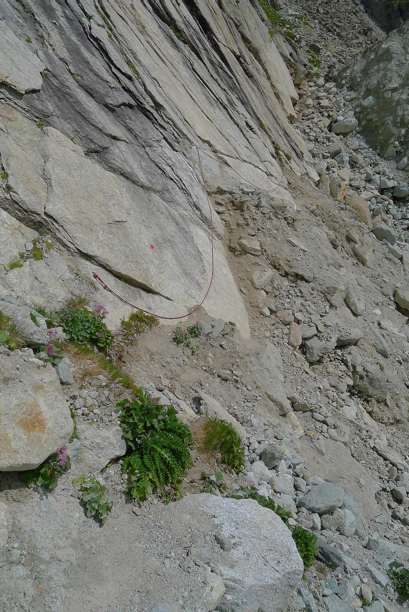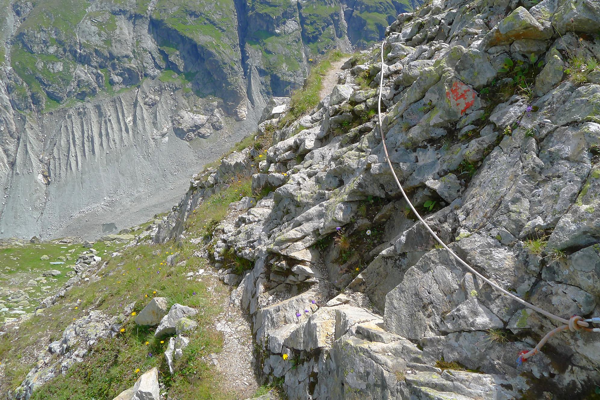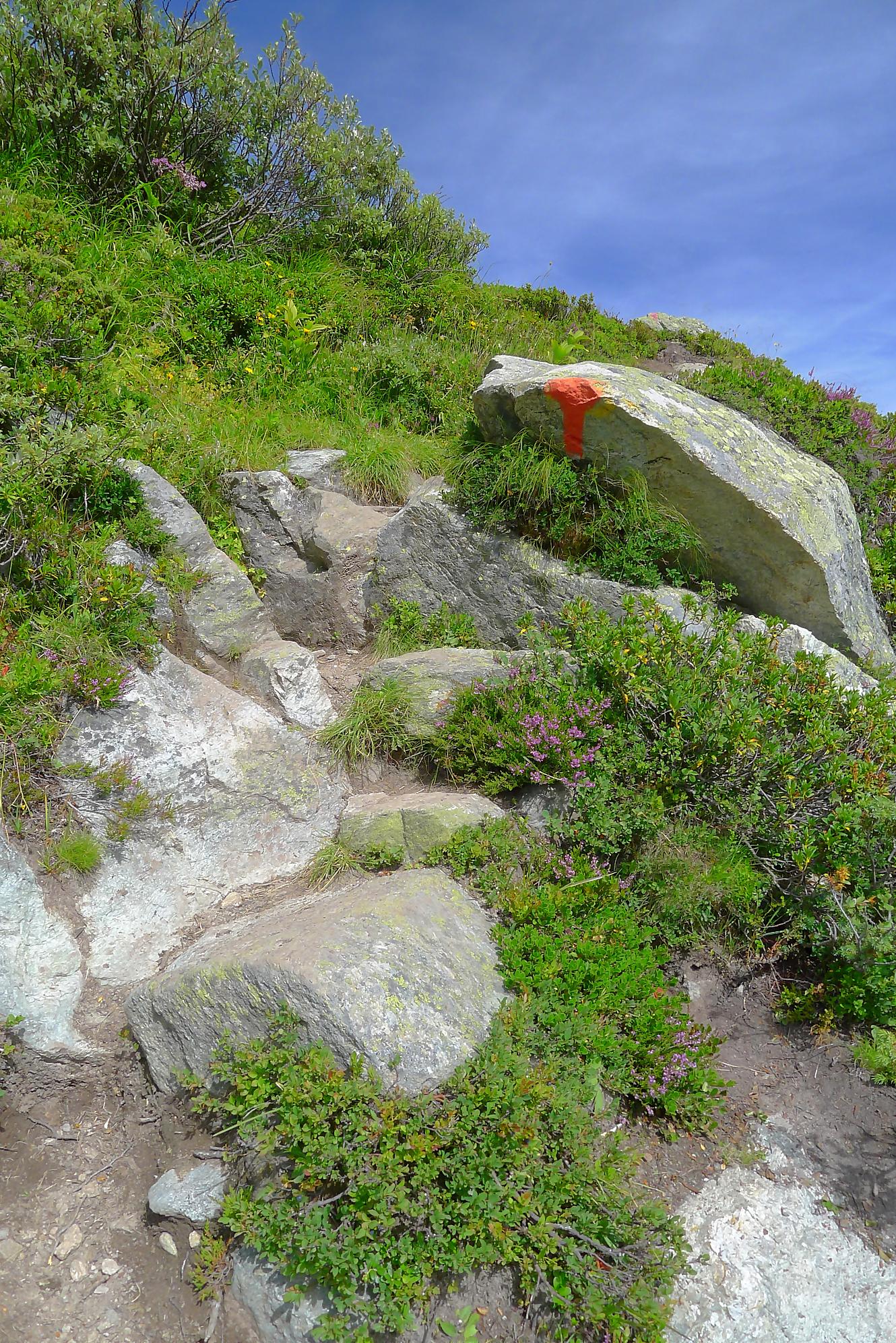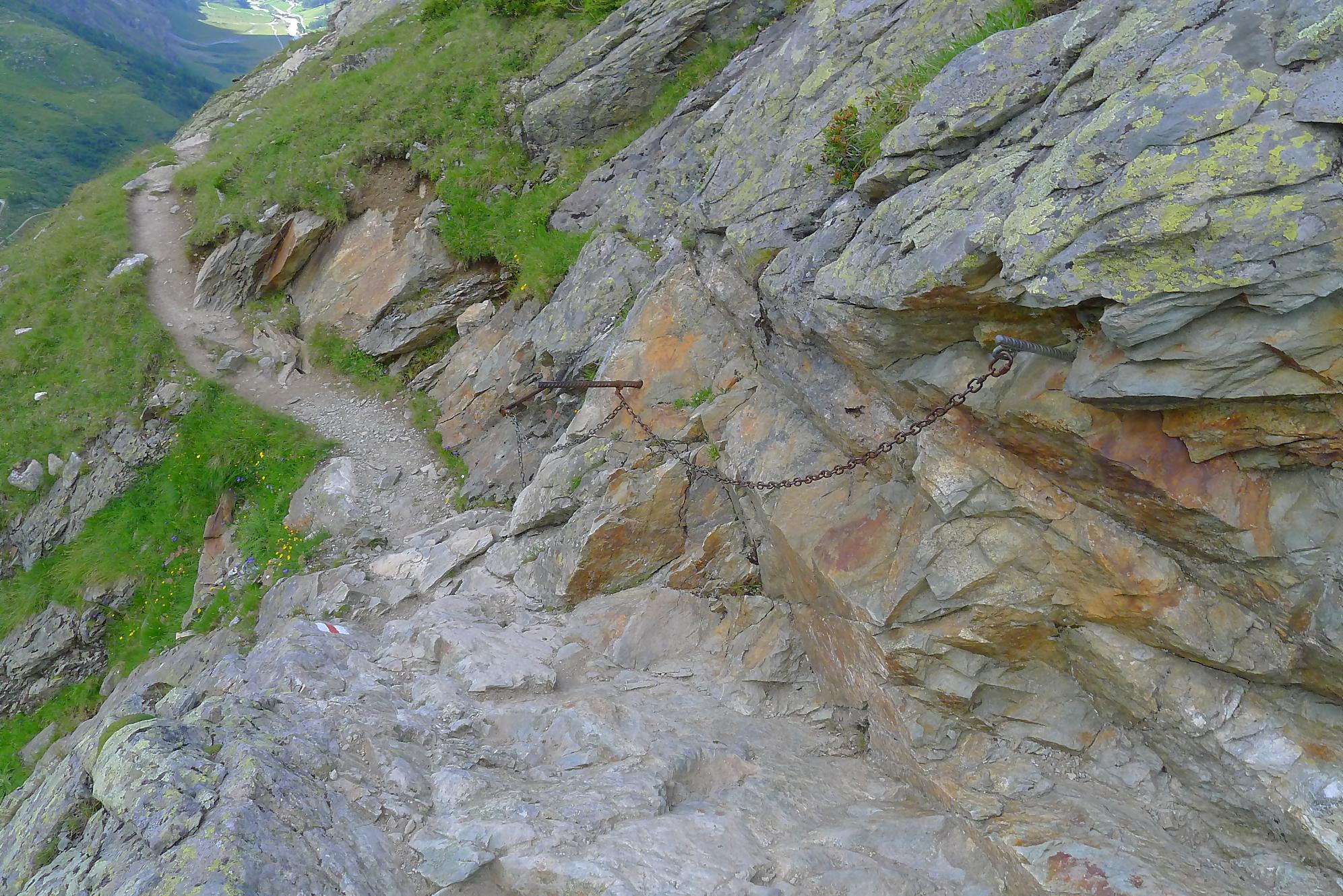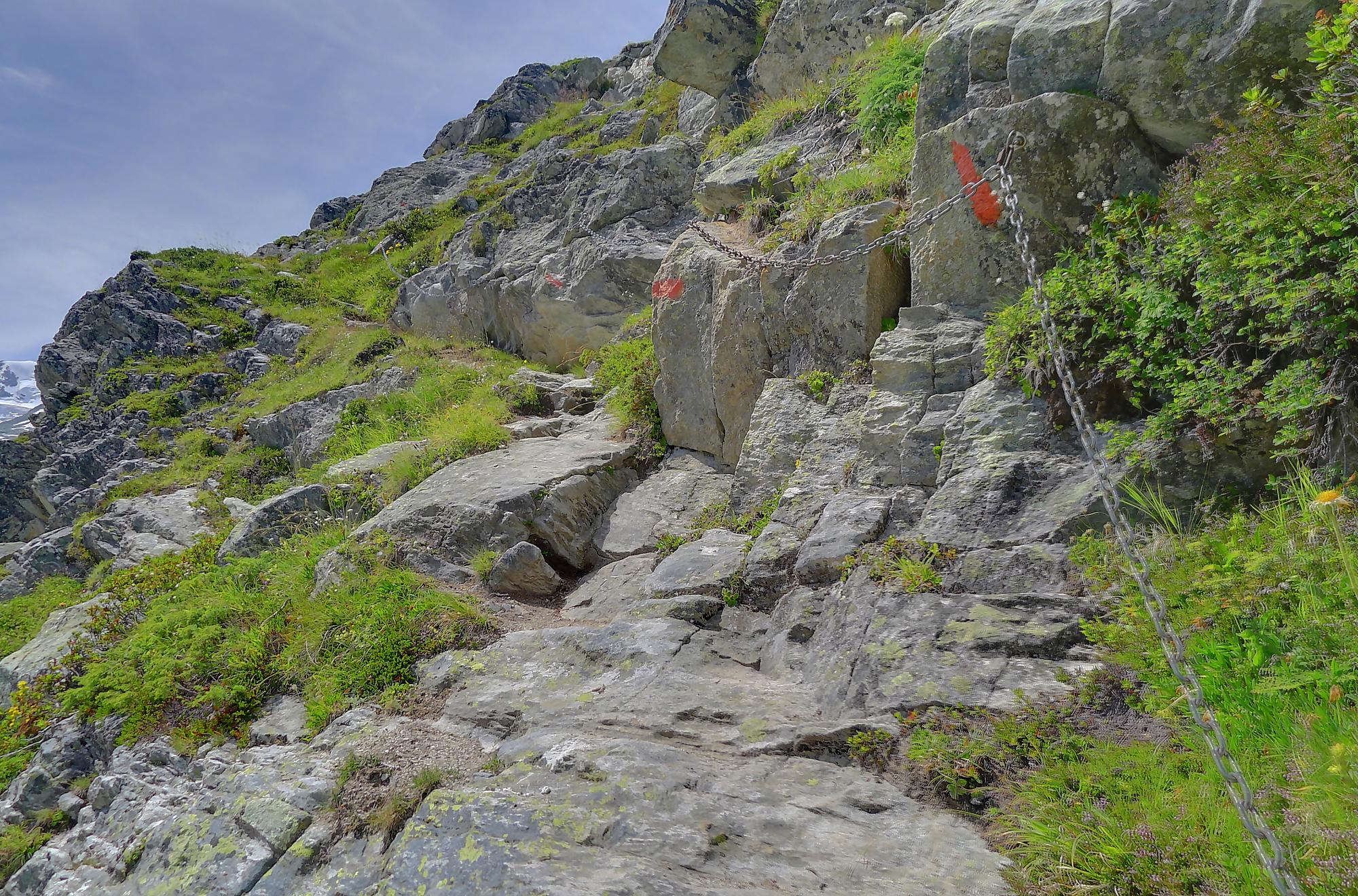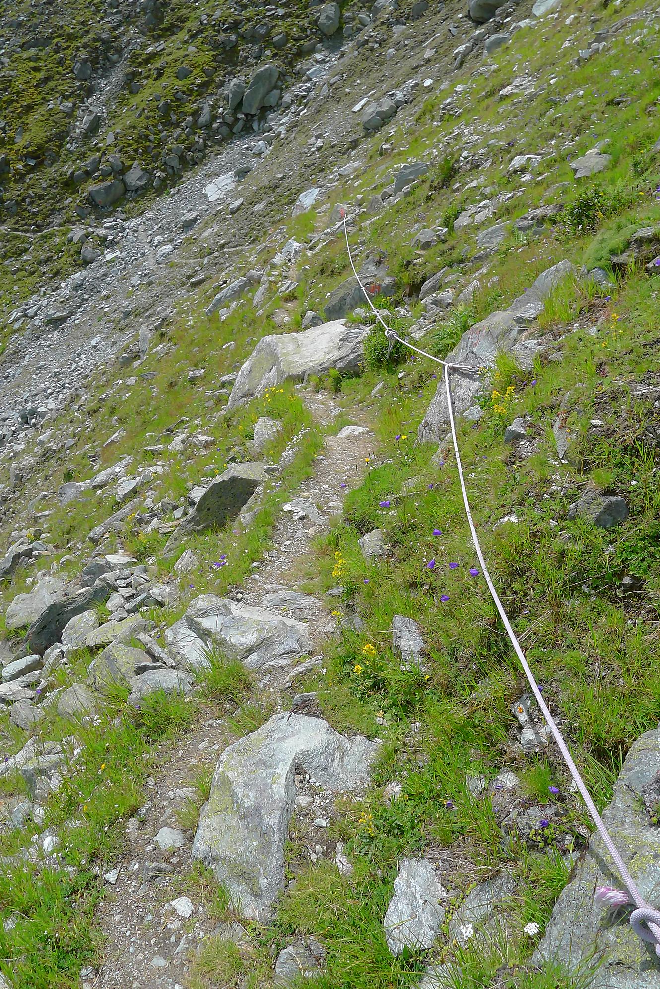 Je reprends ma route et à partir d’ici cela va faire mal aux mollets non affutés. Un panneau décourage les touristes. Ce chemin est assez récent, car au retour, en face, on voit des restes de l’ancien sentier (non praticable) juste au-dessus de la moraine. Donc le chemin monte fort, tout en zigzags et pentu. Fort bien fleuri et des myrtilles au début. Vers 2400m, le sentier se décide enfin à partir à flanc de montagne. Sur ce long tronçon, il y a aura bien des chaines, plus en soutien psychologique. Je n’en ai pas utilisé une seule, mais à chacun sa sensibilité aux pentes un peu vertigineuses.