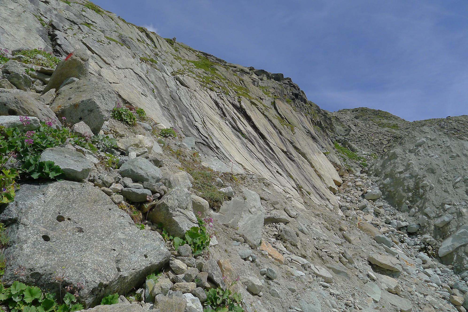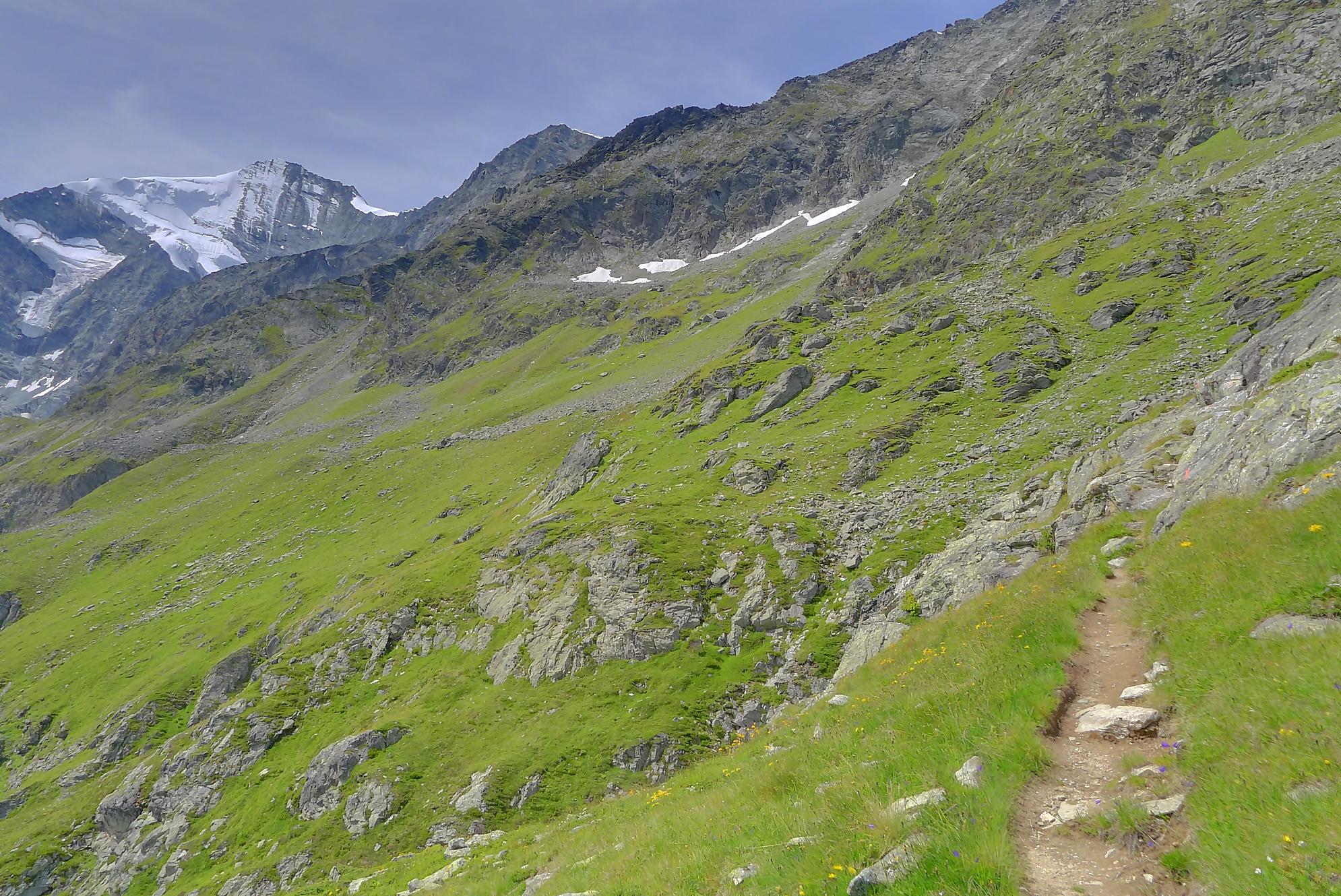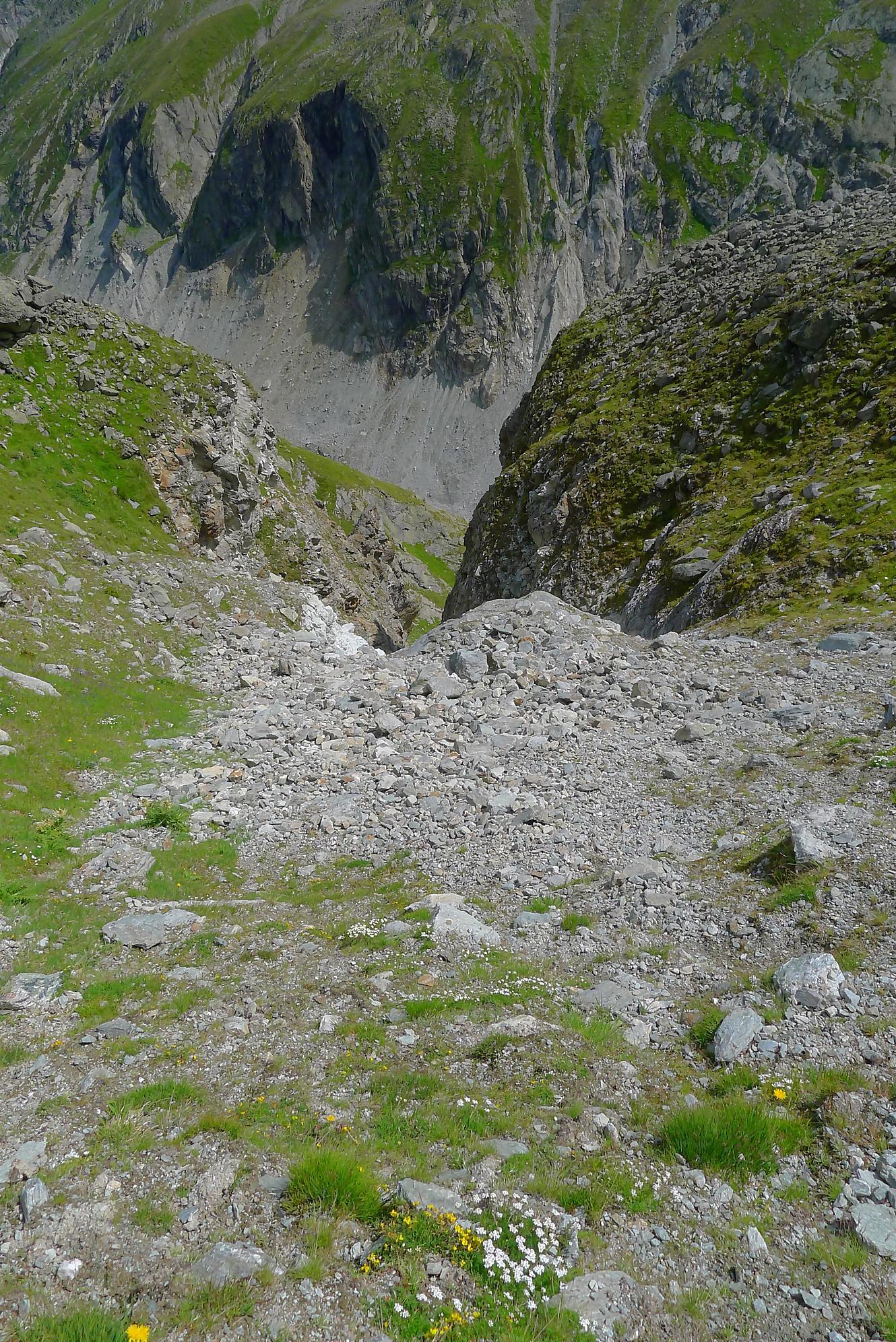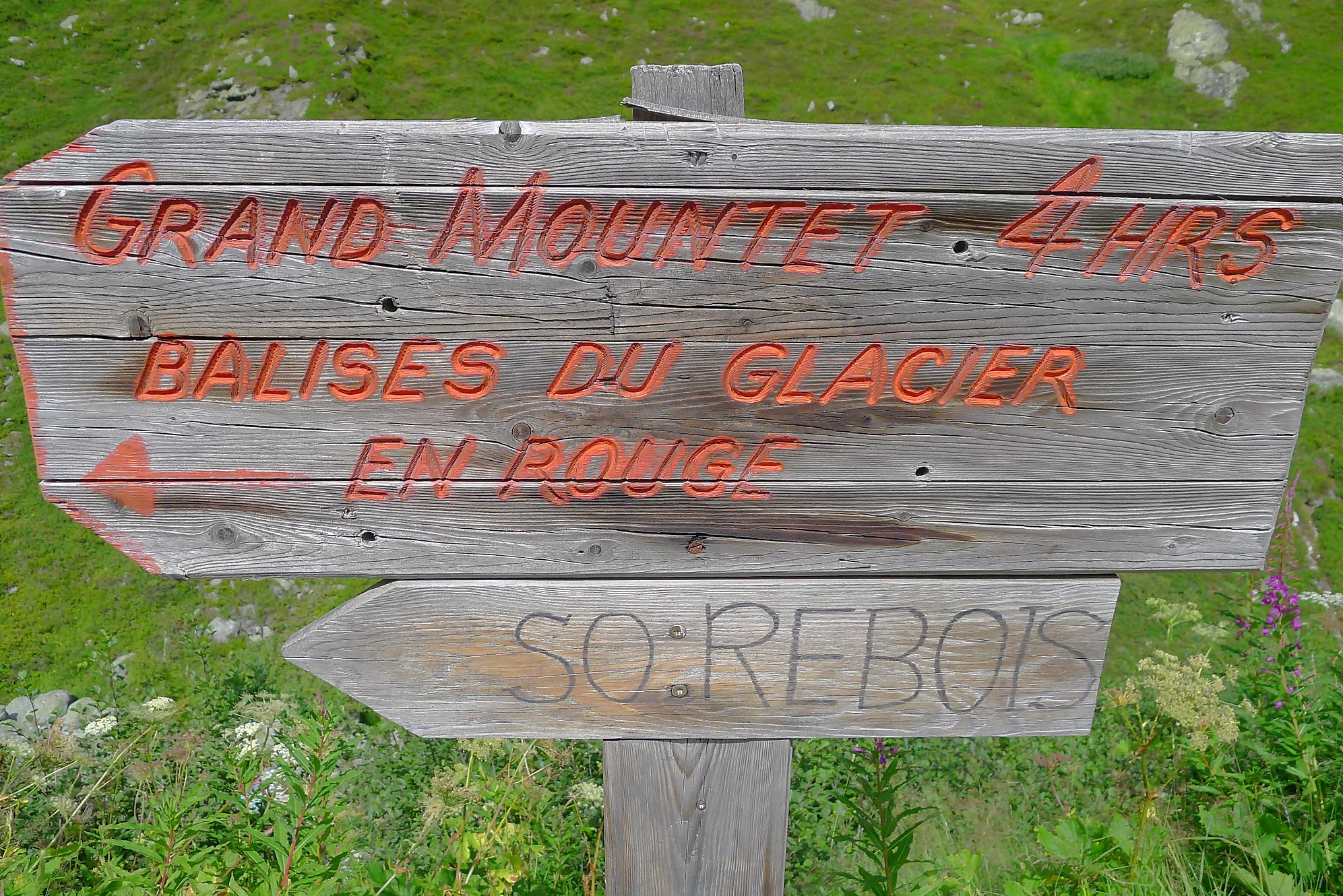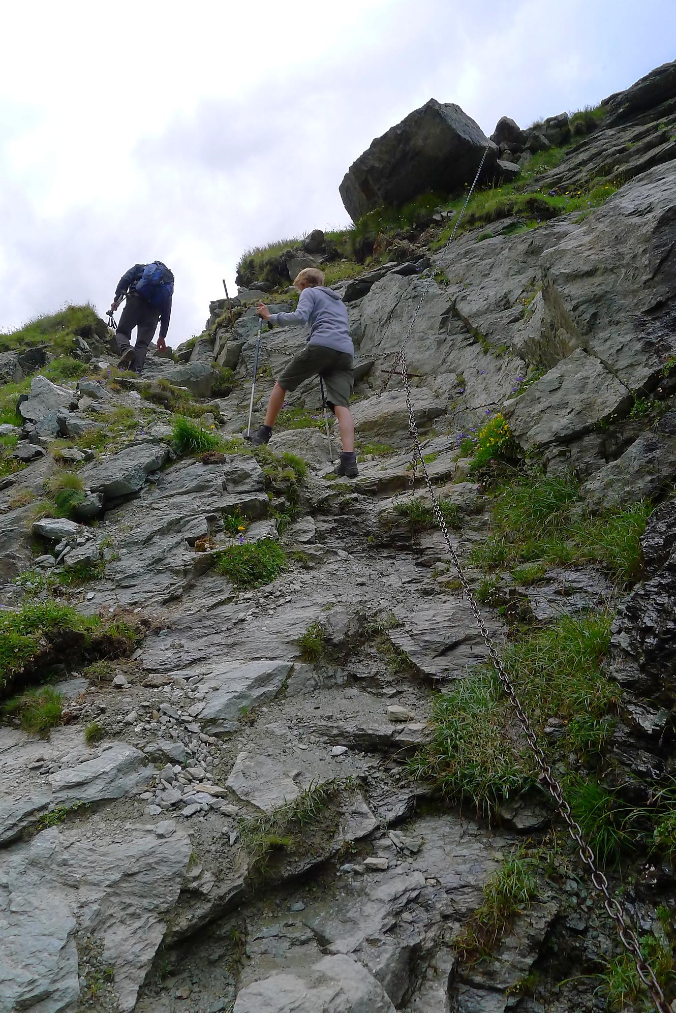 Je reprends ma route et à partir d’ici cela va faire mal aux mollets non affutés. Un panneau décourage les touristes. Ce chemin est assez récent, car au retour, en face, on voit des restes de l’ancien sentier (non praticable) juste au-dessus de la moraine. Donc le chemin monte fort, tout en zigzags et pentu. Fort bien fleuri et des myrtilles au début. Vers 2400m, le sentier se décide enfin à partir à flanc de montagne. Sur ce long tronçon, il y a aura bien des chaines, plus en soutien psychologique. Je n’en ai pas utilisé une seule, mais à chacun sa sensibilité aux pentes un peu vertigineuses.