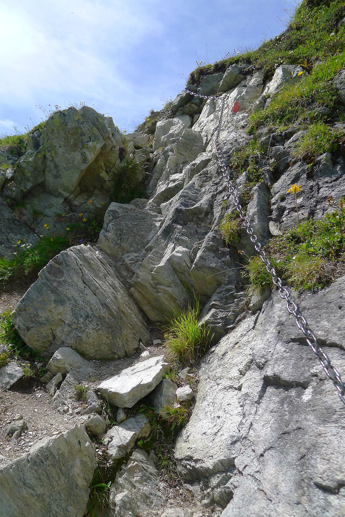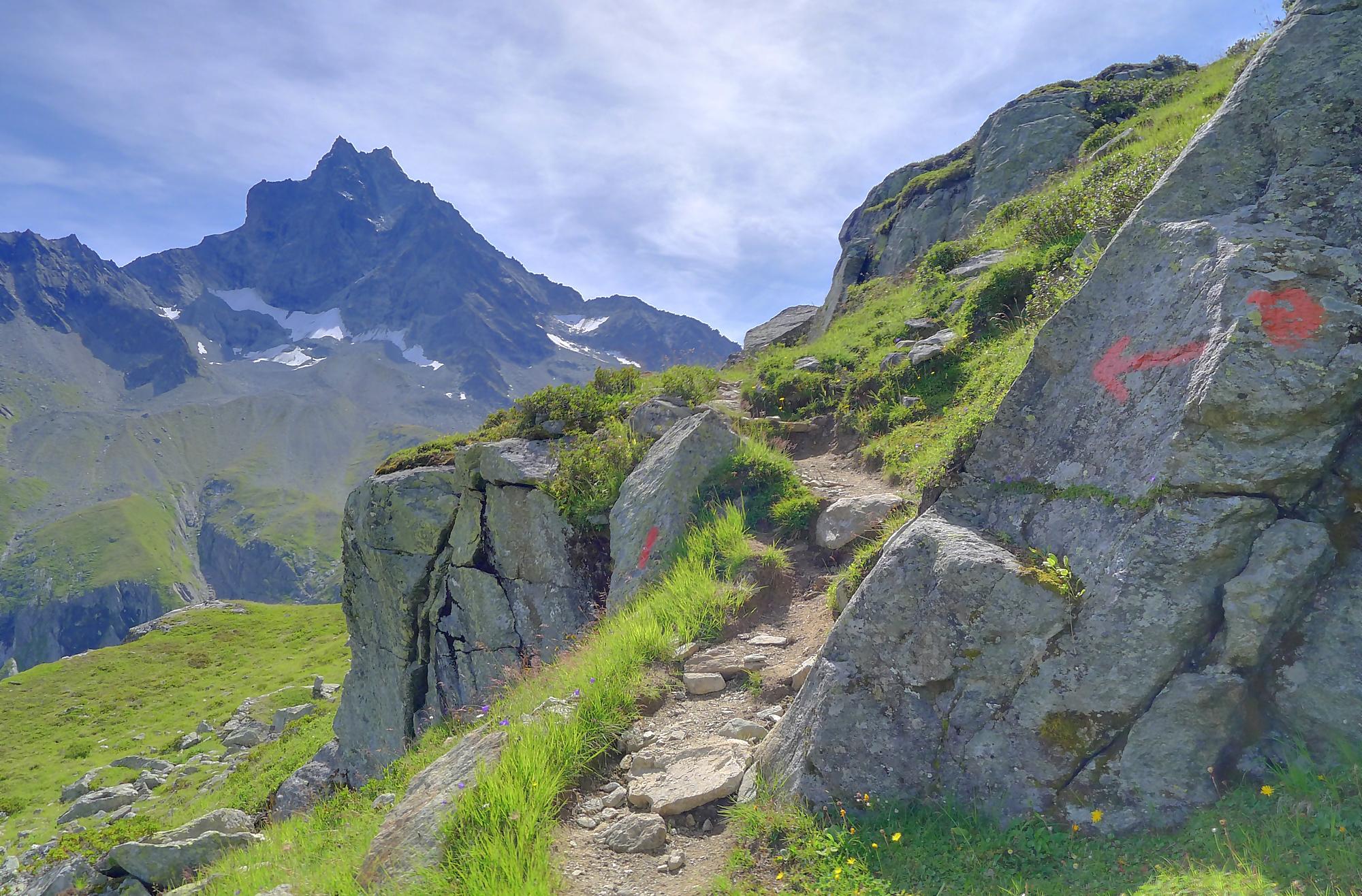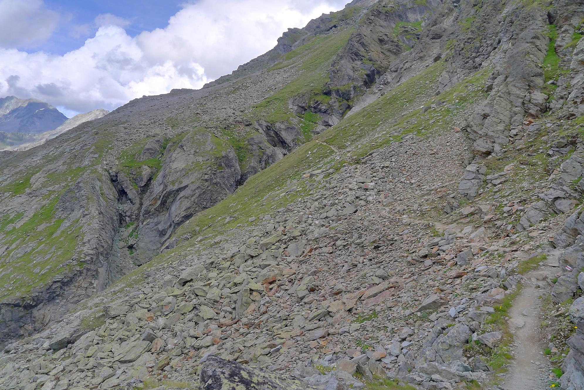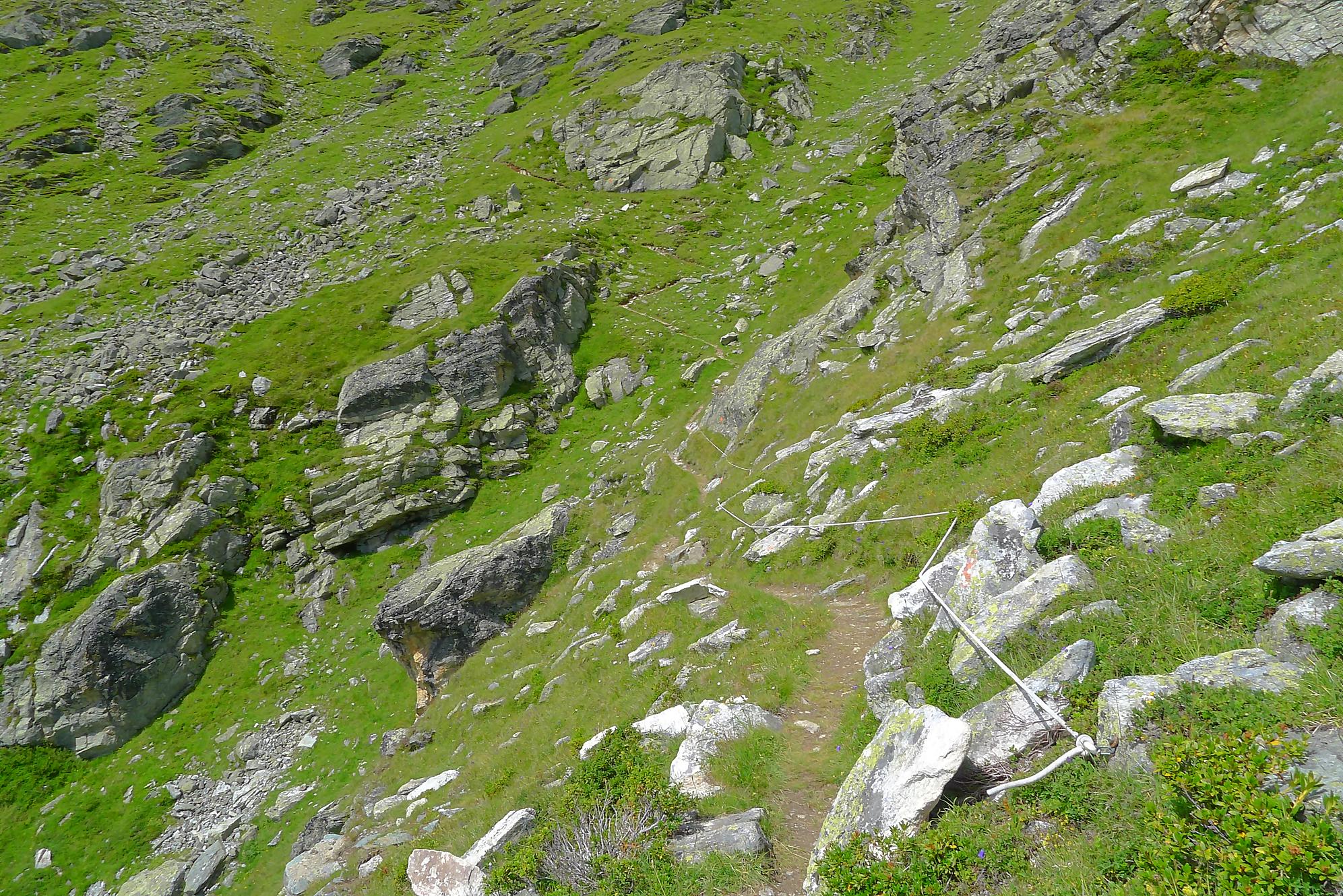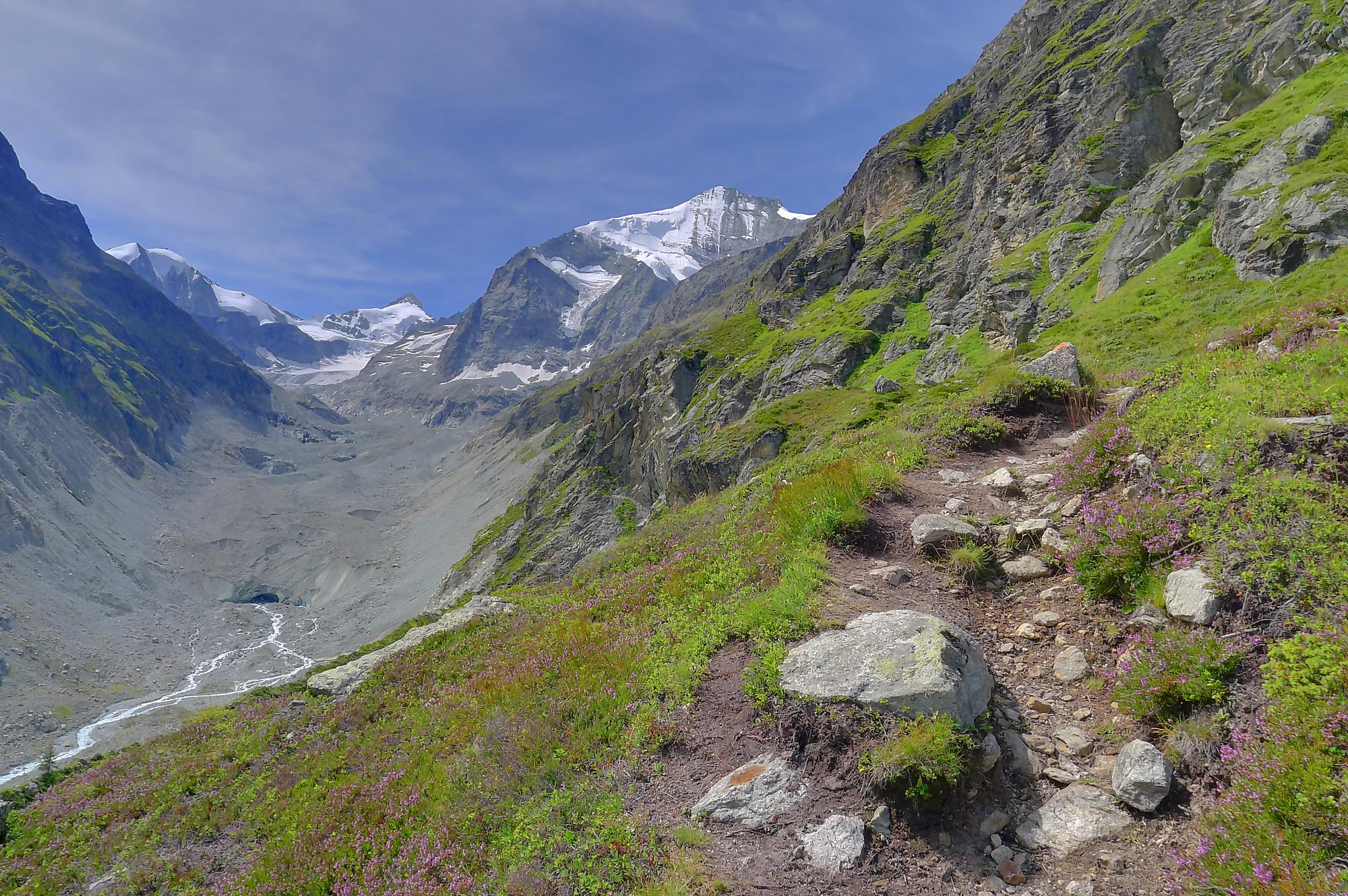 Je reprends ma route et à partir d’ici cela va faire mal aux mollets non affutés. Un panneau décourage les touristes. Ce chemin est assez récent, car au retour, en face, on voit des restes de l’ancien sentier (non praticable) juste au-dessus de la moraine. Donc le chemin monte fort, tout en zigzags et pentu. Fort bien fleuri et des myrtilles au début. Vers 2400m, le sentier se décide enfin à partir à flanc de montagne. Sur ce long tronçon, il y a aura bien des chaines, plus en soutien psychologique. Je n’en ai pas utilisé une seule, mais à chacun sa sensibilité aux pentes un peu vertigineuses.