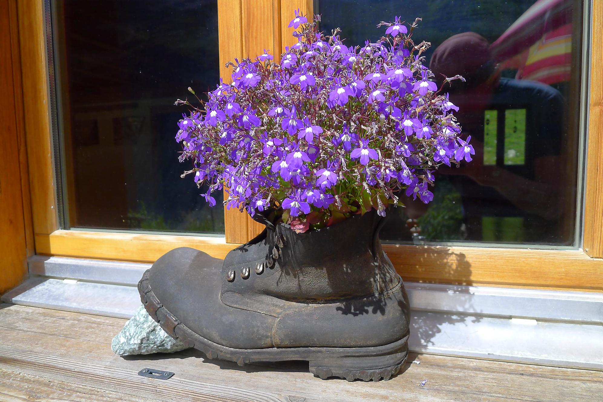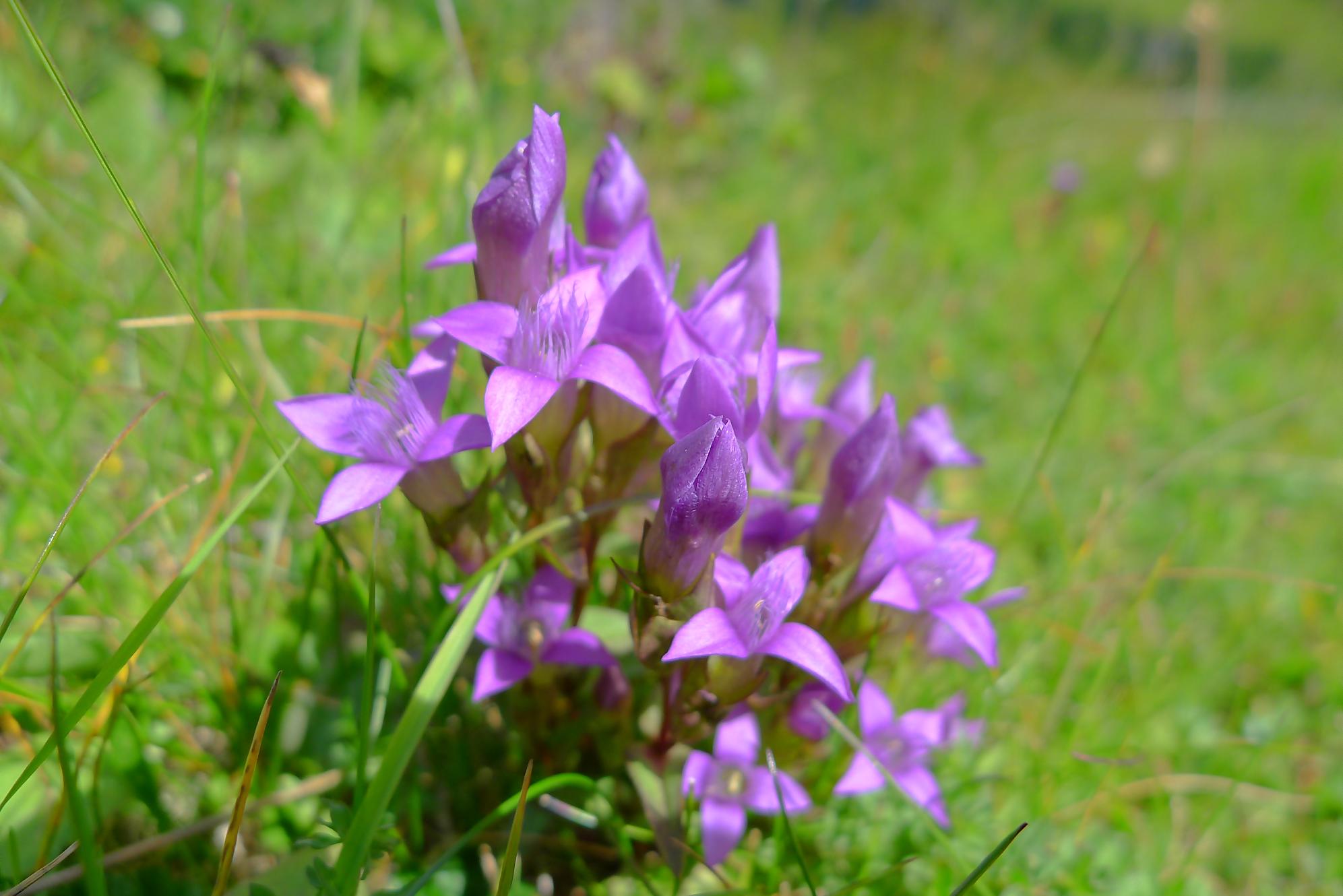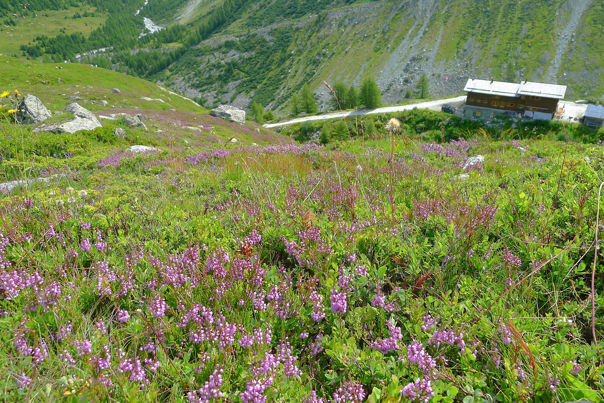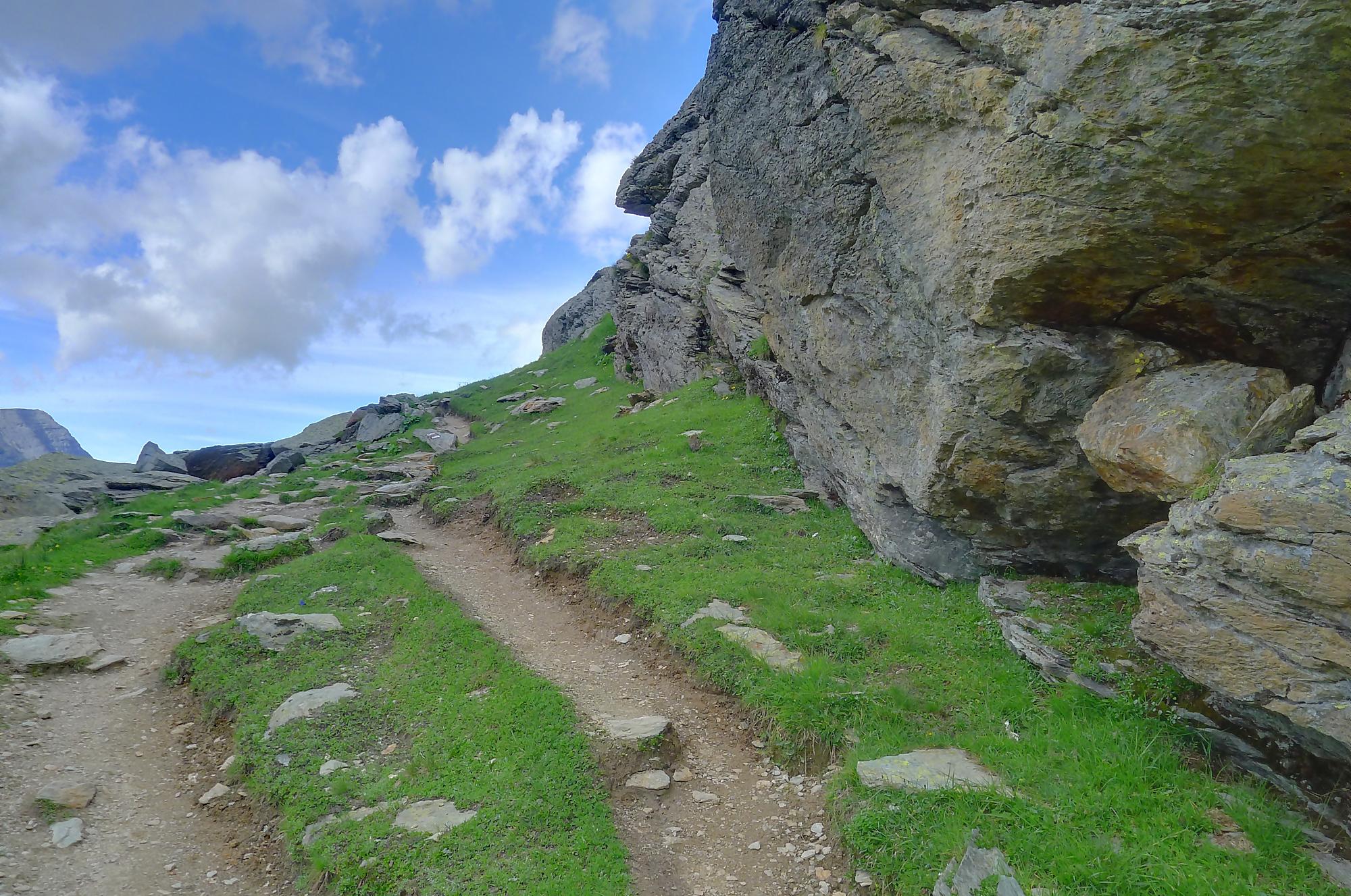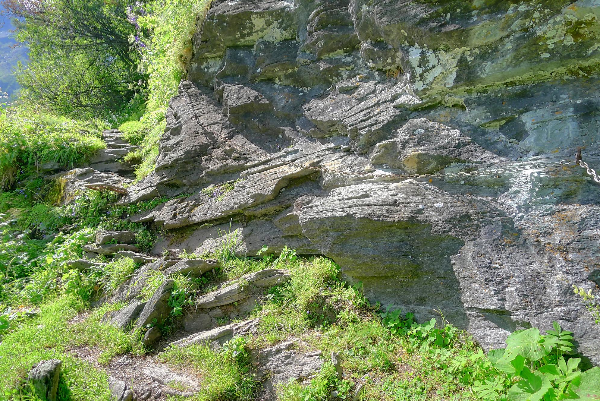 Je reprends ma route et à partir d’ici cela va faire mal aux mollets non affutés. Un panneau décourage les touristes. Ce chemin est assez récent, car au retour, en face, on voit des restes de l’ancien sentier (non praticable) juste au-dessus de la moraine. Donc le chemin monte fort, tout en zigzags et pentu. Fort bien fleuri et des myrtilles au début. Vers 2400m, le sentier se décide enfin à partir à flanc de montagne. Sur ce long tronçon, il y a aura bien des chaines, plus en soutien psychologique. Je n’en ai pas utilisé une seule, mais à chacun sa sensibilité aux pentes un peu vertigineuses.