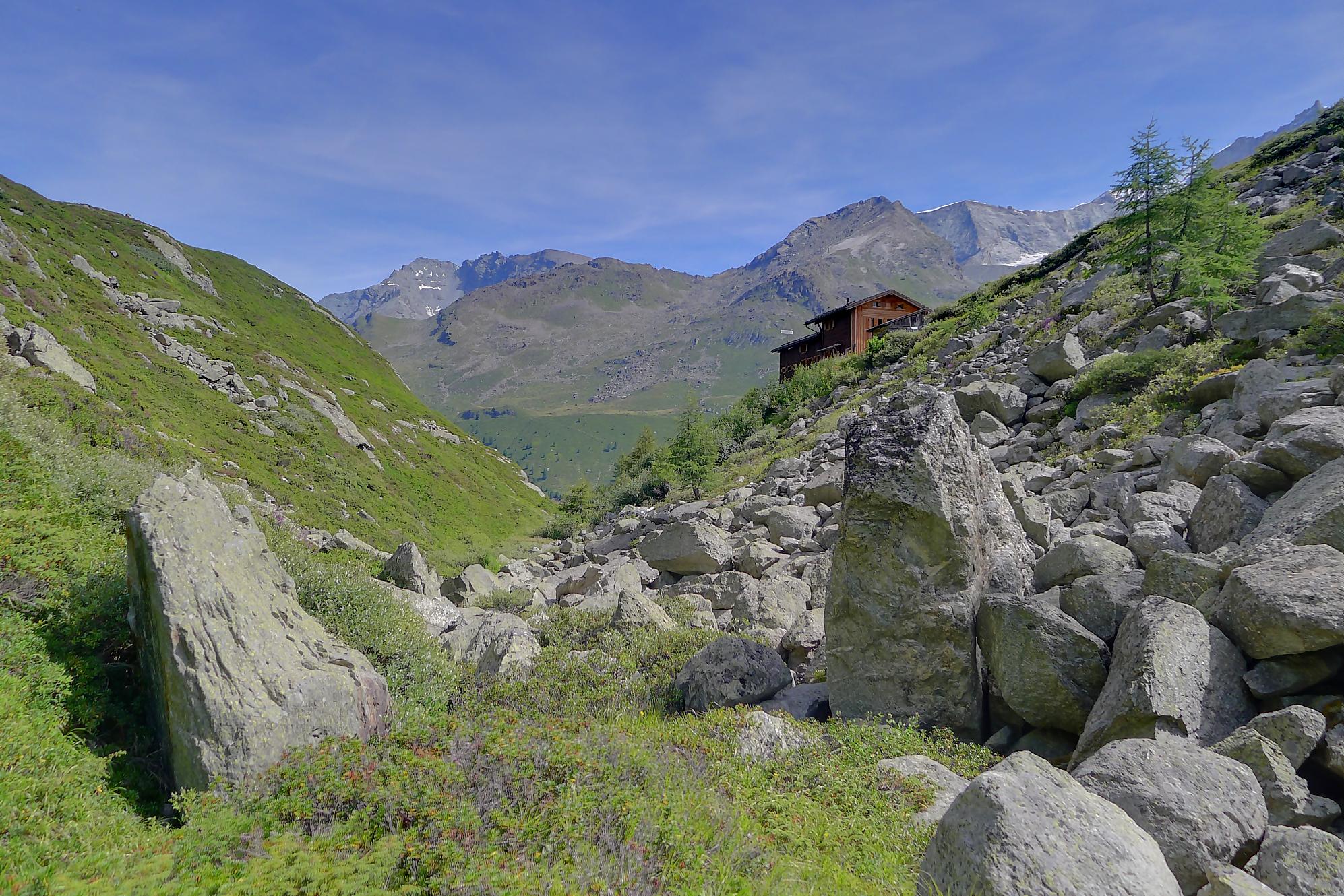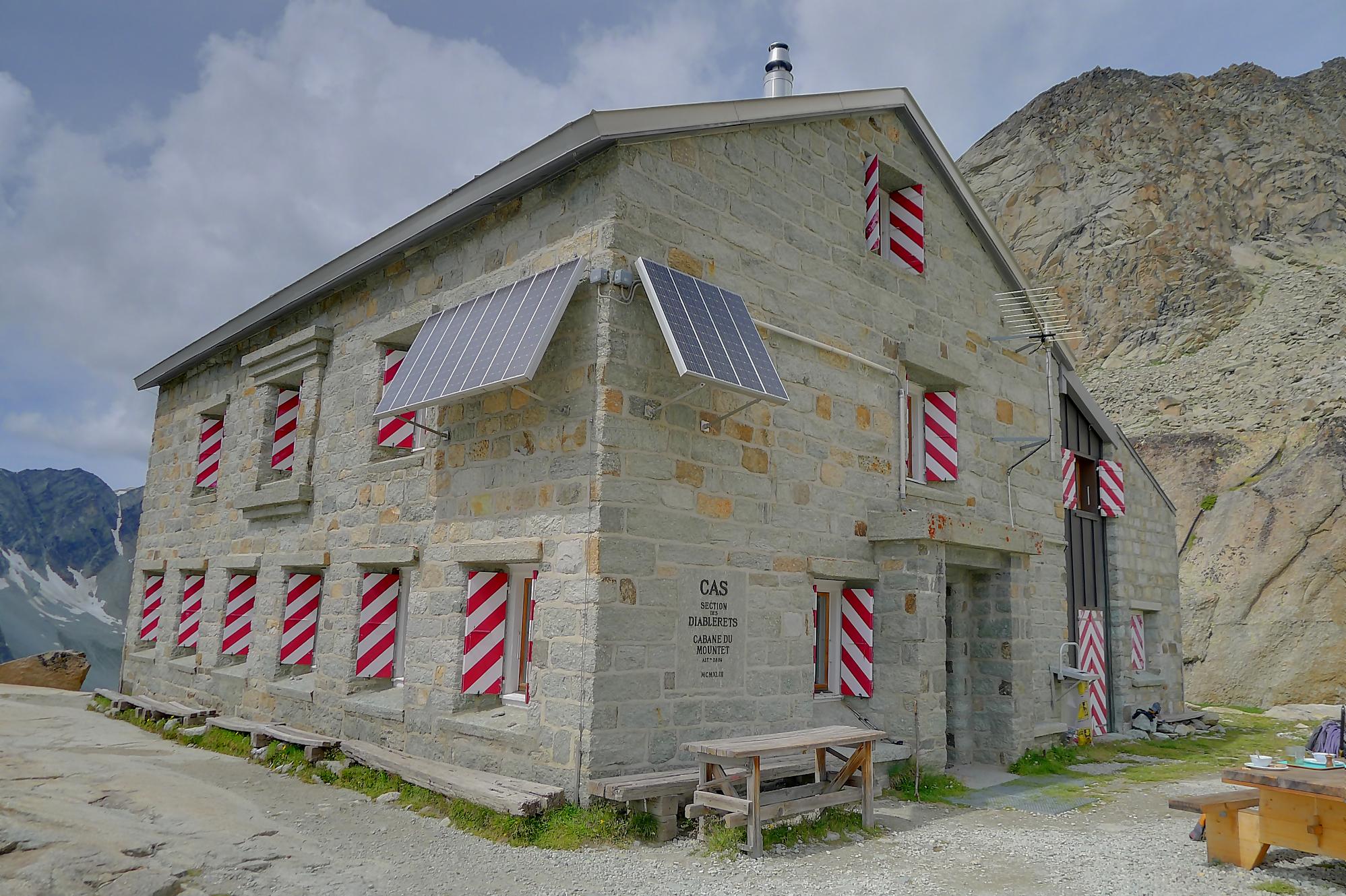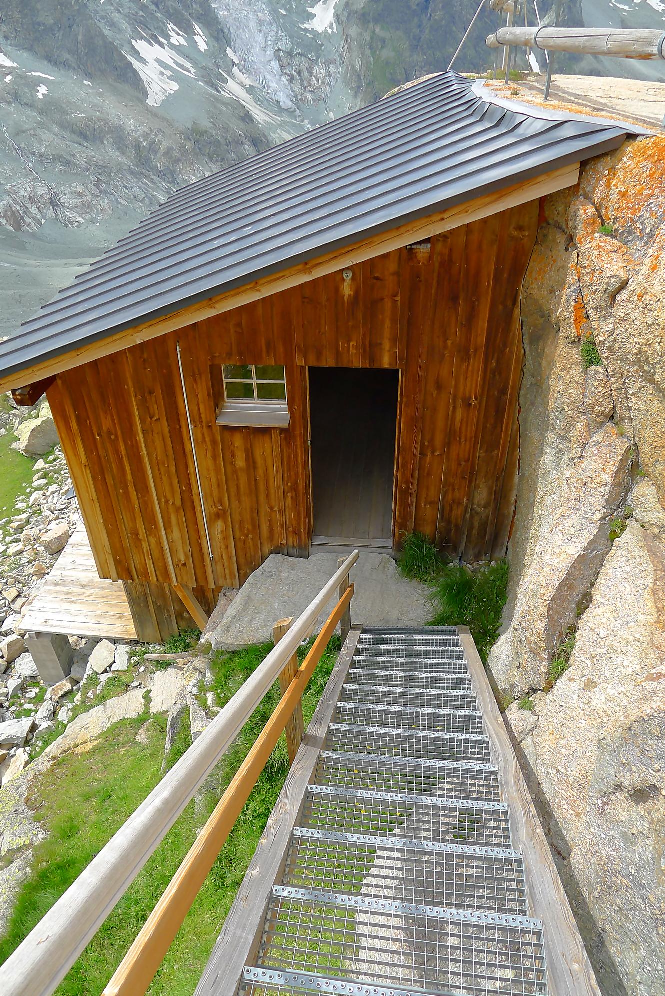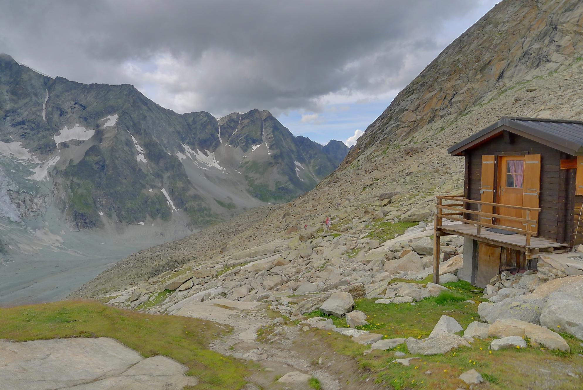 Ce chemin est bien sympathique et en pente régulière. Il y a plusieurs chaines que je ne peux que dédier aux touristes hollandais (mais utiles par temps humides). Vers le milieu du chemin on sort de la forêt et découvrons le massif du Besso. Une partie dans les rochers puis la dernière montée sur le reste d’une moraine, section courte, mais pentue. J’y dépasse plusieurs personnes qui ne semblaient pas apprécier à sa juste mesure l’effort. J’arrive à la cabane du Petit Mountet (2142m), à 11h20. En partant une autre personne exprimait sa grande lassitude. Cette cabane est donc pour touristes ! Je fais une petite pause et en profite pour visiter cette cabane qui a une douche !