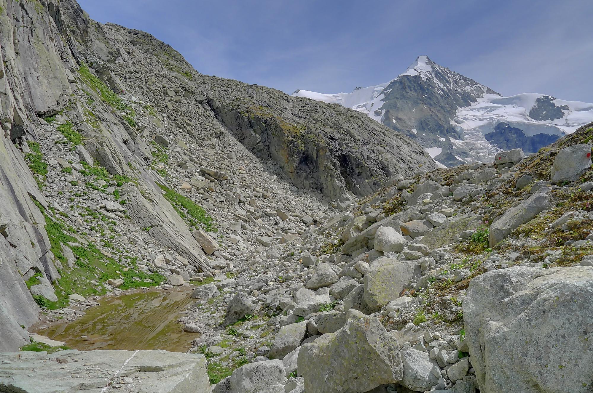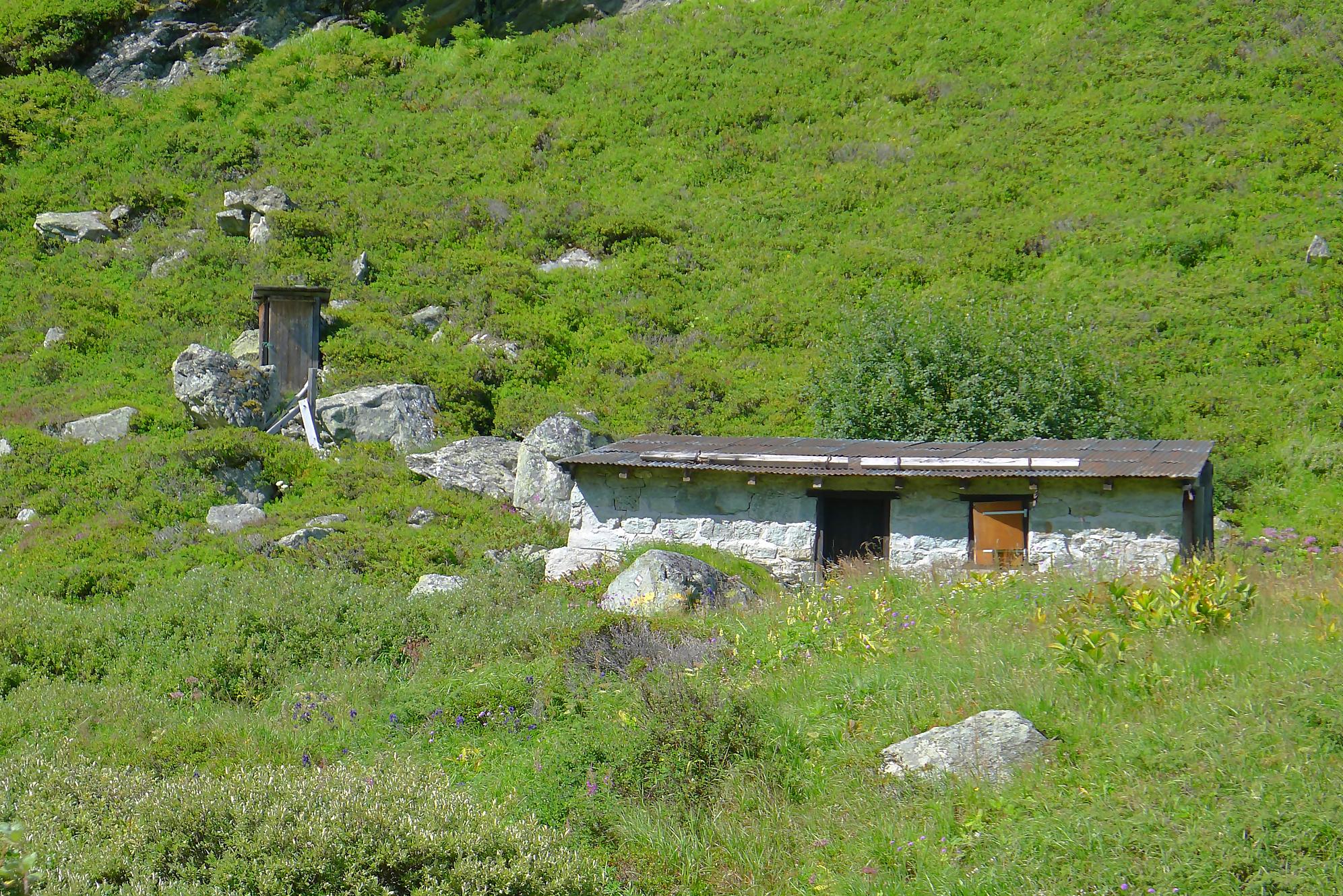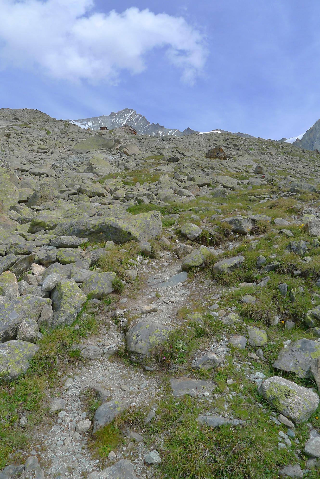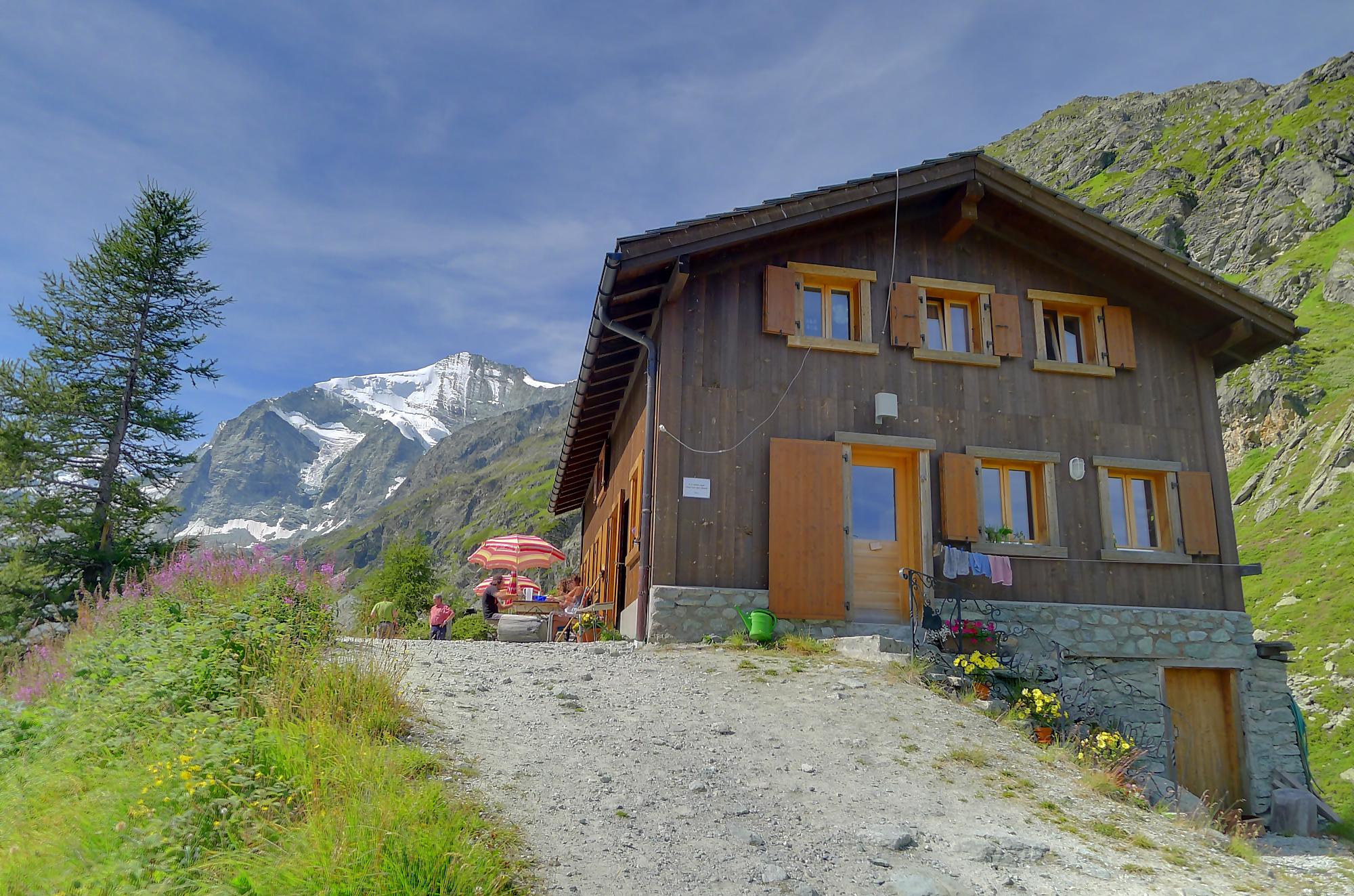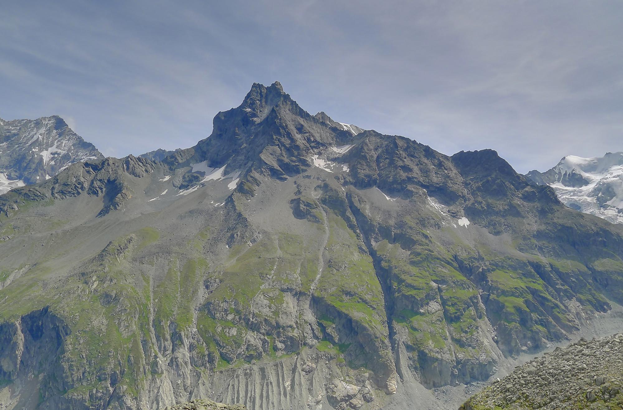 Ce chemin est bien sympathique et en pente régulière. Il y a plusieurs chaines que je ne peux que dédier aux touristes hollandais (mais utiles par temps humides). Vers le milieu du chemin on sort de la forêt et découvrons le massif du Besso. Une partie dans les rochers puis la dernière montée sur le reste d’une moraine, section courte, mais pentue. J’y dépasse plusieurs personnes qui ne semblaient pas apprécier à sa juste mesure l’effort. J’arrive à la cabane du Petit Mountet (2142m), à 11h20. En partant une autre personne exprimait sa grande lassitude. Cette cabane est donc pour touristes ! Je fais une petite pause et en profite pour visiter cette cabane qui a une douche !