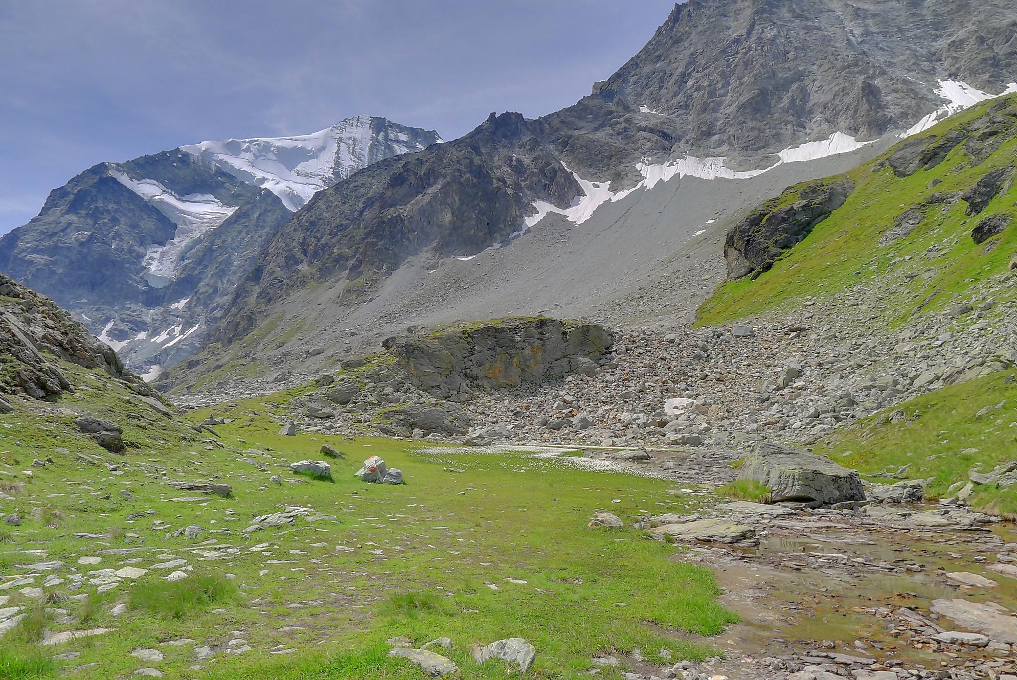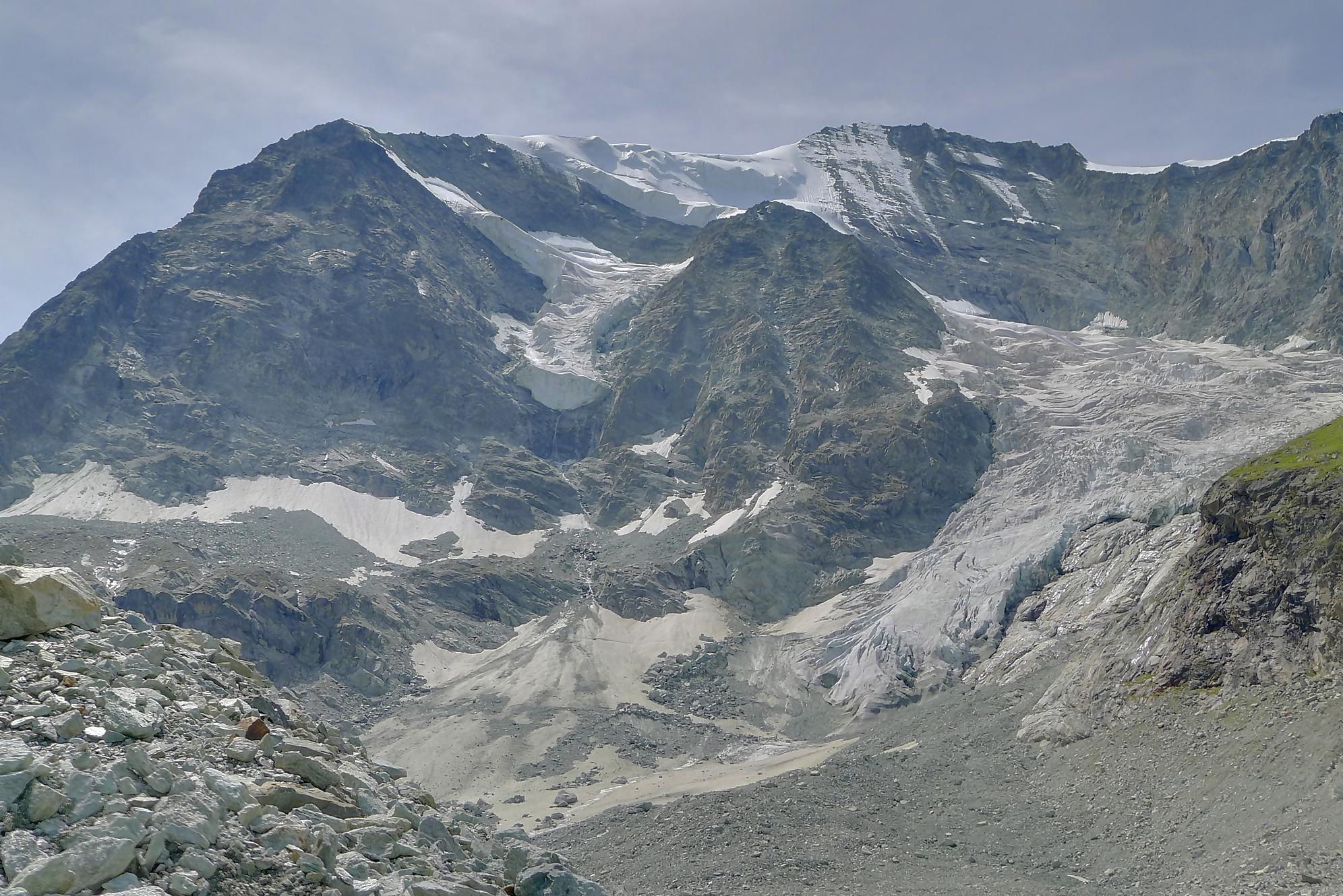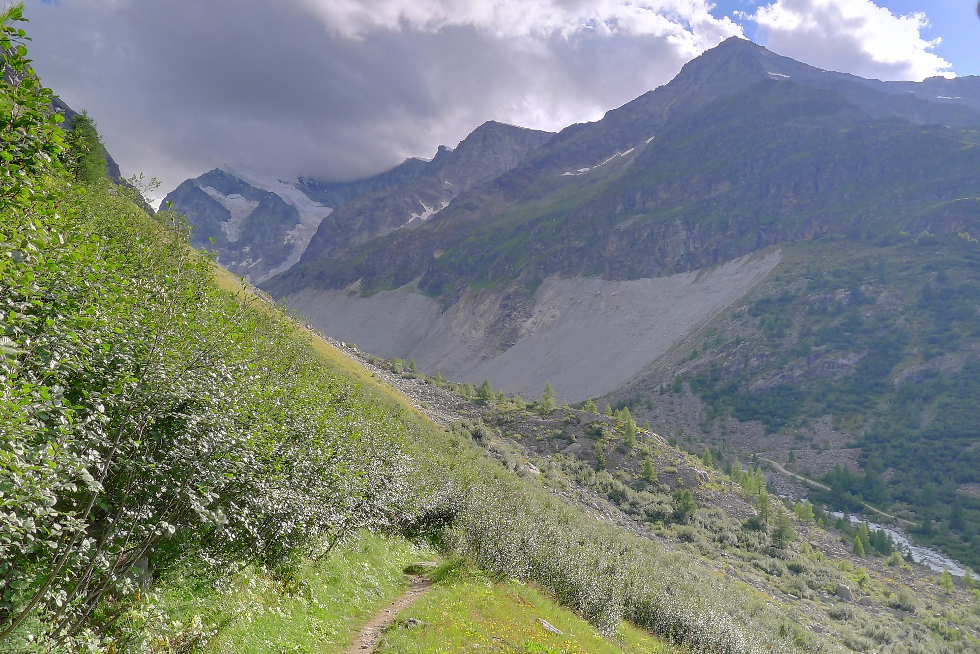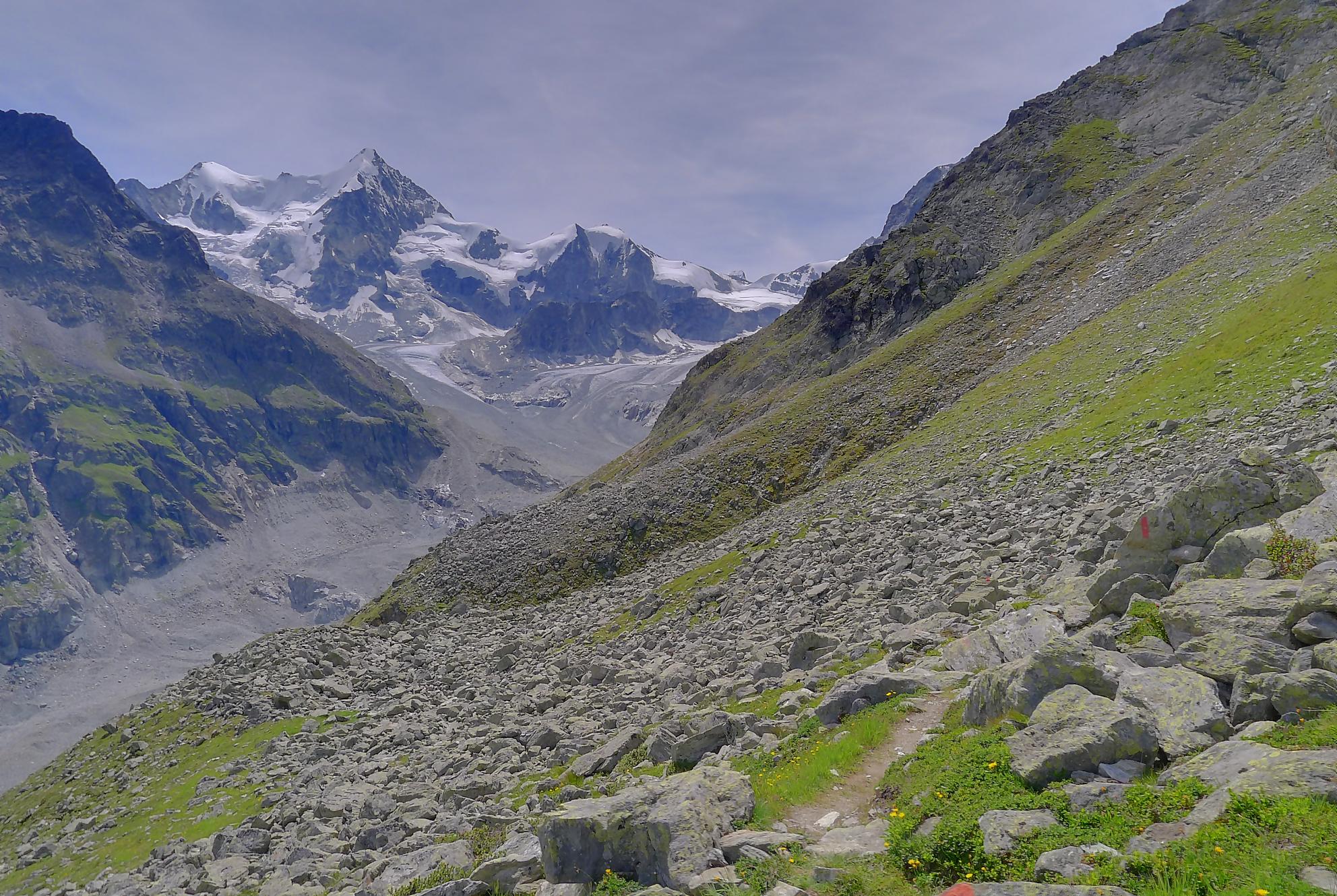 Ce chemin est bien sympathique et en pente régulière. Il y a plusieurs chaines que je ne peux que dédier aux touristes hollandais (mais utiles par temps humides). Vers le milieu du chemin on sort de la forêt et découvrons le massif du Besso. Une partie dans les rochers puis la dernière montée sur le reste d’une moraine, section courte, mais pentue. J’y dépasse plusieurs personnes qui ne semblaient pas apprécier à sa juste mesure l’effort. J’arrive à la cabane du Petit Mountet (2142m), à 11h20. En partant une autre personne exprimait sa grande lassitude. Cette cabane est donc pour touristes ! Je fais une petite pause et en profite pour visiter cette cabane qui a une douche !