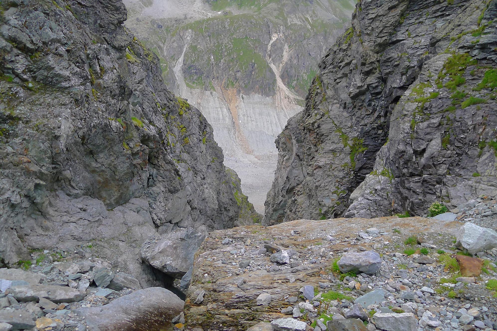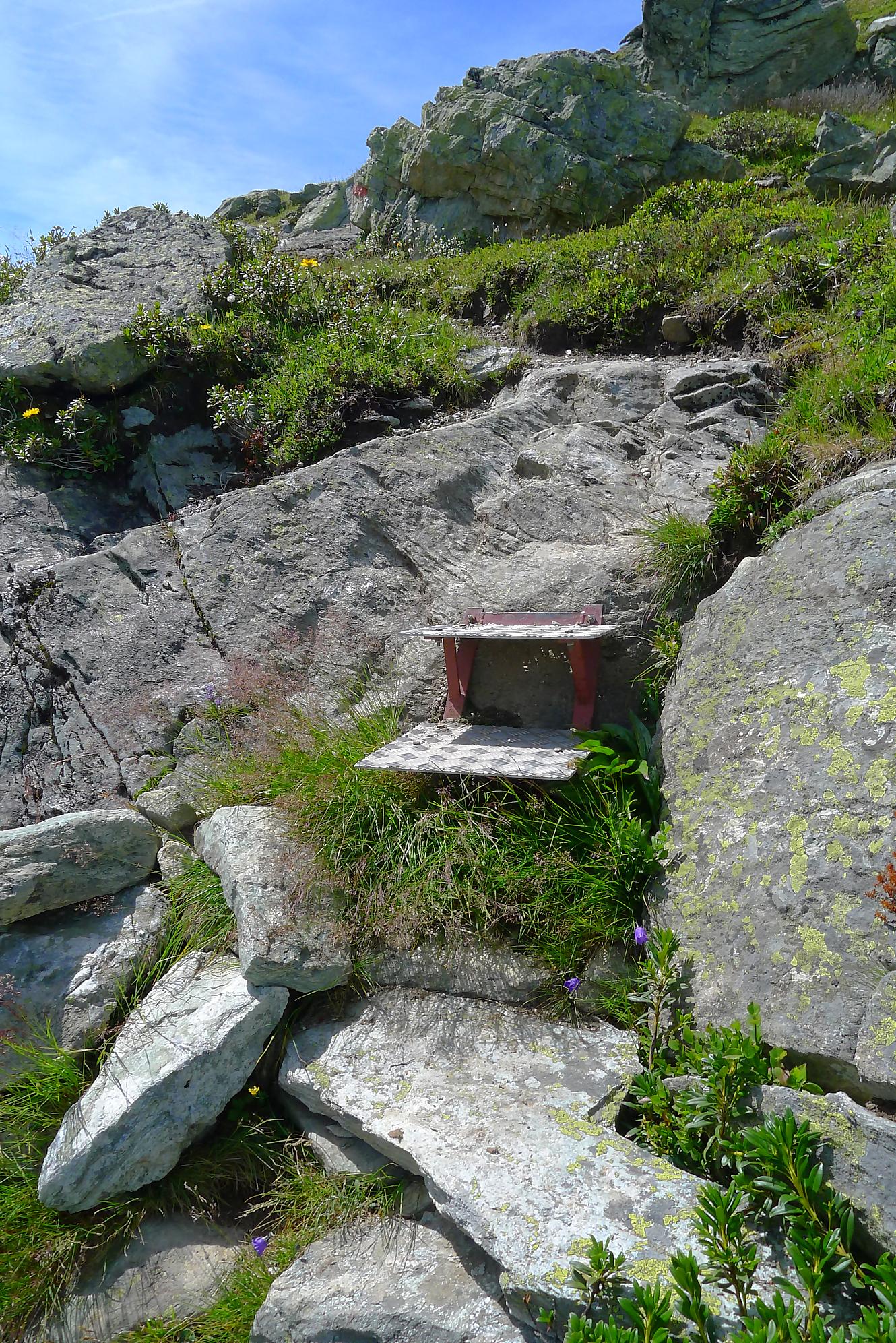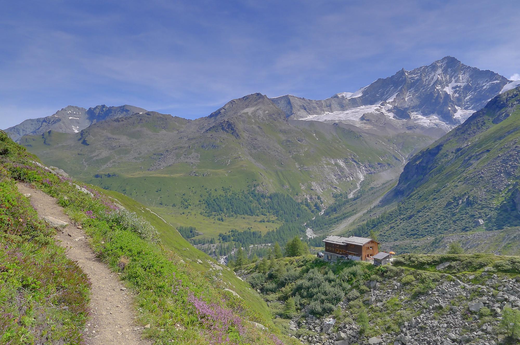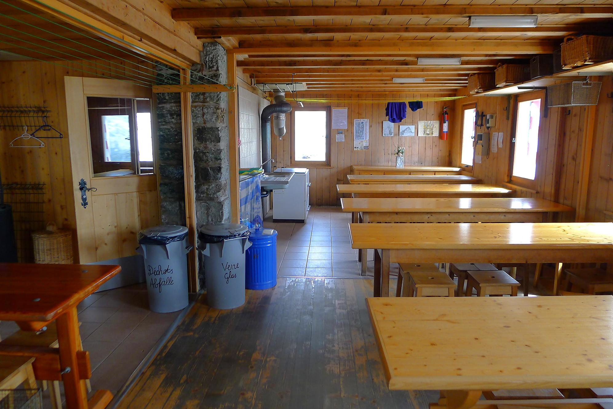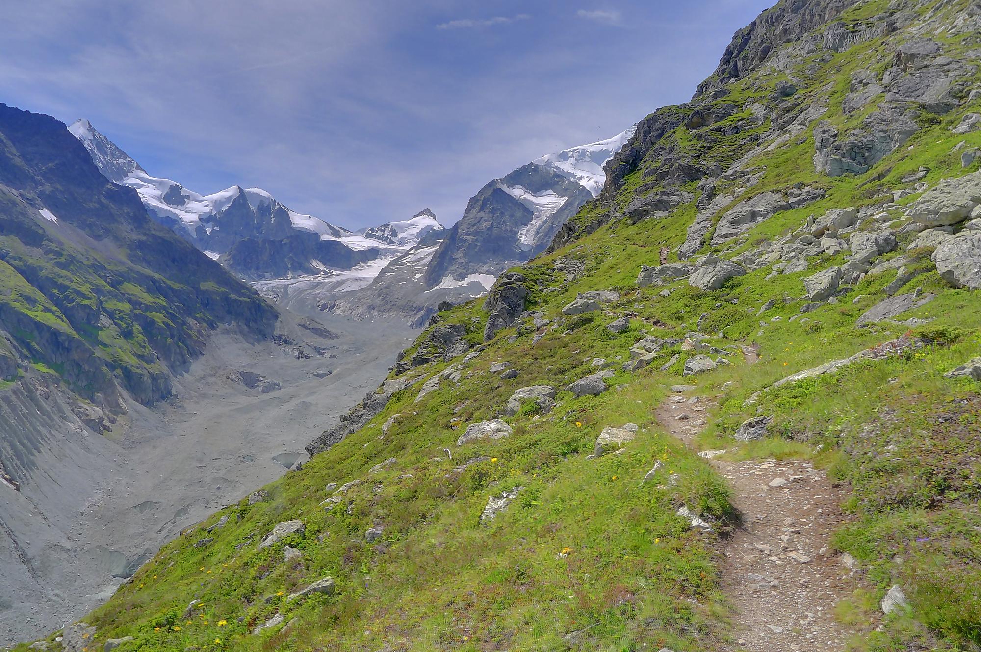 Ce chemin est bien sympathique et en pente régulière. Il y a plusieurs chaines que je ne peux que dédier aux touristes hollandais (mais utiles par temps humides). Vers le milieu du chemin on sort de la forêt et découvrons le massif du Besso. Une partie dans les rochers puis la dernière montée sur le reste d’une moraine, section courte, mais pentue. J’y dépasse plusieurs personnes qui ne semblaient pas apprécier à sa juste mesure l’effort. J’arrive à la cabane du Petit Mountet (2142m), à 11h20. En partant une autre personne exprimait sa grande lassitude. Cette cabane est donc pour touristes ! Je fais une petite pause et en profite pour visiter cette cabane qui a une douche !