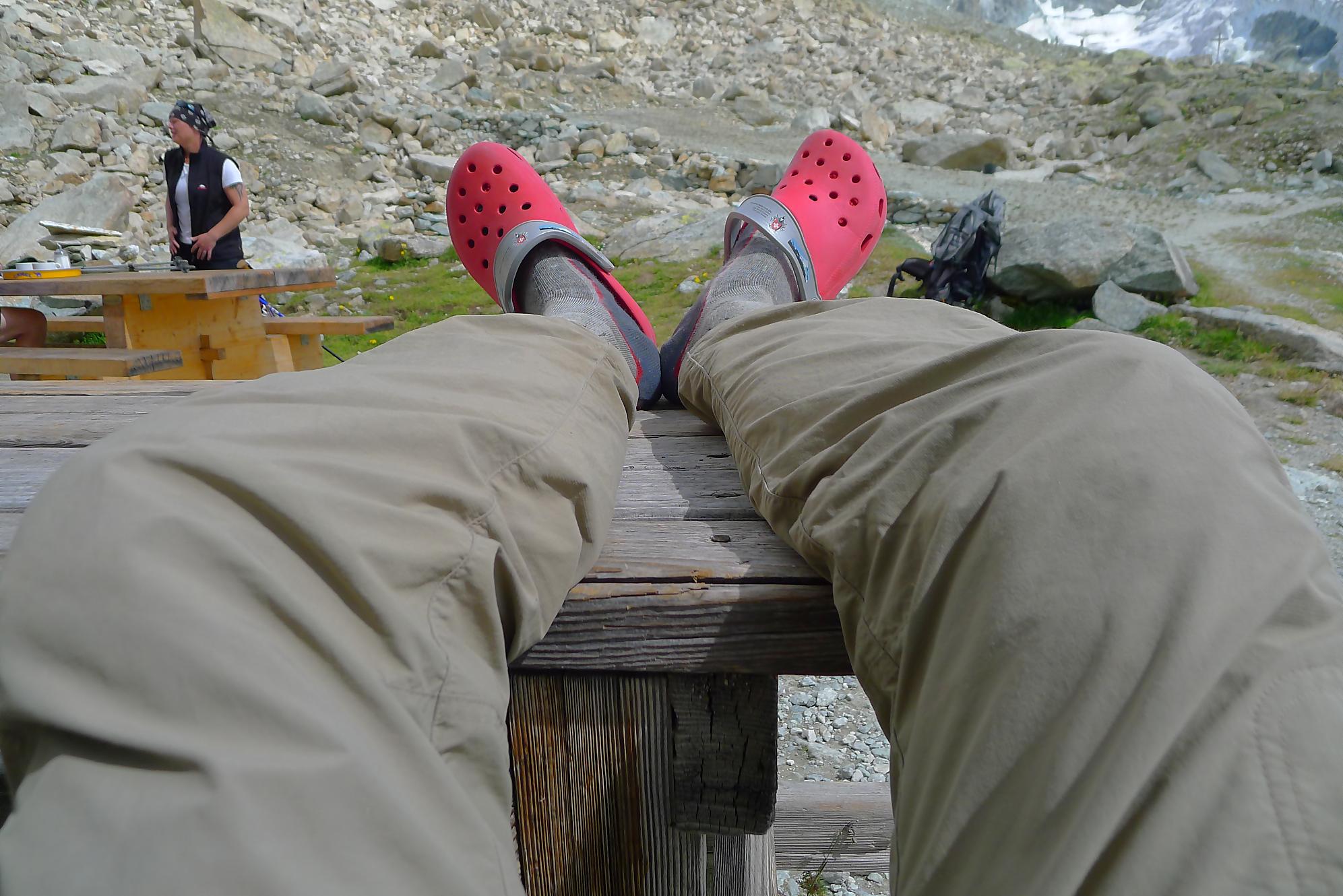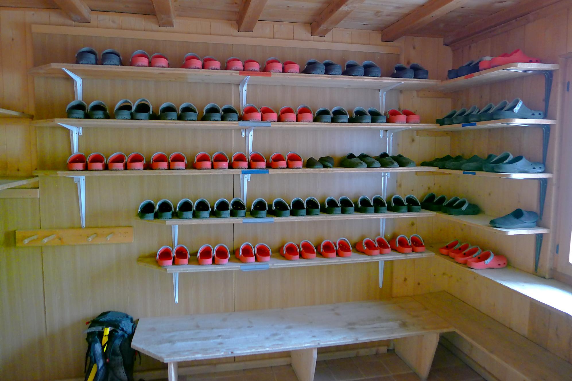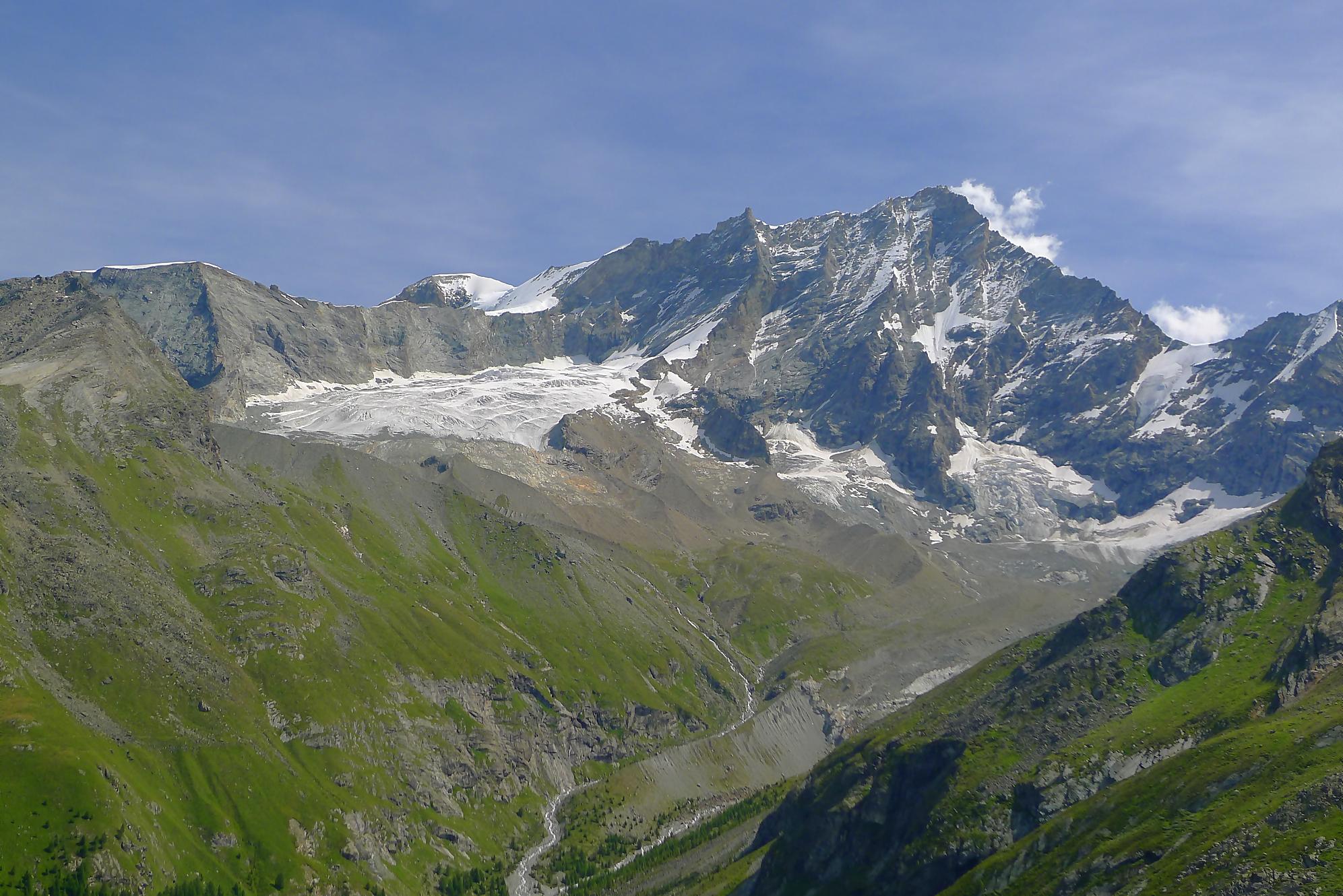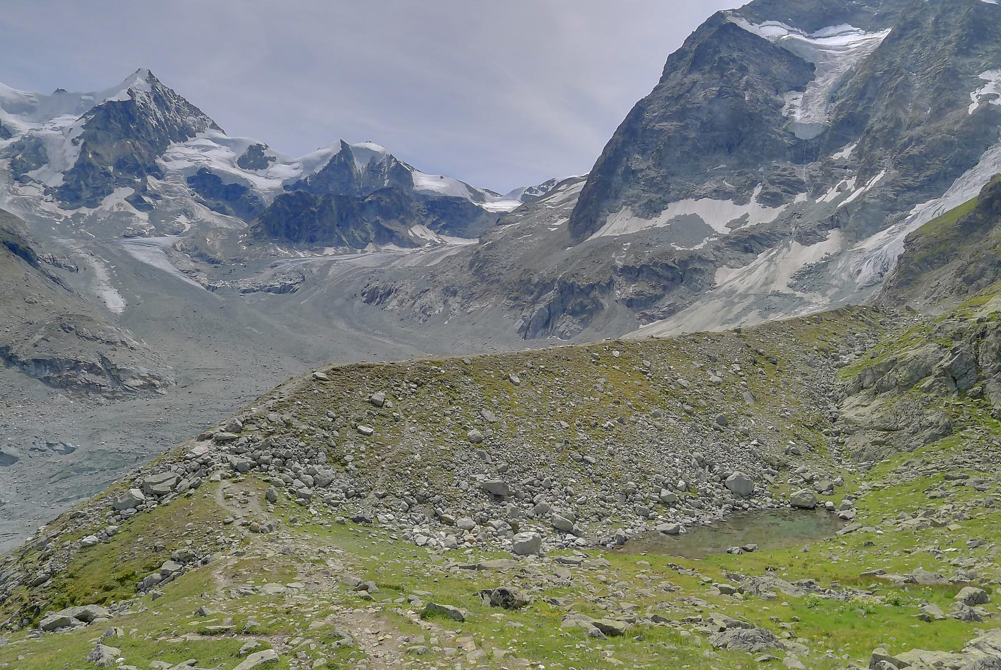 Ce chemin est bien sympathique et en pente régulière. Il y a plusieurs chaines que je ne peux que dédier aux touristes hollandais (mais utiles par temps humides). Vers le milieu du chemin on sort de la forêt et découvrons le massif du Besso. Une partie dans les rochers puis la dernière montée sur le reste d’une moraine, section courte, mais pentue. J’y dépasse plusieurs personnes qui ne semblaient pas apprécier à sa juste mesure l’effort. J’arrive à la cabane du Petit Mountet (2142m), à 11h20. En partant une autre personne exprimait sa grande lassitude. Cette cabane est donc pour touristes ! Je fais une petite pause et en profite pour visiter cette cabane qui a une douche !