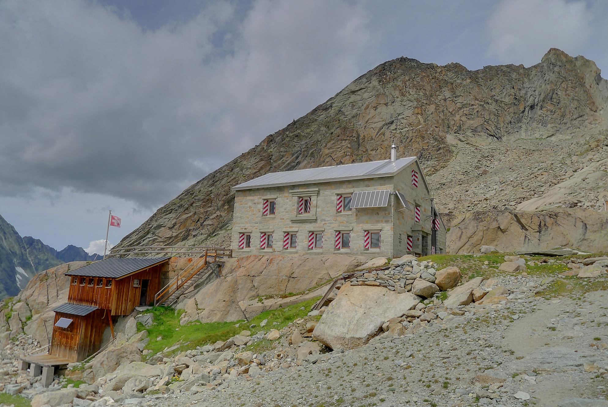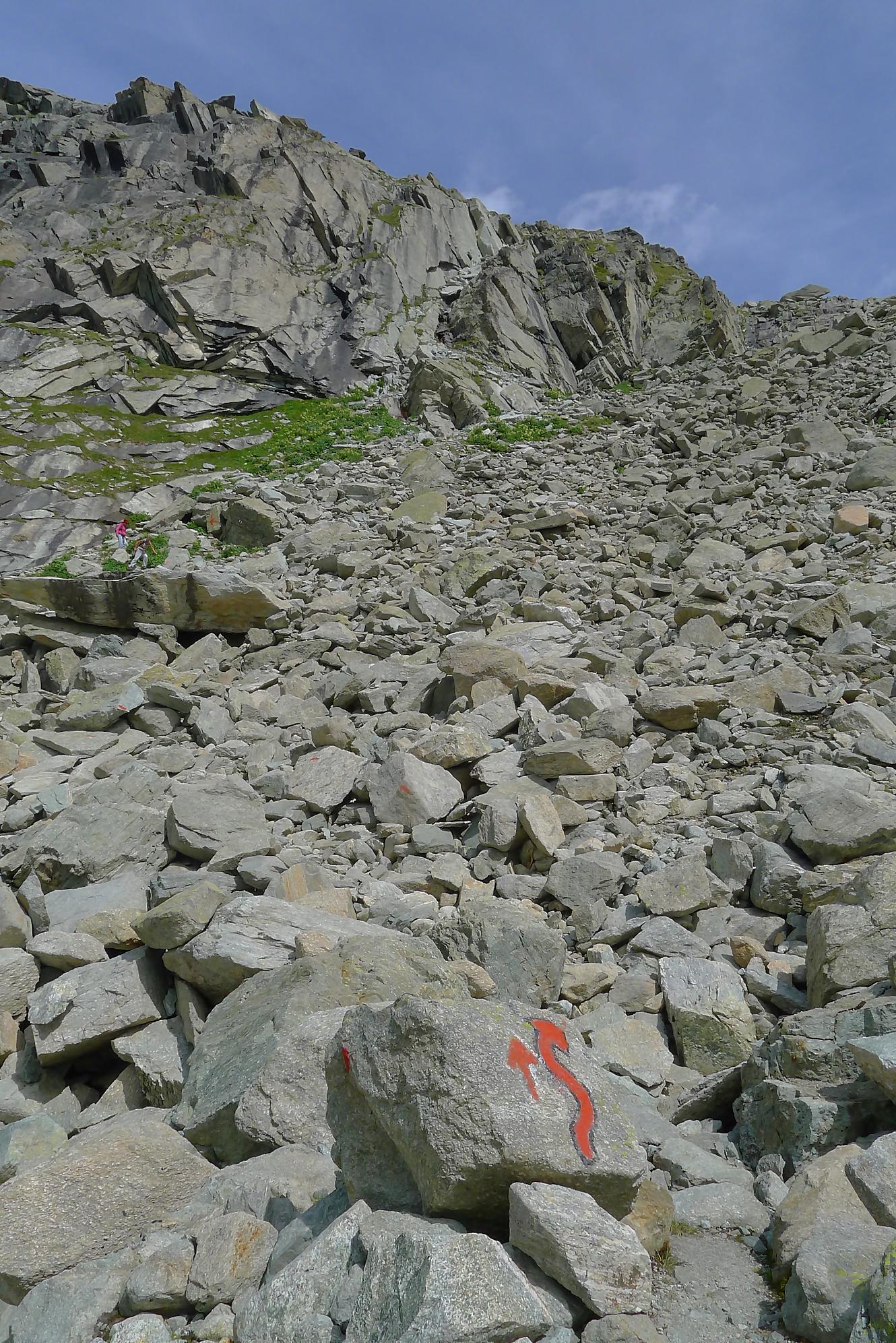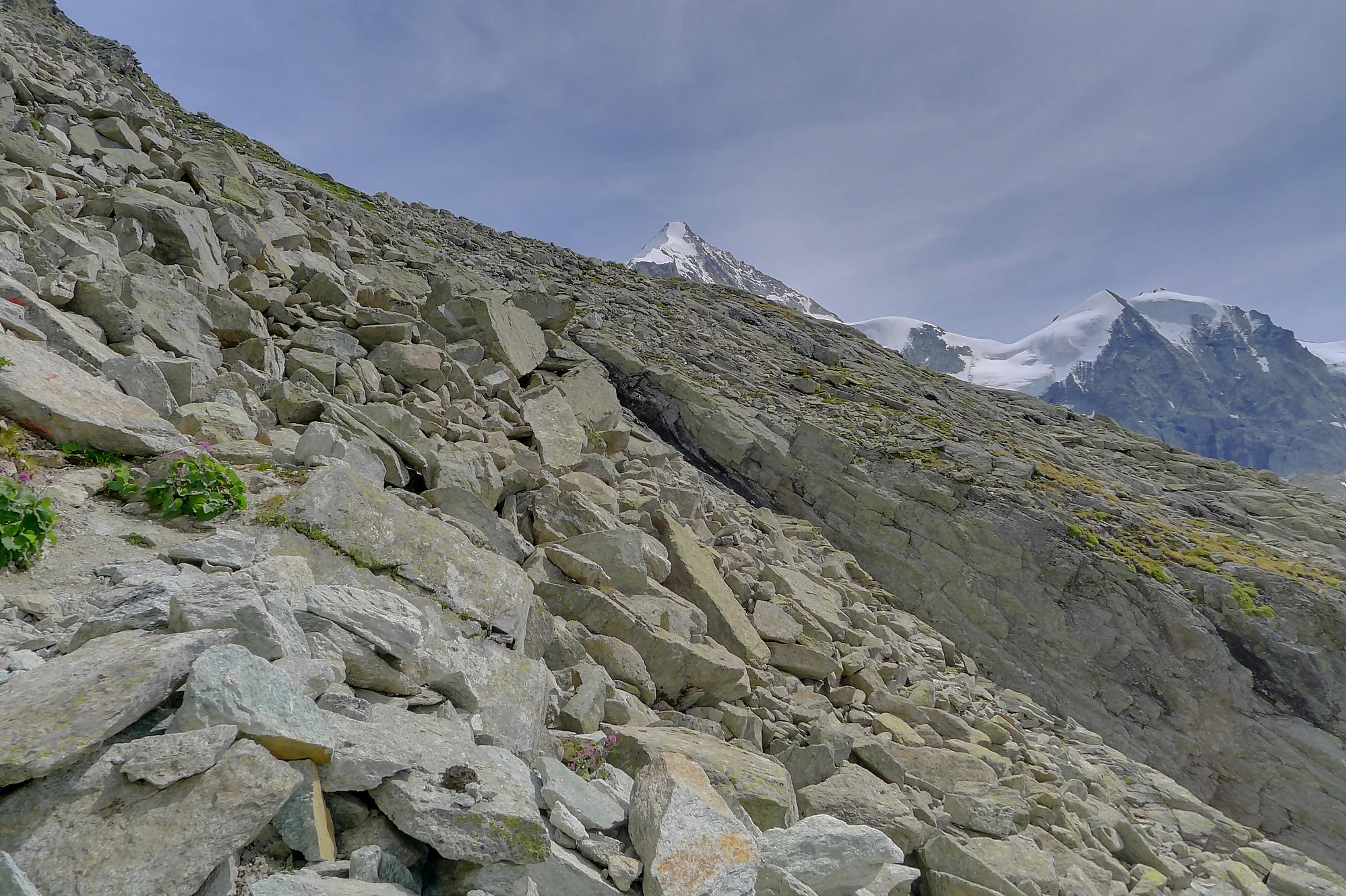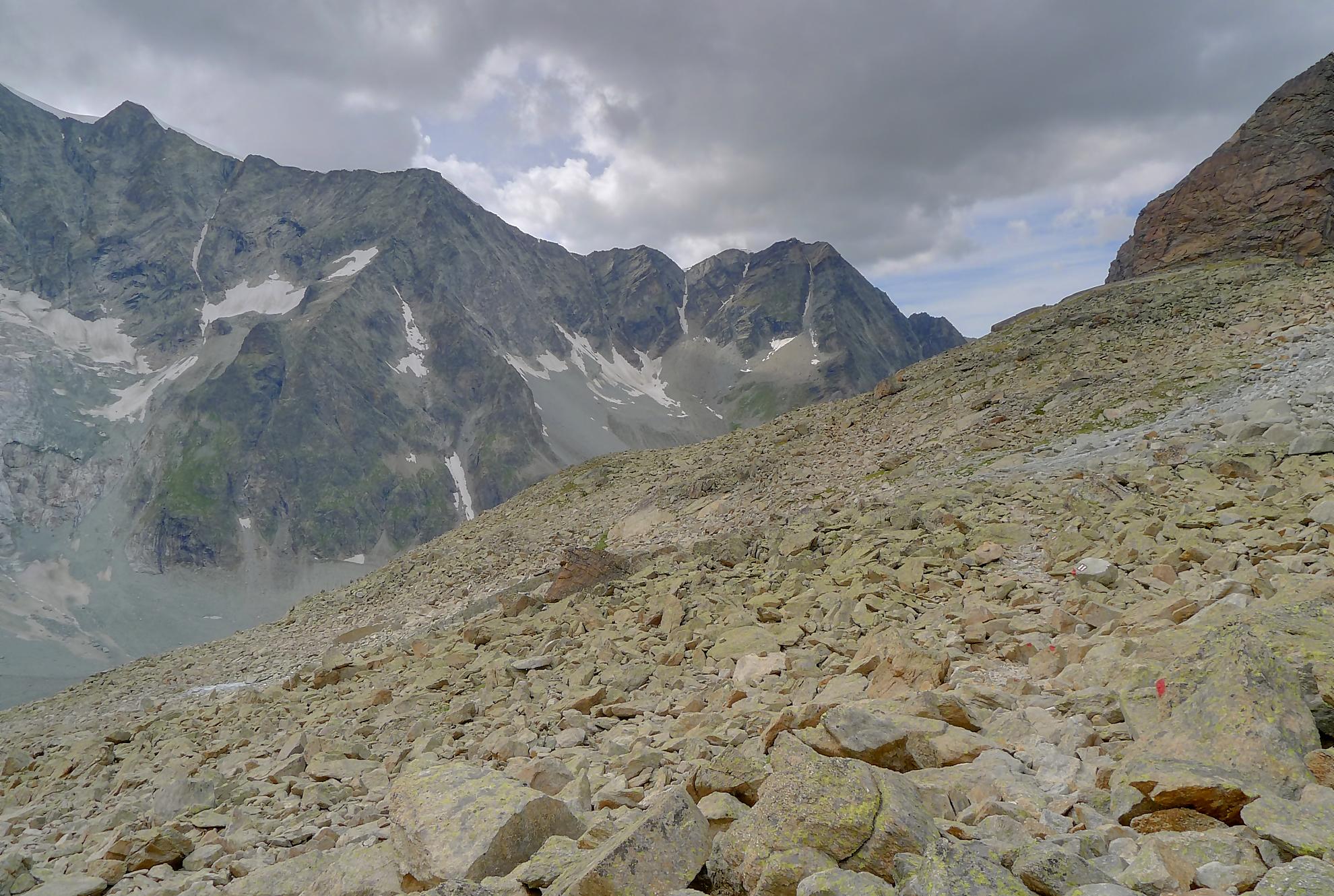 Puis arrive le morceau de bravoure, tel le monstre final dans les jeux vidéo. Il faut remonter la moraine (via le Pt2664). Pour faire simple, le chemin oscille entre pentu et raide, gravilloneux et parfois instable. Toute cette première section est équipée de cordes, je m’en suis parfois servi pour me tracter. La cabane n’est pas du tout visible et ne se découvre qu’à la fin. Le chemin retrouve une section calme puis retour dans les rochers pentus. On débouche sur le plateau de la cabane, qu’enfin on découvre, mais le chemin décidément très s’en va par le chemin des écoliers (sur la carte le chemin se dédouble sous la cabane et in situ le marquage rouge devenait incompréhensible car à profusion). Je passe devant une ruine (mentionnée sur la carte, ancienne cabane ?) et arrive à 14h45 à la cabane du Grand Mountet (2886m).