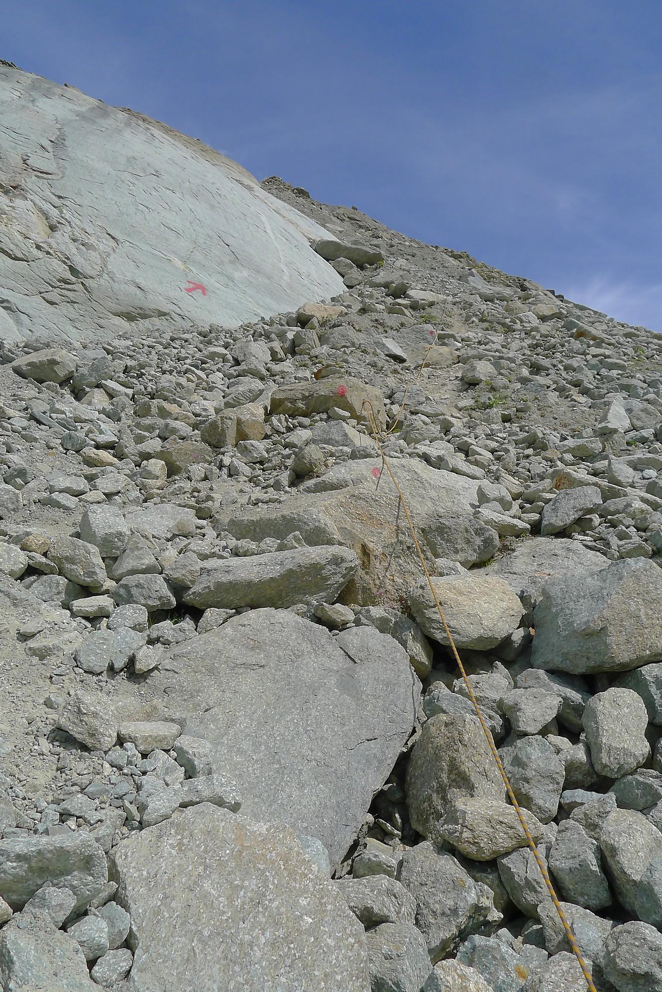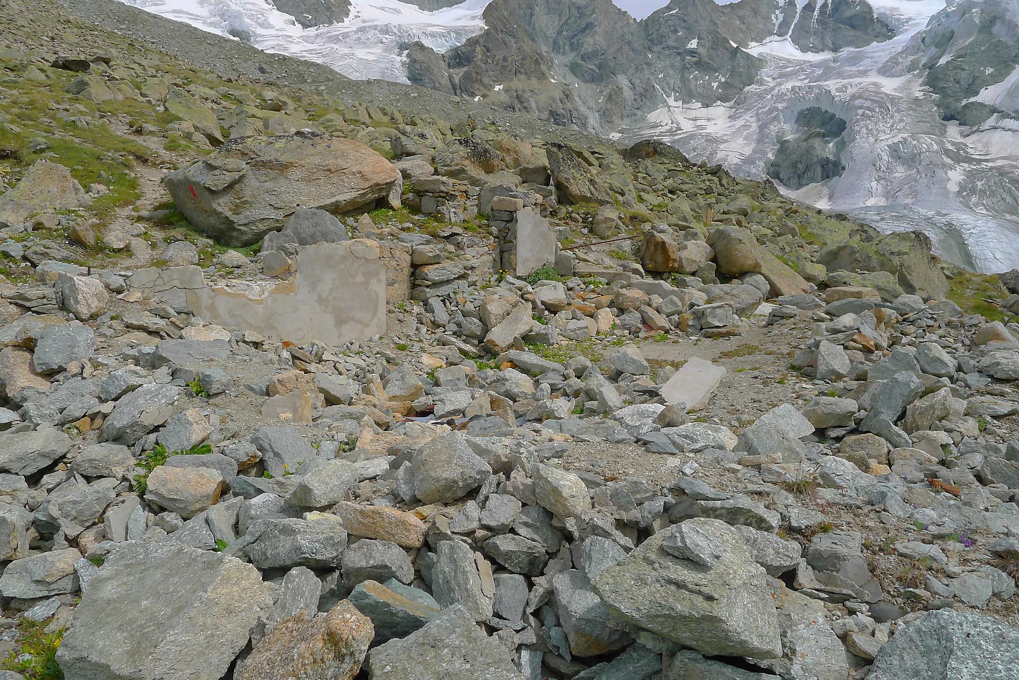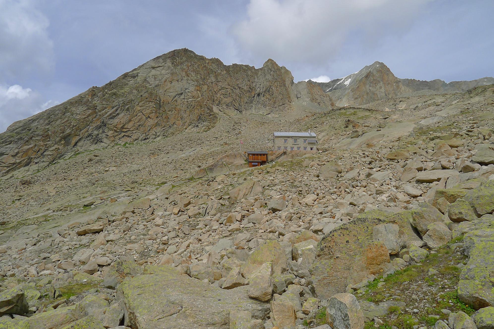 Puis arrive le morceau de bravoure, tel le monstre final dans les jeux vidéo. Il faut remonter la moraine (via le Pt2664). Pour faire simple, le chemin oscille entre pentu et raide, gravilloneux et parfois instable. Toute cette première section est équipée de cordes, je m’en suis parfois servi pour me tracter. La cabane n’est pas du tout visible et ne se découvre qu’à la fin. Le chemin retrouve une section calme puis retour dans les rochers pentus. On débouche sur le plateau de la cabane, qu’enfin on découvre, mais le chemin décidément très s’en va par le chemin des écoliers (sur la carte le chemin se dédouble sous la cabane et in situ le marquage rouge devenait incompréhensible car à profusion). Je passe devant une ruine (mentionnée sur la carte, ancienne cabane ?) et arrive à 14h45 à la cabane du Grand Mountet (2886m).
