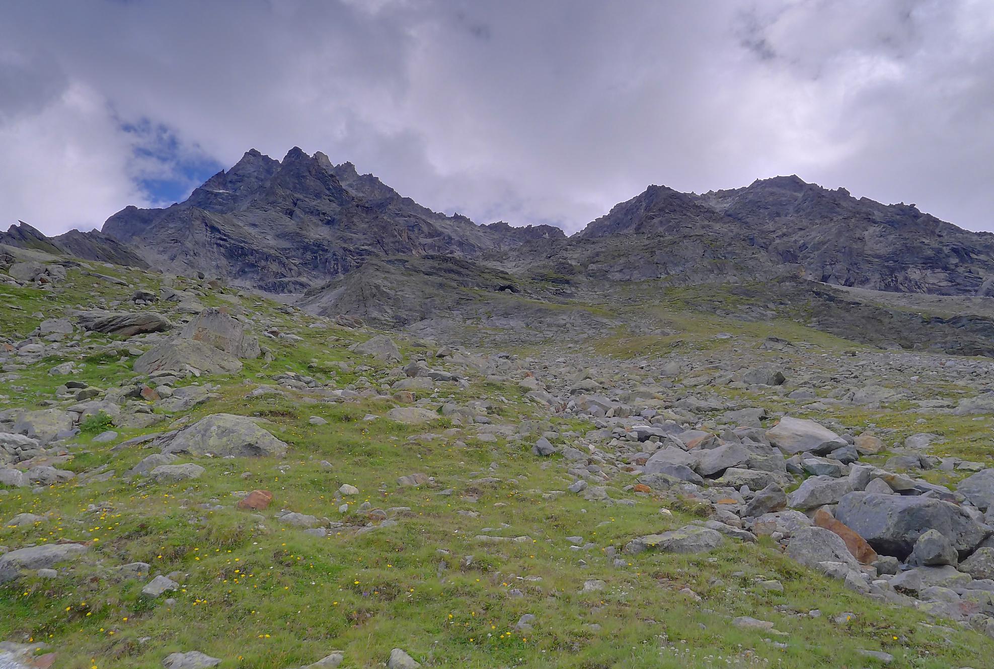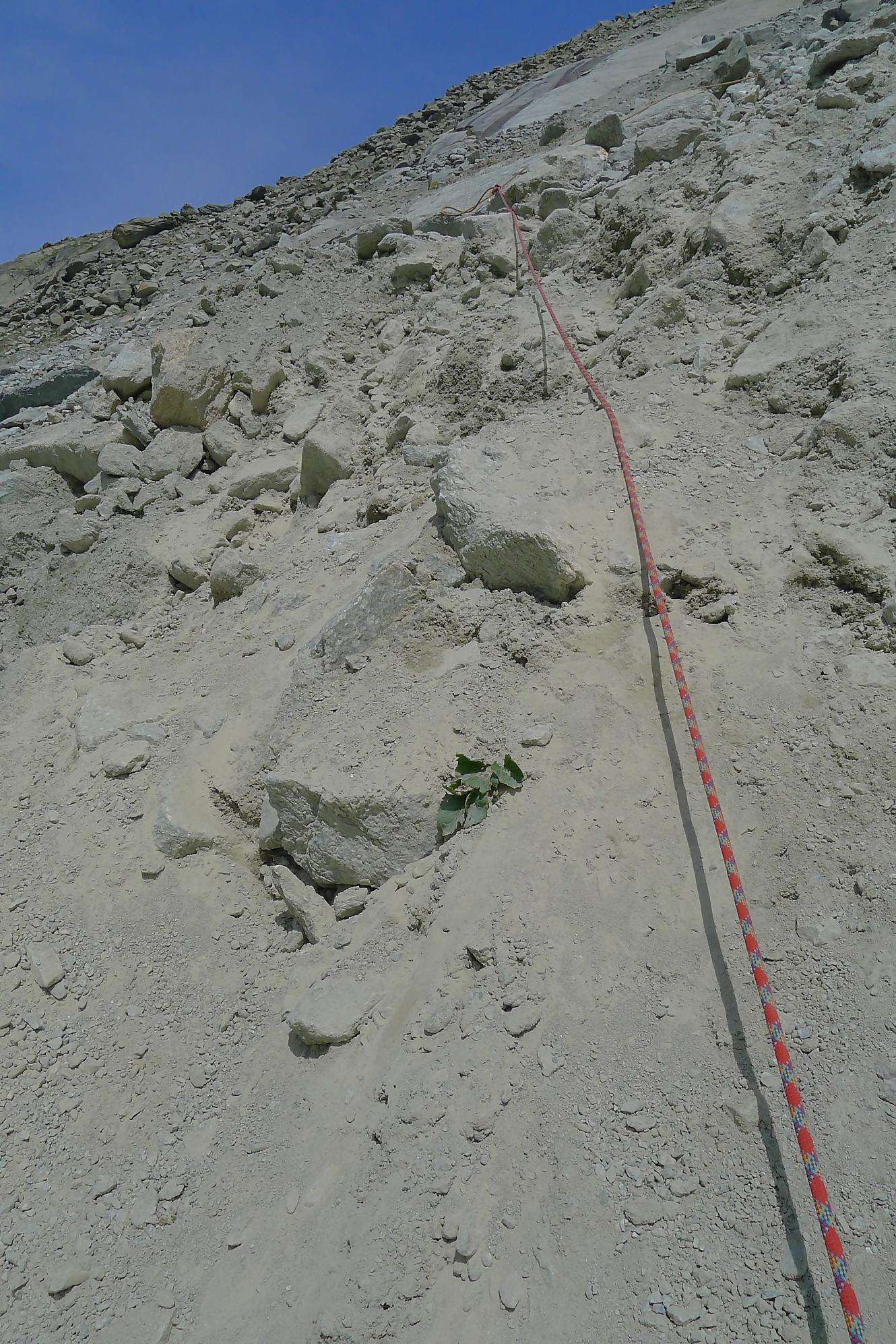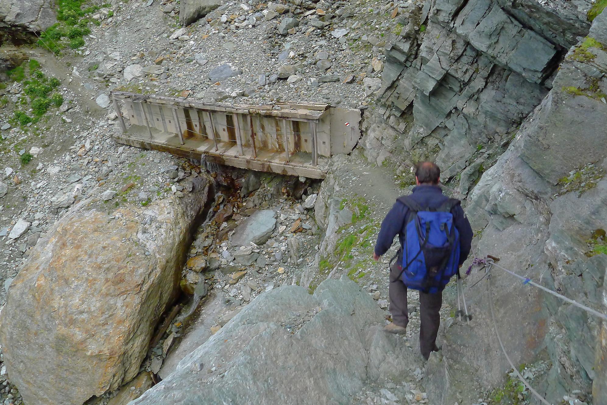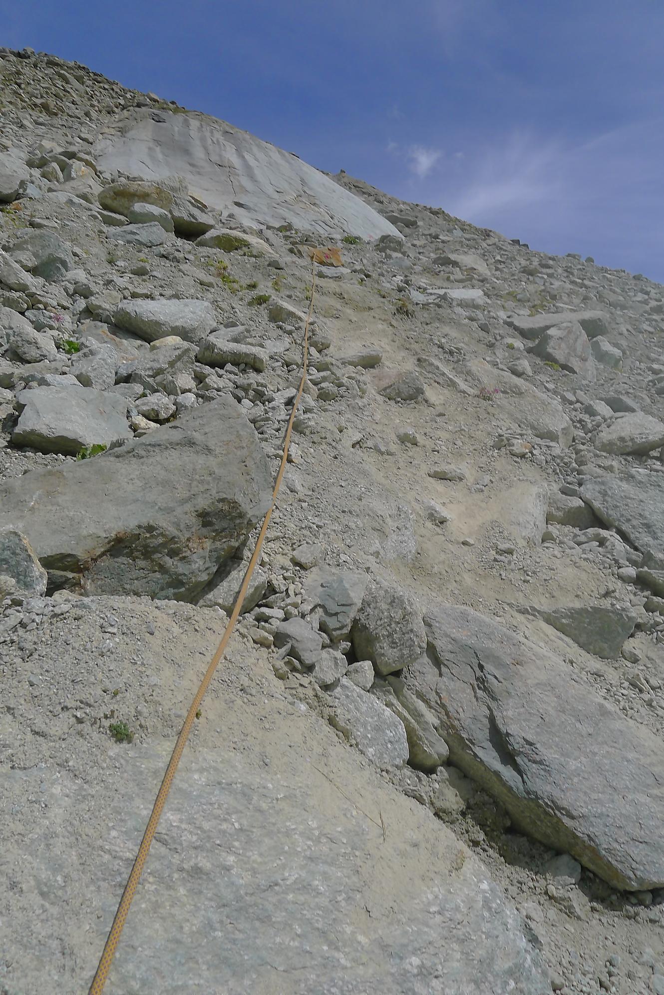 Puis arrive le morceau de bravoure, tel le monstre final dans les jeux vidéo. Il faut remonter la moraine (via le Pt2664). Pour faire simple, le chemin oscille entre pentu et raide, gravilloneux et parfois instable. Toute cette première section est équipée de cordes, je m’en suis parfois servi pour me tracter. La cabane n’est pas du tout visible et ne se découvre qu’à la fin. Le chemin retrouve une section calme puis retour dans les rochers pentus. On débouche sur le plateau de la cabane, qu’enfin on découvre, mais le chemin décidément très s’en va par le chemin des écoliers (sur la carte le chemin se dédouble sous la cabane et in situ le marquage rouge devenait incompréhensible car à profusion). Je passe devant une ruine (mentionnée sur la carte, ancienne cabane ?) et arrive à 14h45 à la cabane du Grand Mountet (2886m).