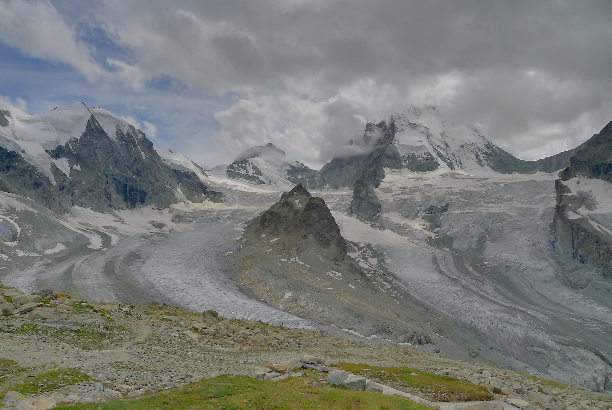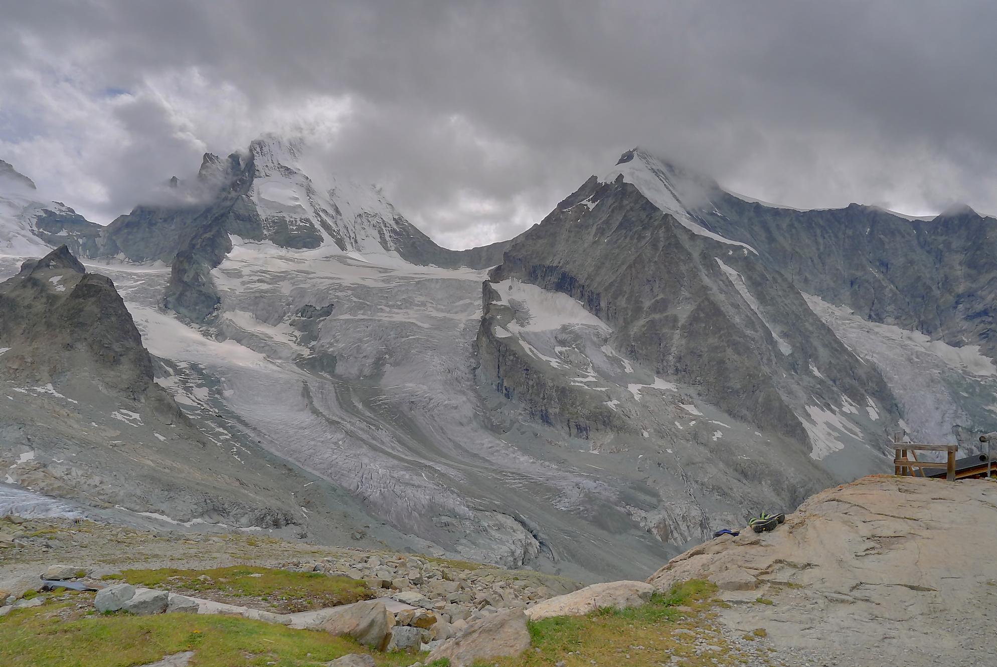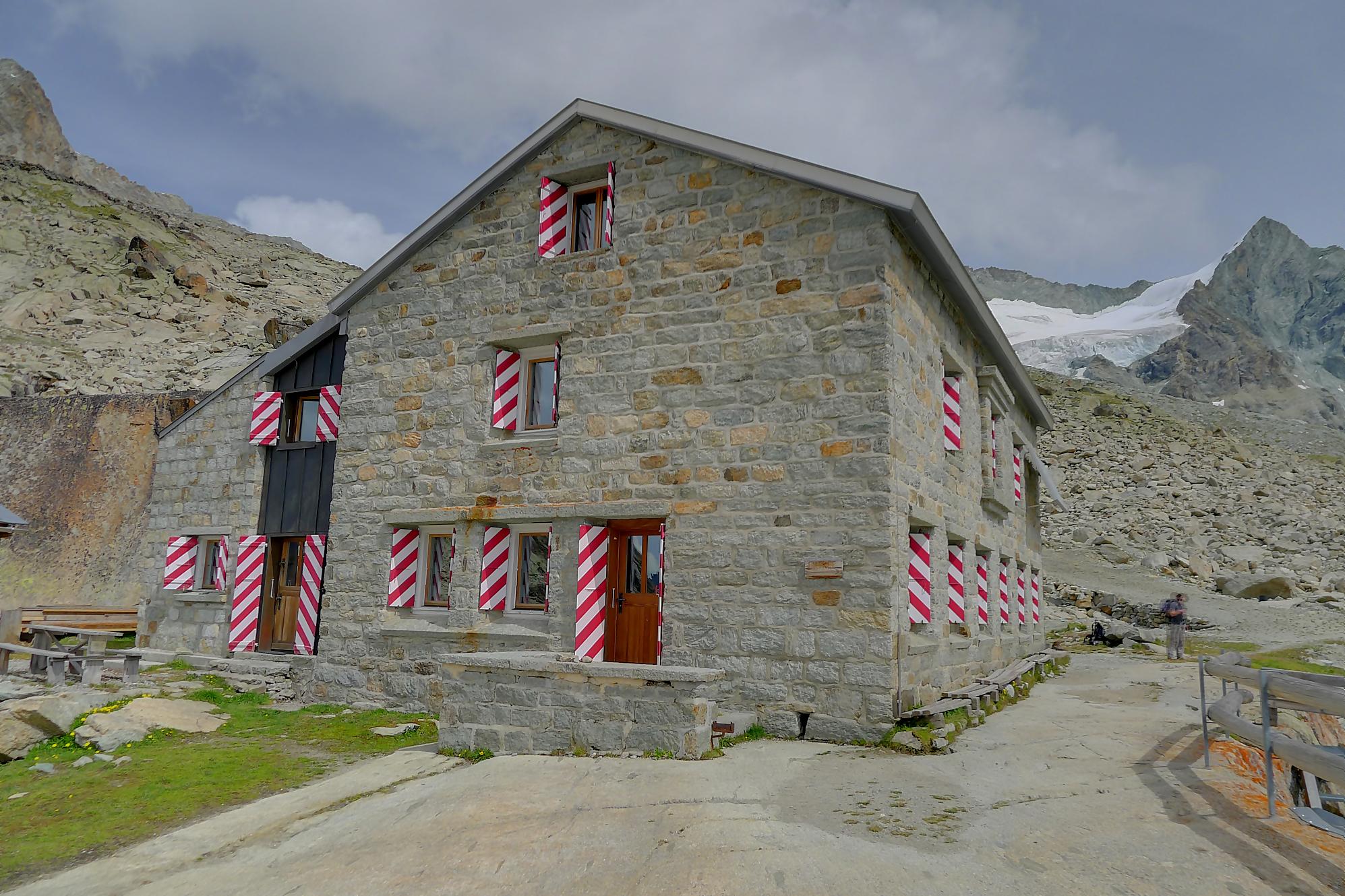 Après une visite photographique de la cabane, je fus réjouis d’avaler mon casse-croute qui pour la première fois fut insuffisant. Peu avant de partir je revois, le guide Daniel Ruppen avec qui j’ai fait le Bishorn. Cette cabane est fréquentée par des alpinistes en grosses chaussures, corde et piolet sur le sac. Je me sentais presque un touriste avec seulement mon sac à dos ! La météo s’est bouchée pendant ma pause, juste eu le temps de prendre un panorama. La vue est belle sur la Couronne Impériale avec Roc Noir en son centre.