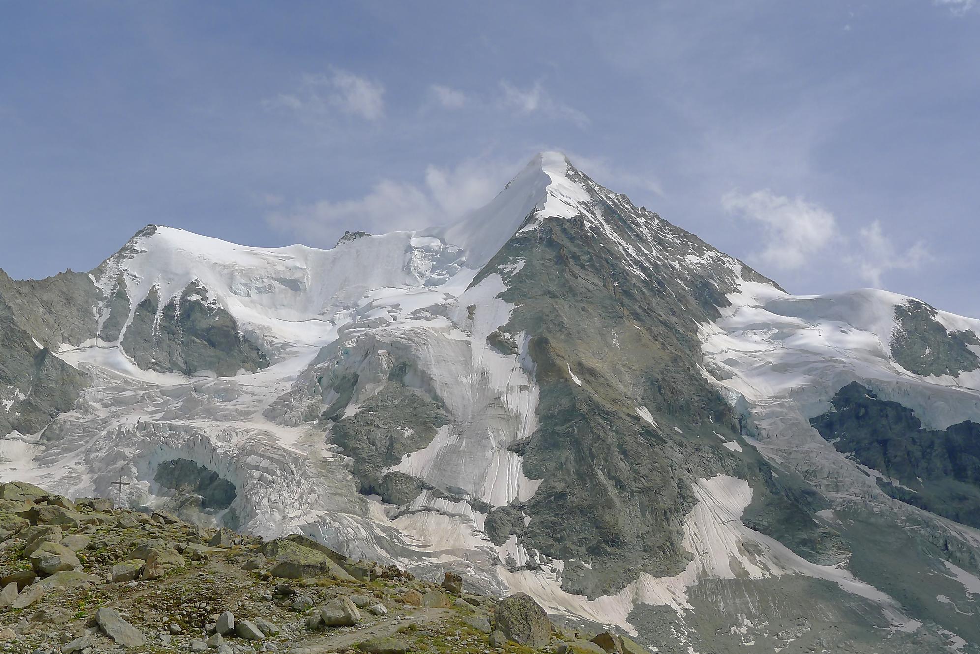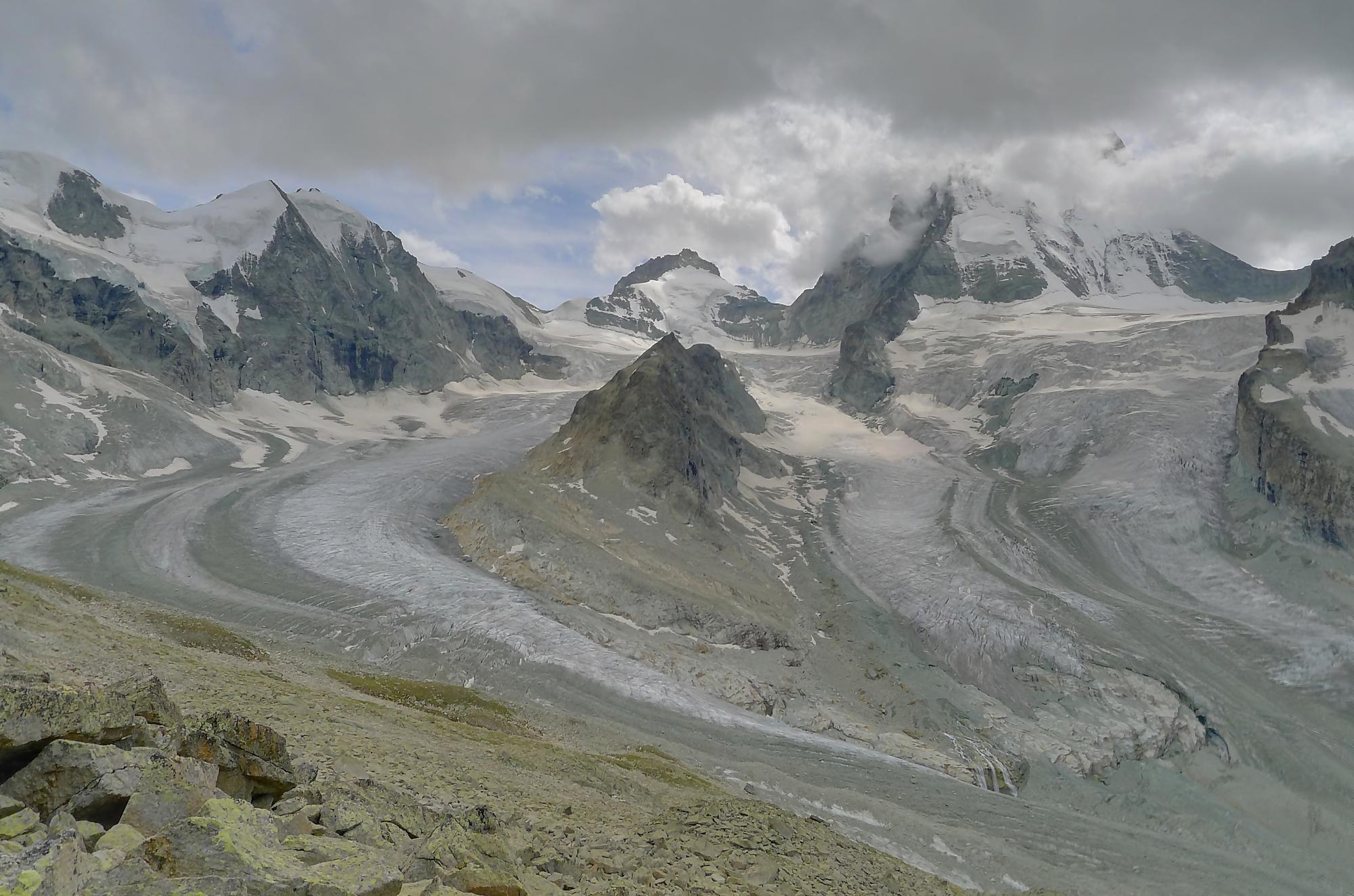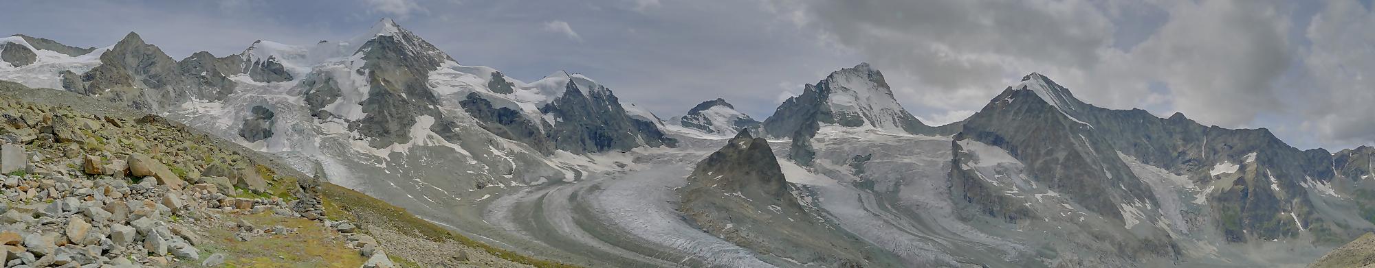 Après une visite photographique de la cabane, je fus réjouis d’avaler mon casse-croute qui pour la première fois fut insuffisant. Peu avant de partir je revois, le guide Daniel Ruppen avec qui j’ai fait le Bishorn. Cette cabane est fréquentée par des alpinistes en grosses chaussures, corde et piolet sur le sac. Je me sentais presque un touriste avec seulement mon sac à dos ! La météo s’est bouchée pendant ma pause, juste eu le temps de prendre un panorama. La vue est belle sur la Couronne Impériale avec Roc Noir en son centre.