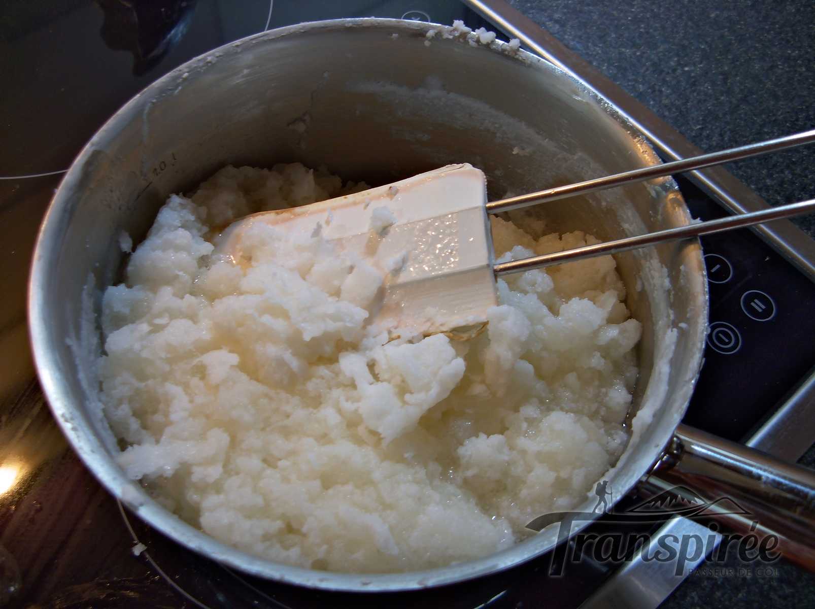 J’enfile les gants et les lunettes, je pèse l’huile de coco (cela donne un savon qui mousse beaucoup, par contre je n’ai pas encore cette huile en bio !). Grâce à ce tableur (version OpenOffice), j’obtiens les quantités d’eau et de soude, pour un savon surgras à 5% (donc 5% de l’huile ne sera pas saponifiée, cela permet d’avoir une marge avec la soude et surgras, c’est bon pour la peau !).
